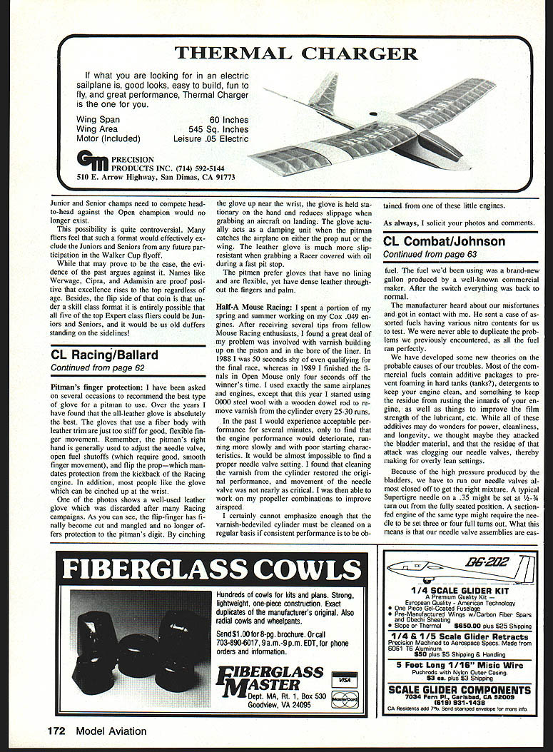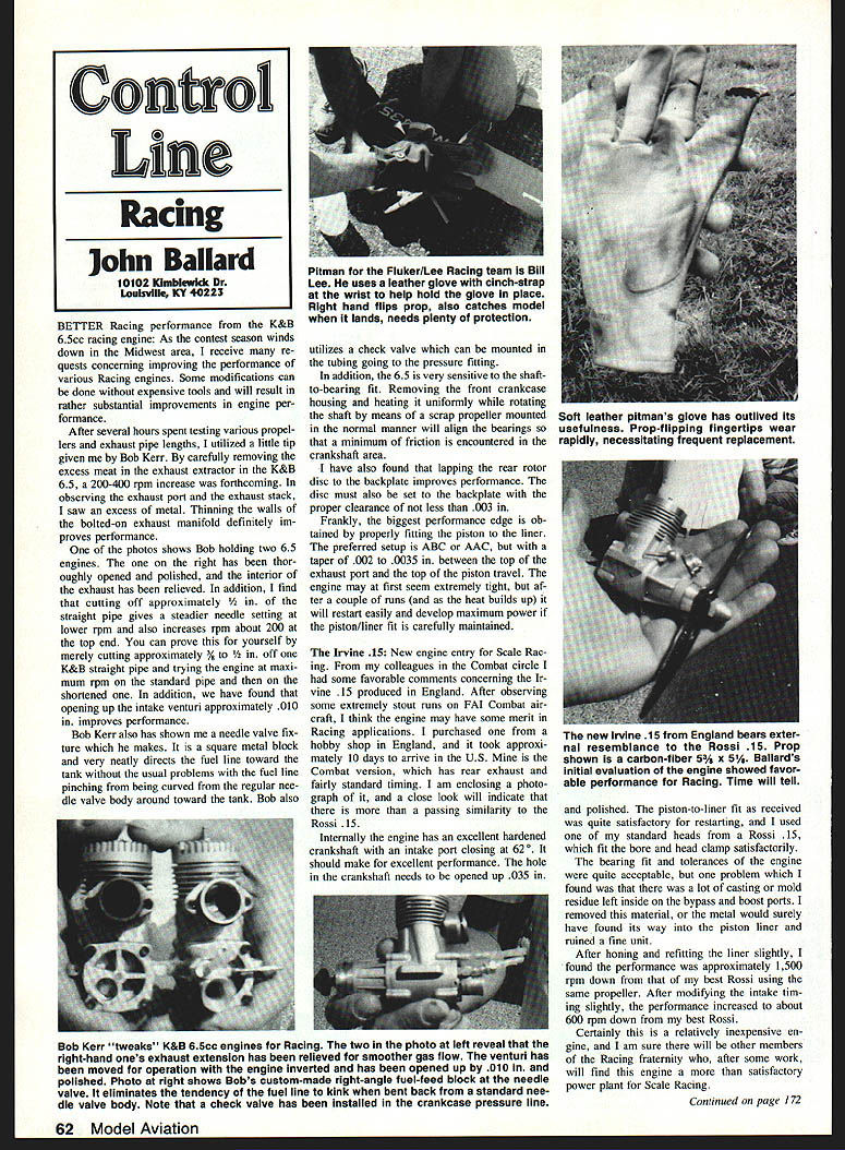 BETTER Racing performance K&B 65cc racing engine As contest season winds down Midwest area receive re quests concerning improving performance various Racing engines Some modifications can done expensive tools will result rather substantial improvements engine per formance After several hours spent testing various propel lers exhaust pipe lengths utilized little tip given Bob Kerr carefully removing excess meat exhaust extractor K&B 65 200-400 rpm increase forthcoming observing exhaust port exhaust stack saw excess metal Thinning walls bolted-on exhaust manifold definitely im proves performance photos shows Bob holding two 65 engines right has thor oughly opened polished interior exhaust has relieved addition find cutting off approximately ight pipe gives steadier needle setting lower rpm also increases rpm about 200 top end can prove yourself merely cutting approximately % K&B straight pipe trying engine maxi mum rpm standard pipe shortened addition have found opening up intake venturi approximately 010 improves performance Bob Kerr also has shown needle valve fix ture makes square metal block very neatly directs fuel line toward tank usual problems fuel line pinching being curved regular nee dle valve body around toward tank Bob also utilizes check valve can mounted tubing going pressure fitting addition 65 very sensitive shaftto-bearing fit Removing front crankcase housing heating uniformly rotating shaft means scrap propeller mounted normal manner will align bearings minimum friction encountered crankshaft area have also found lapping rear rotor disc backplate improves performance disc must also set backplate proper clearance less 003 Frankly biggest performance edge ob tained properly fitting piston liner preferred setup ABC AAC taper 002 0035 between top exhaust port top piston travel engine may first seem extremely tight af ter couple runs heat builds up will restart easily develop maximum power piston/liner fit carefully maintained Irvine 15 New engine entry Scale Rac ing colleagues Combat circle some favorable comments concerning Ir vine 15 produced England After observing some extremely stout runs FAI Combat air craft think engine may have some merit Racing applications purchased hobby shop England took approxi mately 10 days arrive US Mine Combat version has rear exhaust fairly standard timing am enclosing photo graph close look will indicate passing similarity Rossi 15 Internally engine has excellent hardened crankshaft intake port closing 62 0 should make excellent performance hole crankshaft needs opened up 035 Bob Kerr tweaks K&B 65cc engInes Racing two photo left reveal right-hand ones exhaust extension has relieved smoother gas flow venturi has moved operation engine inverted has opened up 010 polished Photo right shows Bobs custom-made right-angle fuel-feed block needle valve eliminates tendency fuel line kink bent back standard necdie valve body Note check valve has installed crankcase pressure line polished piston-to-liner fit received quite satisfactory restarting used standard heads Rossi 15 fit bore head clamp satisfactorily bearing fit tolerances engine quite acceptable problem found was lot casting mold residue left inside bypass boost ports removed material metal would surely have found its way piston liner ruined fine unit After honing refitting liner slightly found performance approximately 1500 rpm down best Rossi using same propeller After modifying intake tim ing slightly performance increased about 600 rpm down best Rossi Certainly relatively inexpensive en gine am sure will other members Racing fraternity after some work will find engine satisfactory power plant Scale Racing Continued page 172 62 Model Aviation Control Line Racing John Ballard 10102 Klmbkwlck Dr Louisville KY 40223 Pitman Fluker/Lee Racing team Bill Lee uses leather glove cinch-strap wrist help hold glove place Right hand flips prop also catches model lands needs plenty protection Soft leather pitmans glove has outlived its usefulness Prop-flipping fingertips wear rapidly necessitating frequent replacement new Irvine 15 England bears exter nal resemblance Rossi 15 Prop shown carbon-fiber 5% x 5/ Ballards initial evaluation engine showed favor able performance Racing Time will tell THERMAL CHARGER what looking electric sailplane good looks easy build fun fly great performance Thermal Charger Wing Span Wing Area Motor Included 60 Inches 545 Sq Inches Leisure 05 Electric %fl PRECISION PRODUCTS INC 714 592-5144 510 E Arrow Highway San Dimas CA 91773 Junior Senior champs need compete headto-head against Open champion would no longer exist possibility quite controversial fliers feel such format would effectively ex clude Juniors Seniors future par ticipation Walker Cup flyoff may prove case evi dence past argues against Names like Werwage Cipra Adamisin proof posi tive excellence rises top regardless age Besides flip side coin un der skill class format entirely possible five top Expert class fliers could Jun iors Seniors would us old duffers standing sidelines CL Racing/Ballard Continued page 62 Pitmans finger protection have asked several occasions recommend best type glove pitman use Over years have found all-leather glove absolutely best gloves use fiber body leather trim just too stiff good flexible fin ger movement Remember pitmans right hand generally used adjust needle valve open fuel shutoffs require good smooth finger movement flip propwhich man dates protection kickback Racing engine addition people like glove can cinched up wrist photos shows well-used leather glove discarded after Racing campaigns As can see flip-finger has fi nally become cut mangled no longer fers protection pitmans digit cinching glove up near wrist glove held sta tionary hand reduces slippage grabbing aircraft landing glove actu ally acts damping unit pitman catches airplane either prop nut wing leather glove much slipresistant grabbing Racer covered oil during fast pit stop pitmen prefer gloves have no lining fl