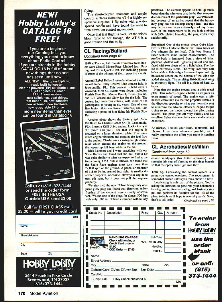 MODIFIED FM Team Race engines will first subject month Although isnt lot interest Team Racing US maybe can generate greater degree excite ment very challenging event Ive comments about recent arti cle July 90 issue concerning Team Racing engine modifications US 1990 FM Team Race teams Willoughby/Oge using two heavily modified engines upcoming CL World Championships Newcomers subject FM Team Racing need know engines must 25cc 1525 cu displacement less models limited very small fuel capacity 7cc about 24 fluid ounces diesel engines universal choice fliers give best fuel economy modified engines shown therefore diesels first engine made crankcase Stewart Willoughby acquired Rus sian 88 champs Stewart machined backplate phenolic plastic uses K&B rotary valve running bronze bushing keep backplate assembly light possible engine front-exhaust AAC aluminum/al uminum/chrome aluminum piston running chrome-plated aluminum cylinder linerEd bore/stroke ratio 15/14mm frontexhaust engines have become quite popular Europe used almost universally Russian teams Basically diesels run extremely hot placing hot exhaust side engine toward front gets greatest exposure cooling air keeps cooler reduces cylinder thermal dis tortion exhaust gases arent blown engine significant extent since propwash velocity region very low compared velocity expelled exhaust gas second engine heavily modified Nel son 15 basically standard rearexhaust Nelson crankcase reversed crankshaft housing has cut off stock backplate machined press fitted housing originally located An all-steel front housing using standard Nelson bearings crankshaft mounted backplate formerly bolted onto engine will notice Russian engine has mounting lug crankcase itself other mounting lug well forward bolt-on front end modified Nelson uses standard two-bolt lugs attached crankcase Stewart calls front-stack Nelson Noslen Nelson spelled backwards Ive included photos both engines Southwestern Regionals Cholla Chop pers invitational meet held April 21-22 Continued page 170 Left Noslen 15 Team Race engine exhaust stack regular Nelson has re versed front shaft unit machined fit backplate mounting screws Right Russian case AAC crankcase phenolic machined rear cover using K&B 15 rotor Mount ing lugs located engine casting front shaft housing helping reduce vibration October 1990 61 Conoi Line Racing John Ballard 10102 Klmblewick Dr Louisville KY 40223 Glass II Mouse runners Cholla Choppers Annual invitational Meet held April 21-22 Left right Mike Fox Los Angeles CA Chris Peter Tucson AZ Dave Reynolds Tucson AZ An original-design Class Mouse Racer Gabe Manfredi metal engine mount adds front-end stability Note V-tail stab SIx-year-ola Hussell Whitney prepares take off dad handles pitting Plane Buster uses Fox 19 engine Charles Barnes Sr Fort Lauderdale FL AMA Slow Rat K&B 58 Note large Harrys Heavy Hub prop nut youre catching plane big engine spinning prop helps have big round hub grab rather pointy flying short-coupled moments ample control surfaces make AT-6 highly re sponsive airplane fly widespaced handle have found need tune down control movements Once test flight over let winds blow True lineage AT-6 good trainer fun fly CL Racing/Ballard Continued page 61 1990 Tucson AZ Events interest us Rac ers Class II Mouse Race Limited Sport Rac ing Texas Quickie Rat Im including photos some winners respective events Annual Rebel Rally recently attended 30th annual Rebel Rally Control Line contest held Jacksonville FL contest held over weekend Most CL events flown including Florida Slow Rat Mouse Race Texas Quickie Lil Wizard Slow Rat kids contest numerous entries some participants young six years fine Junior pilots Russell Whitney am enclosing photo him flying Florida Slow Rat Another photo shows Lickety Split Slow Rat flown Charles Barnes Sr Ft Lauderdale FL uses K&B 58cc engine Look closely photo youll see engine mounted large aluminum plate mini mizes engine vibration steadies fuel flow engine Charles uses swing-weight carbu retor chokes engine ground opens up full bore air Dick Lambert practicing Scale Racers found hot humid air quite similar what expect find forthcoming AMA Nats Illinois found Scale Race engines must turn 27000 rpm ground propeller diameter 6 6% seemed just right smaller di ameter prop will course allow engine turn rpm does pull airplane properly also tried new Nelson heavy-duty onepiece glow plug found distortion and/or frosting element virtually nonexis tent ran plugs almost 300 laps 005 head clearance ~ HANDLING CHARGE Check order Credit Card order $490 COD Order $790 I2 problems element appears hold up much better wire ones used first two pro duction runs particular plug test ing because earlier report heavyduty plug did develop enough heat may case extremely cool day ever temperature high eighties 65% relative humidity plug works very satisfactorily Superfast photos shows Gabe Man fredis Class Mouse Racer turns times five minutes flat less Mouse racer features some unique characteristics profile body laminated piece %-in plywood drilled lightening holes sur faced two sheets very light balsa fin ish extremely sleek wing uses very soft balsa lightweight basswood spar l/ basswood veneer bottom wing added strength resulting flat-bottomed wing extremely light tail piece hard 1A6 balsa Note engine mounts onto thick metal plate reduces engine vibration gives extra margin speed engine uses left handed crankshaft propeller rotates direction opposite what normally see minimize adverse effects engine torque trying roll model toward pilot during takeoff plane gets off very quickiy has excellent flying characteristics under windy conditions As always solicit ideas comments photos use whenever possible really appreciate effort make sending CL Aerobatics/McMiIIan Continued page 62 coarse sandpaper better adhesion spread thin coat Vaseline hinge barrels epoxy wont get Tech tip Lubricating control system point cannot overlook requirement somewhat hidden unless th
