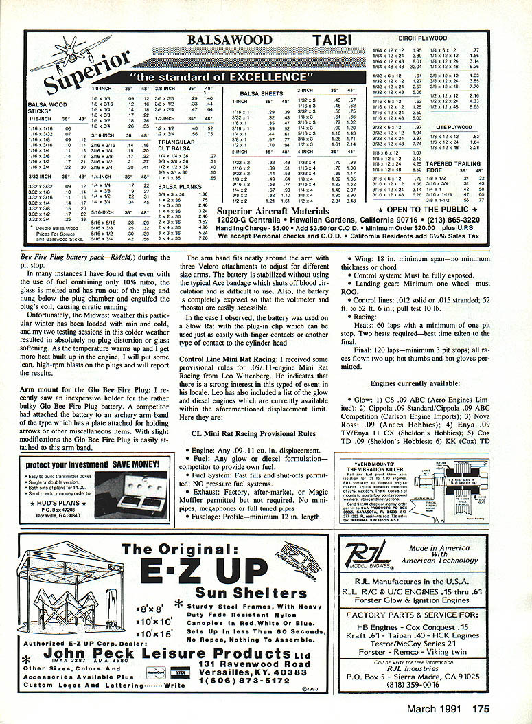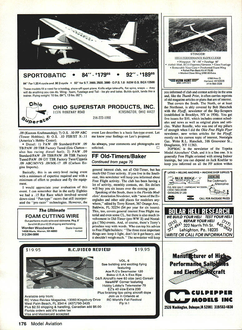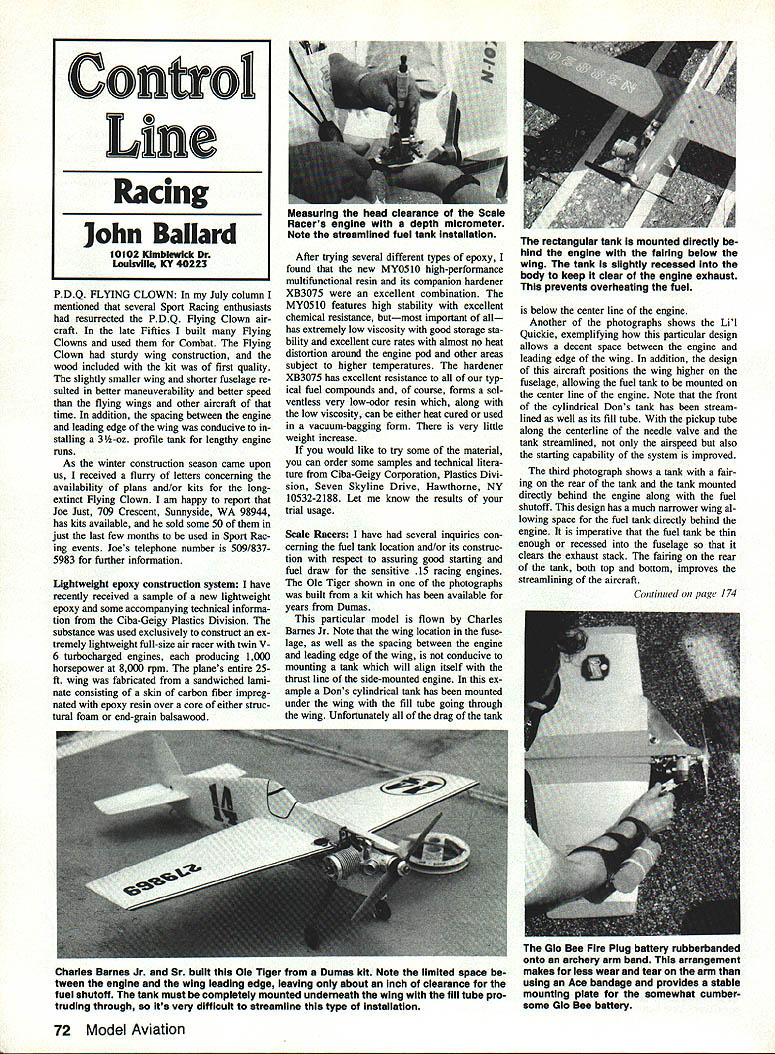 PDQ FLYING CLOWN July column mentioned several Sport Racing enthusiasts resurrected PDQ Flying Clown air craft late Fifties built Flying Clowns used Combat Flying Clown sturdy wing construction wood included kit first quality slightly smaller wing shorter fuselage re sulted better maneuverability better speed flying wings other aircraft time addition spacing between engine leading edge wing conducive stalling 3-oz profile tank lengthy engine runs As winter construction season came upon us received flurry letters concerning availability plans and/or kits longextinct Flying Clown am happy report Joe Just 709 Crescent Sunnyside WA 989 has kits available sold some 50 just last few months used Sport Rac ing events Joes telephone number 509/8375983 further information Light-weight epoxy construction system have recently received sample new lightweight epoxy some accompanying technical informa tion Ciba-Geigy Plastics Division substance used exclusively construct ex tremely lightweight full-size air racer twin V 6 turbocharged engines producing 1000 horsepower 8000 rpm planes entire 25ft wing fabricated sandwiched lami nate consisting skin carbon fiber impreg nated epoxy resin over core either struc tural foam end-grain balsawood After trying several different types epoxy found new MYOSlO high-performance multifunctional resin its companion hardener XB3075 excellent combination MYOS 10 features high stability excellent chemical resistance butmost important has extremely low viscosity good storage sta bility excellent cure rates almost no heat distortion around engine pod other areas subject higher temperatures hardener XB3075 has excellent resistance typ ical fuel compounds course forms sal ventless very low-odor resin along low viscosity can either heat cured used vacuum-bagging form very little weight increase would like try some material can order some samples technical litera ture Ciba-Geigy Corporation Plastics Divi sion Seven Skyline Drive Hawthorne NY 10532-2188 Let know results trial usage Scale Racers have several inquiries con cerning fuel tank location and/or its construc tion respect assuring good starting fuel draw sensitive 15 racing engines Ole Tiger shown photographs built kit has available years Dumas particular model flown Charles Barnes Jr Note wing location fuse lage well spacing between engine leading edge wing conducive mounting tank will align itself thrust line side-mounted engine ex ample Dons cylindrical tank has mounted under wing fill tube going through wing Unfortunately drag tank below center line engine Another photographs shows Lil Quickie exemplifying particular design allows decent space between engine leading edge wing addition design aircraft positions wing higher fuselage allowing fuel tank mounted center line engine Note front cylindrical Dons tank has stream lined well its fill tube pickup tube along centerline needle valve tank streamlined airspeed also starting capability system improved third photograph shows tank fair ing rear tank tank mounted directly behind engine along fuel shutoff design has much narrower wing al lowing space fuel tank directly behind engine imperative fuel tank thin enough recessed fuselage clears exhaust stack faking rear tank both top bottom improves streamlining aircraft 72 Model Aviation Control Line Racing John Ballard 10102 Klmbiewick Dr LouIsvIlle KY 40223 Measuring head clearance Scale Racers engine depth micrometer Note streamilned fusi tank instaiiation rectanguiar tank mounted directly hind engine fairing below wing tank slIghtly recessed body keep clear engine exhaust prevents overheating fuel Continued page 174 Charles Barnes Jr Sr built Ole Tiger Dumas kIt Note ilmited space tween engine wing leading edge leaving about inch clearance fuel shutoff tank must completely mounted underneath wing fill tube pro truding through its very difficult streamline type installatIon Gb Bee Fire Plug battery rubberbanded onto archery arm band arrangement makes less wear tear arm using Ace bandage provides stabie mounting plate somewhat cumber some Gb Bee battery Send S2OO Catalog ot iians Accessories ond uppIIes Credited First Order S25 .....UJIl]U iiei w4Ibe]uE wm Ieiu i~iiiniiIew u mum wzvuwi take engine apart dont very least ask someone does made sleeve pul icr tapping Center brass bar spanned across sleeve caught top opposite ports long bolt went up washer piece tubing sat crankcase over sleeve pulled sleeve Out easily think can save everything except ring piston Ill have adapt plate cover holes between muffler engine couple hints RC fliers Sometimes ringed engine will lose compression power first idea hits ring worn out isnt always problem since rings normally last long time have able expand move freely piston groove groove gets filled var nish hot lean runs burned fuel lubri cants ring cannot match cylinder wall proper compression fix remove piston carefully properly course dissolve clean off varnish Its var nish use varnish remover furniture strip per Dont take ring off piston just get loose clean groove soft brush Dont damage groove knives scrap ers Follow safety directions about fire toxicity careful reassembling ring pinned pinned ring has rotated properly before can compressed re-enter sleeve use gun lubricant called Sheath made Birchwood Casey after-run oil helps dissolve varnish build up pre vents rust Maybe Ill have some speed information next column CL Racing/Ballard Continued page 72 find competitors using Lil Quickie will modify round Dons tank var ious ways recess fuselage well streamline mounting tank least good basic unit can modify easily pickup tube tank usually mounted two specific ways typical mounting along outboard side tank line center bar needle valve end ap proximately half-inch rear tank usually use brass tab soldered tubing done rear cover tank off avoid tube coming loose dont way Ill file end tube form little tab bend around side tank end tank backplate soldered place locks tube position other way ins