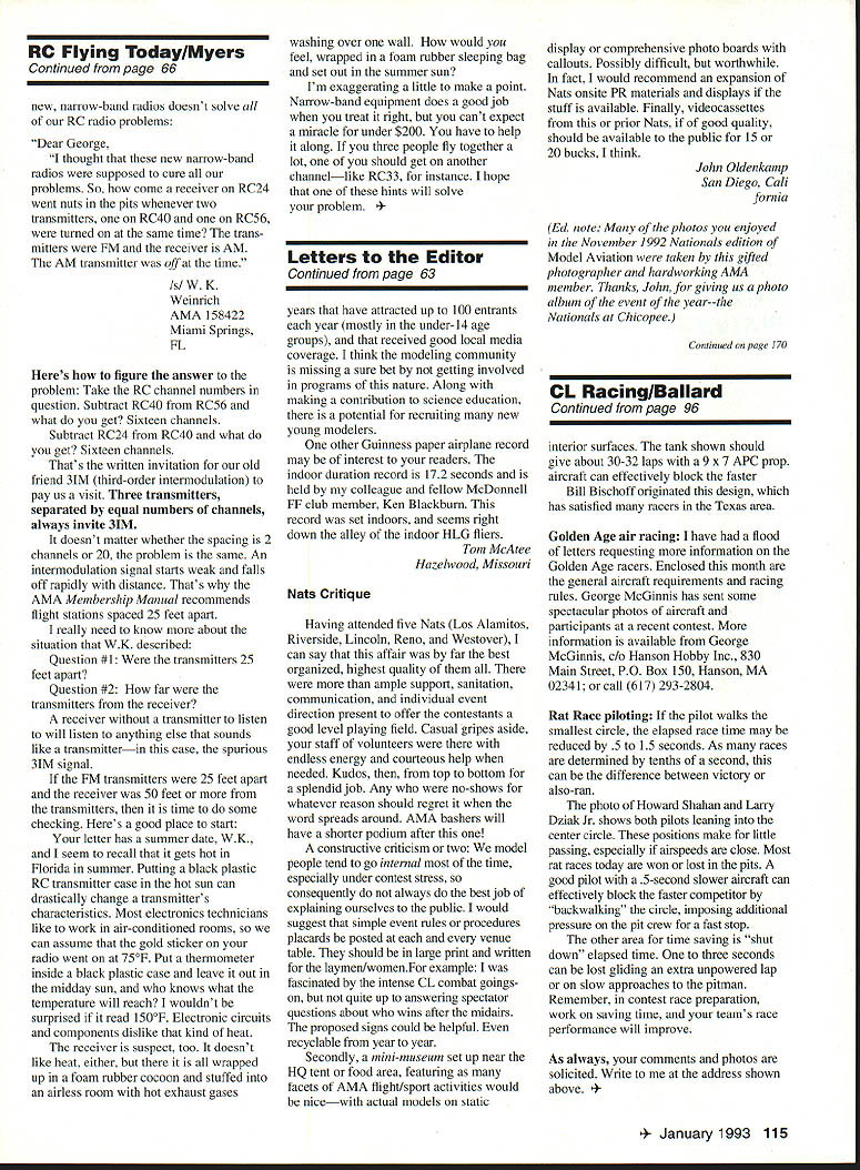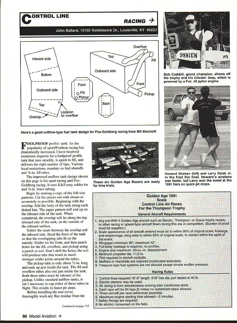CONTROL LINE RACING s good uniflow-type fuel tank design Fox-Goldberg racing Bill Bischoff OOLPROOF profile tank As 52 popularity sportfFoxberg racing has dramatically increased have received numerous requests foolproof profile tank runs steadily quick fill delivers right number laps Various local restrictions mandate no fuel shutoffs A-in fill tubes improved uniflow tank design shown page sport racing FoxGoldberg racing uses K&S easy solder tin /8-in brass tubing Begin making copy full-size patterns Cut pieces out shears accurately possible Beginning overlap fold body tank along dotted line paper pattern will end up inboard side tank completed overlap will along top inboard side tank outside inboard surface Solder seam between overlap inboard side Bend front tank overlapping tabs fit outside Solder front punch holes fill overflow pickup using punch awl Dont drill holes awl will produce tabs result much stronger solder joints around tubes pickup tube about -in long ends up just inside tank fill overflow tubes also end just inside tank Both tubes must inboard pickup Unlike standard uniflow tanks isnt necessary cap either tubes flight results faster pit stops Before installing rear cover thoroughly wash flux residue Continued page 115 96 Model Aviation ard side Bottom Front Outboard side oFill up 0 TopBack Location Overlapfor overflow Bob Caddell grand champion shows off trophy Chester Jeep powered Fox 40 pylon engine Howard Shahan left Larry Dziak Jr Fast Rat final Howards airplane six Golden Age Racers readywas faster Larry won event time trials1991 Nats quick pit stops RC Flying Today/Myers Continued page 66 new narrow-band radios doesnt solve RC radio problems Dear George thought new narrow-band radios supposed cure problems So come receiver RC24 went nuts pits whenever two transmitters RC4O RC56 turned same time trans mitters FM receiver AM AM transmitter off time /s/W K Weinrich AMA 158422 Miami Springs FL Heres figure answer problem Take RC channel numbers question Subtract RC40 RC56 what get Sixteen channels Subtract RC24 RC4O what get Sixteen channels Thats written invitation old friend 31M third-order intermodulation pay us visit Three transmitters separated equal numbers channels always invite 31M doesnt matter whether spacing 2 channels 20 problem same An intermodulation signal starts weak falls off rapidly distance Thats AMA Membership Manual recommends flight stations spaced 25 feet apart really need know about situation WK described Question #1 transmitters 25 feet apart Question #2 far transmitters receiver receiver transmitter listen will listen anything else sounds like transmitterin case spurious 31M signal FM transmitters 25 feet apart receiver 50 feet transmitters time some checking Heres good place start letter has summer date WK seem recall gets hot Florida summer Putting black plastic RC transmitter case hot sun can drastically change transmitters characteristics Most electronics technicians like work air-conditioned rooms can assume gold sticker radio went 750F Put thermometer inside black plastic case leave out midday sun knows what temperature will reach wouldnt surprised read 1500F Electronic circuits components dislike kind heat receiver suspect too doesnt like heat either wrapped up foam rubber cocoon stuffed airless room hot exhaust gases washing over wall would feel wrapped foam rubber sleeping bag set out summer sun Im exaggerating little make point Narrow-band equipment does good job treat right cant expect miracle under $200 have help along three people fly together lot should get another channellike RC33 instance hope hints will solve problem ers Editor Continued page 63 years have attracted up 100 entrants year mostly under- 14 age groups received good local media coverage think modeling community missing sure bet getting involved programs nature Along making contribution science education potential recruiting new young modelers other Guinness paper airplane record may interest readers indoor duration record 172 seconds held colleague fellow McDonnell FF club member Ken Blackburn record set indoors seems right down alley indoor HLG fliers Tom McAtee Hazeiwood Missouri Nats Critique Having attended five Nats Los Alamitos Riverside Lincoln Reno Westover can say affair far best organized highest quality ample support sanitation communication individual event direction present offer contestants good level playing field Casual gripes aside staff volunteers endless energy courteous help needed Kudos top bottom splendid job Any no-shows whatever reason should regret word spreads around AMA bashers will have shorter podium after constructive criticism two model people tend go internal time especially under contest stress consequently always best job explaining ourselves public would suggest simple event rules procedures placards posted venue table should large print written laymenlwomenFor example fascinated intense CL combat goingson quite up answering spectator questions about wins after midairs proposed signs could helpful recyclable year year Secondly mini-museum set up near HQ tent food area featuring facets AMA flight/sport activities would nicewith actual models static display comprehensive photo boards callouts Possibly difficult worthwhile fact would recommend expansion Nats onsite PR materials displays stuff available Finally videocassettes prior Nats good quality should available public 15 20 bucks think John Oldenkamp San Diego Cali fornia Ed note photos enjoyed November 1992 Nationals edition Model Aviation taken gifted photographer hardworking AMA member Thanks John giving us photo album event year--the Nationals Chicopee Continued page 170 CL Racing/Ballard Continued page 96 interior surfaces tank shown should give about 30-32 laps 9 x 7 APC prop aircraft can effectively block faster Bill Bischoff originated design has satisfied racers Texas area Golden Age air racing have flood letters requesting information Golden Age racers Enclosed month gene