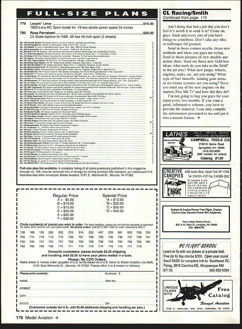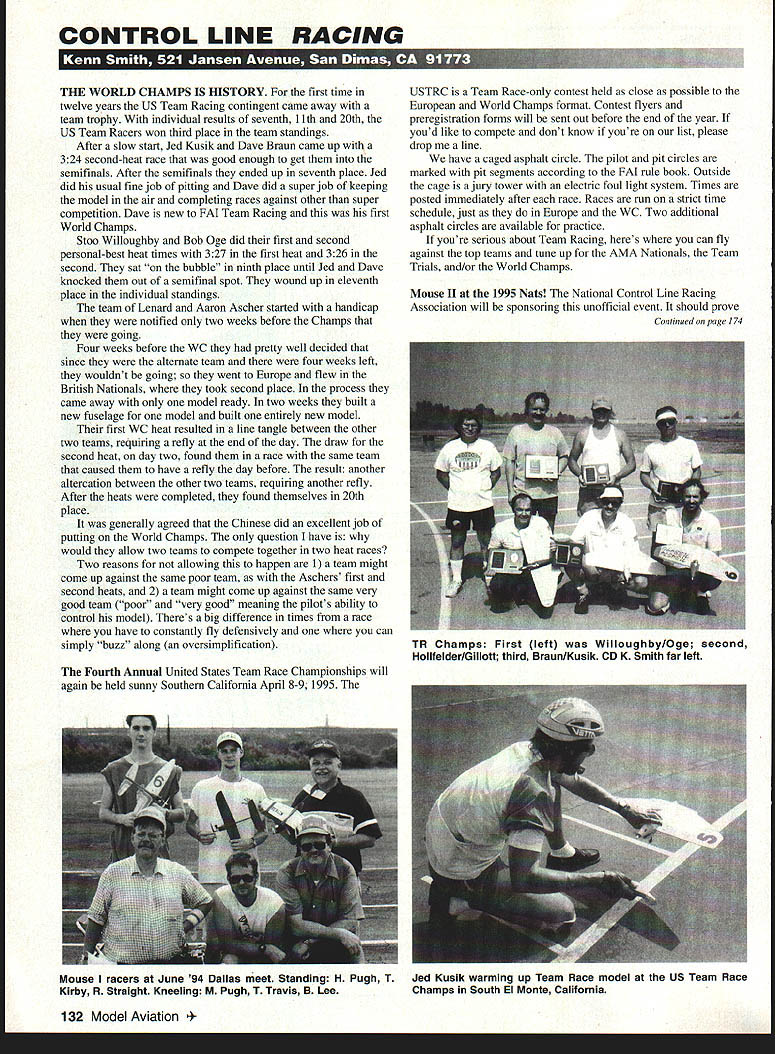 CONTROL LINE RACING THE WORLD CHAMPS IS HISTORY first time twelve years US Team Racing contingent came away team trophy individual results seventh 11th 20th US Team Racers won third place team standings After slow start Jed Kusik Dave Braun came up 324 second-heat race good enough get semifinals After semifinals ended up seventh place led did usual fine job pitting Dave did super job keeping model air completing races against other super competition Dave new FAI Team Racing first World Champs Stoo Willoughby Bob Oge did first second personal-best heat times 327 first heat 326 second sat bubble ninth place until Jed Dave knocked out semifinal spot wound up eleventh place individual standings team Lenard Aaron Ascher started handicap notified two weeks before Champs going Four weeks before WC pretty well decided since alternate team four weeks left wouldnt going went Europe flew British Nationals took second place process came away model ready two weeks built new fuselage model built entirely new model first WC heat resulted line tangle between other two teams requiring refly end day draw second heat day two found race same team caused have refly day before result another altercation between other two teams requiring another refly After heats completed found themselves 20th place generally agreed Chinese did excellent job putting World Champs question have would allow two teams compete together two heat races Two reasons allowing happen 1 team might come up against same poor team Aschers first second heats 2 team might come up against same very good team poor very good meaning pilots ability control model Theres big difference times race have constantly fly defensively can simply buzz along oversimplification Fourth Annual United States Team Race Championships will again held sunny Southern California April 8-9 1995 USTRC Team Race-only contest held close possible European World Champs format Contest flyers preregistration forms will sent out before end year youd like compete dont know youre list please drop line have caged asphalt circle pilot pit circles marked pit segments according FAT rule book Outside cage jury tower electric foul light system Times posted immediately after race Races run strict time schedule just Europe WC Two additional asphalt circles available practice youre serious about Team Racing heres can fly against top teams tune up AMA Nationals Team Trials and/or World Champs Mouse II 1995 Nuts National Control Line Racing Association will sponsoring unofficial event should prove Continued page 174 Mouse racers June 94 Dallas meet Standing H Pugh T Jed Kusik warming up Team Race model US Team Race Kirby R Straight Kneeling M Pugh T Travis B Lee Champs South El Monte California 132 Model Aviation 4TR Champs First left Willoughbyloge second HollfelderIGillott third Braun/Kusik CD K Smith far left PRODUCTS mm yuc nmarrmusn .flflca Complete Line Exhaust Systems Tuned Pipes led Tuned Pipes Headers Venturi Mufflers * Expansion Mufflers copter Ball Mufflers ialized Exhaust Systems Unhurpasd anc CL Racing/Smith Continued page 132 to be hotly contested series races Several engines could prove competitive still two three teams can make Cox Tee Dee go fast enough beat leftover Shurikens Now have hot little Combat Stels new VA Russian engines both really scream Chinese CS engine should also very competitive selection engines should have positive effect turnout event Five-Day Racing Calendar Nats item discussed NCLRA annual meeting possibility having event day Natswhich would require five days complete racing events discussion brought up because Fast Rat Team Racing same day first glance seems like neat idea everybody would get plenty time get models ready have plenty practice time wait minute national event Arent supposed ready before go Nats problems Ive heard about running AMA Nationals wed better take long look specific part biggest complaint Ive heard Control Line Racing competitors Nationals run professionally run lackadaisical manner theres no real incentive move things along have event day dont start heat races until 1030 1100 take own sweet time between races waiting everybody get act together somebody has problem blows plug has run after tool countdown stops wait till everyones ready Thats bunch bull go countrys top competition event should prepared get circle countdown starts blow plug toughyou change go off late should have changed before going out should know equipment anticipate problems arrive site model should ready equipment should ready should ready Youre compete nations finest other nations youre finest should set example always being ready arent dont complain about baying time get together want compete worldclass competitionand Nats worldclasswe need start acting worldclass manner Instead having competition days should cut back three days five events first day would have first heats events second day secondheat races events third day would have semifinals finals events Two days before competition would practice events Think about would give plenty practice time youd have night repair readjust next days races regardless event Youd actually have better chance make finals crashed first heat engine equipment problems youd have cbance make repairs before second heat same goes problems second heat made semi final end third day could have annual meeting bona fide awards banquet way World Champs done Europeans have doing way decades have far competitors per event additional benefit would would give opportunity wish enter events other control line categories would mean wed have start days racing earlier have set race times would mean would have give up lackadaisical approach Control Line Racing think its worth Wheres support guys promised last year Ive received three tidbits information control line community wouldnt feel bad sending Dave McDonald NCLRA isnt getting much either Continued page 176 BILL EFFINGER SAYSI still time bii Id trying seOsOn ohena Remember greot desi