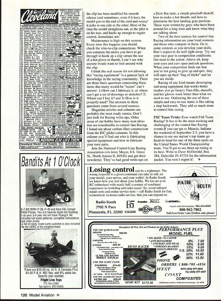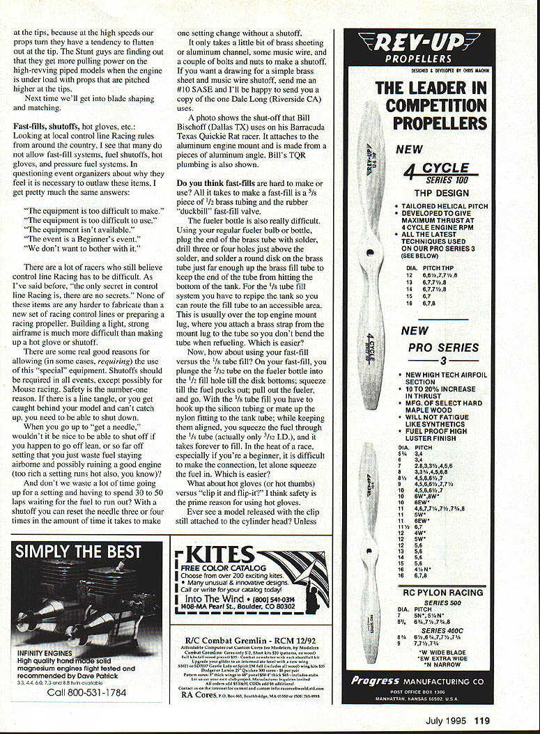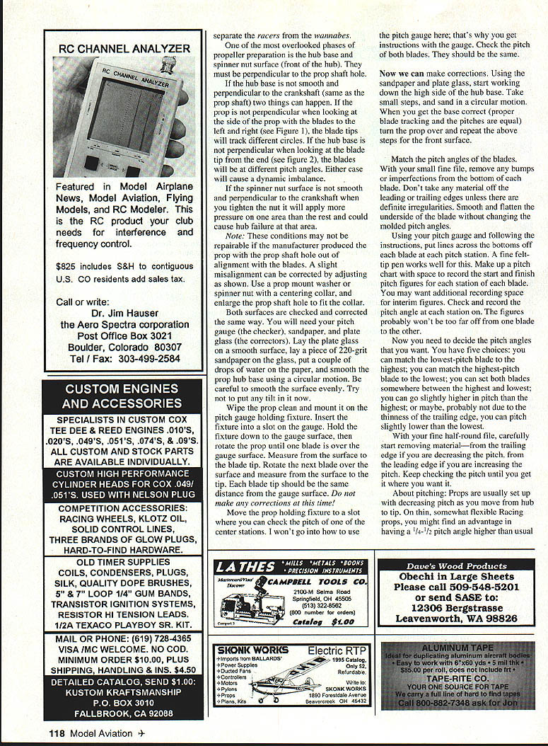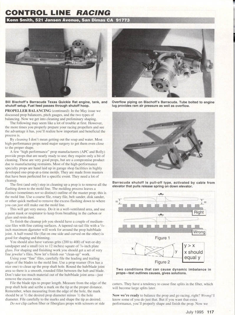 CONTROL LINE RACING Bill Bisohoffs Barracuda Texas Quickie Rat engine tank shutoff setup Fuel feed passes through shutoff hoop PROPELLER BALANCING continued May issue discussed prop balancers pitch gauges two types balancing Now get cleaning preliminary shaping following may seem like lot trouble first However times properly prepare racing propellers see advantage has youll realize important beneficial process cleaning dont mean getting out soap water Most high-performance props need major surgery get close proper shape few high performance prop manufacturers APC Bolly provide props nearly ready use require bit cleaning very good props compromise product due manufacturing restraints Most high-performance specialty props hand laid up garage shop facilities highly developed one-prop-at-a-time molds made masters have perfected specific event need lot cleanup first step cleaning up prop remove flashing down mold line molding process leaves distinct sometimes distinct outline master prop mold line Use coarse file rotary file belt sander disk sander other quick method remove excess flashing down can just still make out mold line will get very messy well-ventilated area use paint mask respirator keep breathing carbon glass resin dust finish cleanup job should have couple mediumsize files fine cutting surfaces tapered rat-tail file 1/4. inch maximum diameter will work around prop hub/blade joint half-round file flat side curved other good shaping thinning should also have various grits 200 400 wet-or-dry sandpaper small six 12 inches square 1/4-inch plate glass shaping finishing work should get set very fine jewelers files Now lets finish clean-up work Using fine files carefully file leading trailing edges blades mold line Use prop reamer Fox has nice clean up prop shaft hole Round hub/blade joint area smooth rounded fillet between hub blade Dont take too much material out hub/blade joint areajust remove excess resin File blade tips proper length Measure edge prop shaft hole scribe mark tip proper distance Remember measuring edge hole mark should /2 desired prop diameter minus /2 hole diameter File carefully marks shape tip desired clip carbon fiber fiberglass props scissors side Lmump mu Right Figure 1 xyx IY xshould equaly Figure 2 Two conditions can cause dynamic imbalance propstext outlines causes gives solutions cutters have tendency cause fine splits fiber will become large splits later Now ready balance prop go racing right Wrong know some just want extra performance youll properly shape finish prop Now July 1995 117 Overflow piping Bischoffs Barracuda Tube bolted engine lug provides ram air pressure well overflow Barracuda shutoff pull-off type activated cable elevator pulls release spring down elevator Featured Model Airplane News Model Aviation Flying Models RC Modeler RC product club needs interference frequency control $825 includes S&H contiguous US CO residents add sales tax Call write Dr Jim Hauser Aero Spectra corporation Post Office Box 3021 Boulder Colorado 80307 Tel Fax 303-499-2584 COMPETITION ACCESSORIES RACING WHEELS KLOTZ OIL SOLID CONTROL LINES THREE BRANDS OF GLOW PLUGS HARD-TO-FIND HARDWARE OLD TIMER SUPPLIES COILS CONDENSERS PLUGS SILK QUALITY DOPE BRUSHES 5 & 7 LOOP 114 GUM BANDS TRANSISTOR IGNITION SYSTEMS RESISTOR HI TENSION LEADS 112A TEXACO PLAYBOY SR KIT separate racers wannabes overlooked phases propeller preparation hub base spinner nut surface front hub must perpendicular prop shaft hole hub base smooth perpendicular crankshaft same prop shaft two things can happen prop perpendicular looking side prop blades left right see Figure 1 blade tips will track different circles hub base perpendicular looking blade tip end see figure 2 blades will different pitch angles Either case will cause dynamic imbalance spinner nut surface smooth perpendicular crankshaft tighten nut will apply pressure area rest could cause hub failure area Note conditions may repairable manufacturer produced prop prop shaft hole out alignment blades slight misalignment can corrected adjusting shown Use prop mount washer spinner nut centering collar enlarge prop shaft hole fit collar Both surfaces checked corrected same way will need pitch gauge checker sandpaper plate glass correctors Lay plate glass smooth surface lay piece 220-grit sandpaper glass put couple drops water paper smooth prop hub base using circular motion careful smooth surface evenly Try put tilt now Wipe prop clean mount pitch gauge holding fixture Insert fixture slot gauge Hold fixture down gauge surface rotate prop until blade over gauge surface Measure surface blade tip Rotate next blade over surface measure surface tip blade tip should same distance gauge surface make corrections time Move prop holding fixture slot can check pitch center stations wont go use pitch gauge thats get instructions gauge Check pitch both blades should same Now can make corrections Using sandpaper plate glass start working down high side hub base Take small steps sand circular motion get base correct proper blade tracking pitches equal turn prop over repeat above steps front surface Match pitch angles blades small fine file remove bumps imperfections bottom blade Dont take material off leading trailing edges unless definite irregularities Smooth flatten underside blade changing molded pitch angles Using pitch gauge following instructions put lines across bottoms off blade pitch station fine felttip pen works well Make up pitch chart space record start finish pitch figures station blade may want additional recording space interim figures Check record pitch angle station figures probably wont too far off blade other Now need decide pitch angles want have five choices can match lowest-pitch blade highest can match highest-pitch blade lowest can set both blades somewhere between highest lowest can go slightly higher pitch highest maybe probably due thinness trailing edge can pitch slightly lower lowest fine half-round file carefully start removing ma