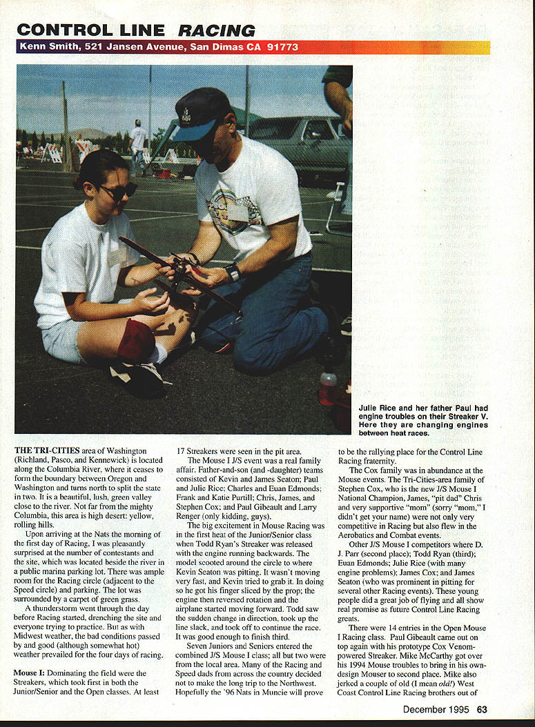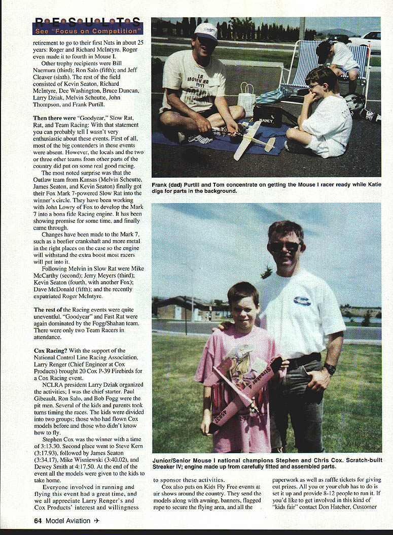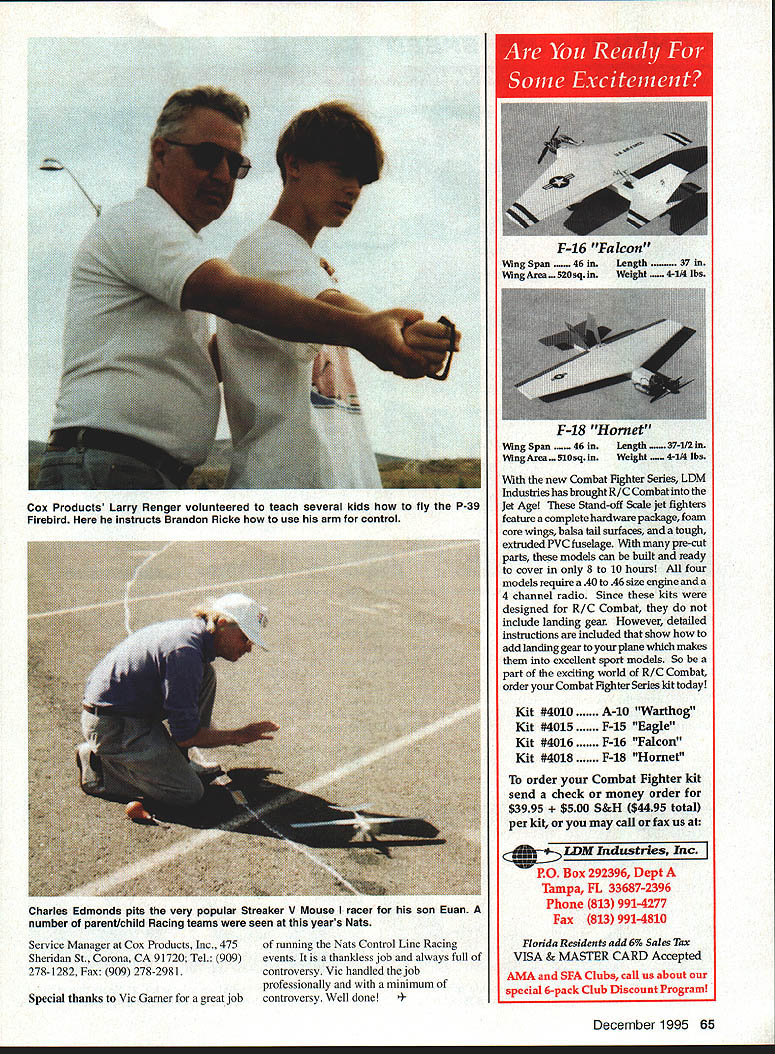 CONTROL LINE RACING Julie Rice father Paul engine troubles Streaker V changing engines between heat races THE Tm-CITIES area Washington Richiand Pasco Kennewick located along Columbia River ceases form boundary between Oregon Washington turns north split state two beautiful lush green valley close river far mighty Columbia area high desert yellow rolling hills Upon arriving Nats morning first day Racing pleasantly surprised number contestants site located beside river public marina parking lot ample room Racing circle adjacent Speed circle parking lot surrounded carpet green grass thunderstorm went through day before Racing started drenching site everyone trying practice Midwest weather bad conditions passed good although somewhat hot weather prevailed four days racing Mouse Dominating field Streakers took first both Junior/Senior Open classes least 17 Streakers seen pit area Mouse J/S event real family affair Father-and-son -daughter teams consisted Kevin James Seaton Paul Julie Rice Charles Euan Edmonds Frank Katie Purtill Chris James Stephen Cox Paul Gibeault Larry Renger kidding guys big excitement Mouse Racing first heat Junior/Senior class Todd Ryans Streaker released engine running backwards model scooted around circle Kevin Seaton pitting wasnt moving very fast Kevin tried grab doing got finger sliced prop engine reversed rotation airplane started moving forward Todd saw sudden change direction took up line slack took off continue race good enough finish third Seven Juniors Seniors entered combined J/S Mouse class two local area Racing Speed dads across country decided make long trip Northwest Hopefully 96 Nats Muncie will prove rallying place Control Line Racing fraternity Cox family abundance Mouse events Tri-Cities-area family Stephen Cox new J/S Mouse National Champion James pit dad Chris very supportive mom sorry mom didnt get name very competitive Racing also flew Aerobatics Combat events Other J/S Mouse competitors D J Parr second place Todd Ryan third Euan Edmonds Julie Rice engine problems James Cox James Seaton prominent pitting several other Racing events young people did great job flying show real promise future Control Line Racing greats 14 entries Open Mouse Racing class Paul Gibeault came out top again prototype Cox Venompowered Streaker Mike McCarthy got over 1994 Mouse troubles bring own design Mouser second place Mike also jerked couple old mean old West Coast Control Line Racing brothers out December 1995 63 ***IE*u -E-* retirement go first Nats about 25 years Roger Richard McIntyre Roger made fourth Mouse Other trophy recipients Bill Naemura third Ron Salo fifth Jeff Cleaver sixth rest field consisted Kevin Seaton Richard McIntyre Dee Washington Bruce Duncan Larry Dziak Melvin Scheutte John Thompson Frank Purtill Goodyear Slow Rat Rat Team Racing statement can probably tell wasnt very enthusiastic about events First of big contenders events absent However locals two three other teams other parts country did put some real good racing noted surprise Outlaw team Kansas Melvin Scheutte James Seaton Kevin Seaton finally got Fox Mark 7-powered Slow Rat winners circle have working John Lowry Fox develop Mark 7 bona fide Racing engine has showing promise some time finally came through Changes have made Mark 7 such beefier crankshaft metal right places case engine will withstand extra boost racers will put Following Melvin Slow Rat Mike McCarthy second Jerry Meyers third Kevin Seaton fourth another Fox Dave McDonald fifth recently expatriated Roger McIntyre rest Racing events quite uneventful Goodyear Fast Rat again dominated Fogg/Shahan team two Team Racers attendance Cox Racing support National Control Line Racing Association Larry Renger Chief Engineer Cox Products brought 20 Cox P-39 Firebirds Cox Racing event NCLRA president Larry Dziak organized activities chief starter Paul Gibeault Ron Salo Bob Fogg pit men Several kids parents took turns timing races kids divided two groups flown Cox models before didnt know fly Stephen Cox winner time 31330 Second place went Steve Kern 31793 followed James Seaton 33417 Mike Wisniewski 3 4002 Dewey Smith 41750 end event models given kids take home Everyone involved running flying event great time appreciate Larry Rengers Cox Products interest willingness sponsor activities Cox also puts Kids Fly Free events air shows around country send models along awning banners flagged rope secure flying area paperwork well raffle tickets giving out prizes club has set up provide 8-12 people run youd like get involved kind kids fair contact Don Hatcher Customer 64 Model Aviation k dad Purtill Tom concentrate getting Mouse racer ready Katie digs parts background Junior/Senior Mouse national champions Stephen Chris Cox Scratch-built Streaker IV engine made up carefully fitted assembled parts Charles Edmonds pits very popular Streaker V Mouse racer son Euan number parent/child Racing teams seen years Nats Service Manager Cox Products Inc. 475of running Nats Control Line Racing Sheridan St Corona CA 91720 Tel 909events thankless job always full 278-1282 Fax 909 278-2981controversy Vic handled job professionally minimum Special thanks Vic Gamer great jobcontroversy Well done . F-16 Falcon Wing Span ... 46 Length .. ing Area. 320 sq Weight ... 4-1/4 lbs F-18 Hornet Wing Span ... 46 Length .. 37-112 Wing Area. 5IOsqin Weight ... 4-1/4 lbs new Combat Fighter Series LDM Industries has brought R/C Combat Jet Age Stand-off Scale jet fighters feature complete hardware package foam core wings balsa tail surfaces tough extruded PVC fuselage pre-cut parts models can built ready cover 8 10 hours four models require 40 46 size engine 4 channel radio Since kits designed R/C Combat include landing gear However detailed instructions induded show add landing gear plane makes excellent sport models So part exciting world RIG Combat order Combat FIghter Series kit today Kit#4010A-bWarthog Kit#4015F-15Eagle Kit#4016F-16Falcon Kit#4018F-18Hornet order Combat Fighte