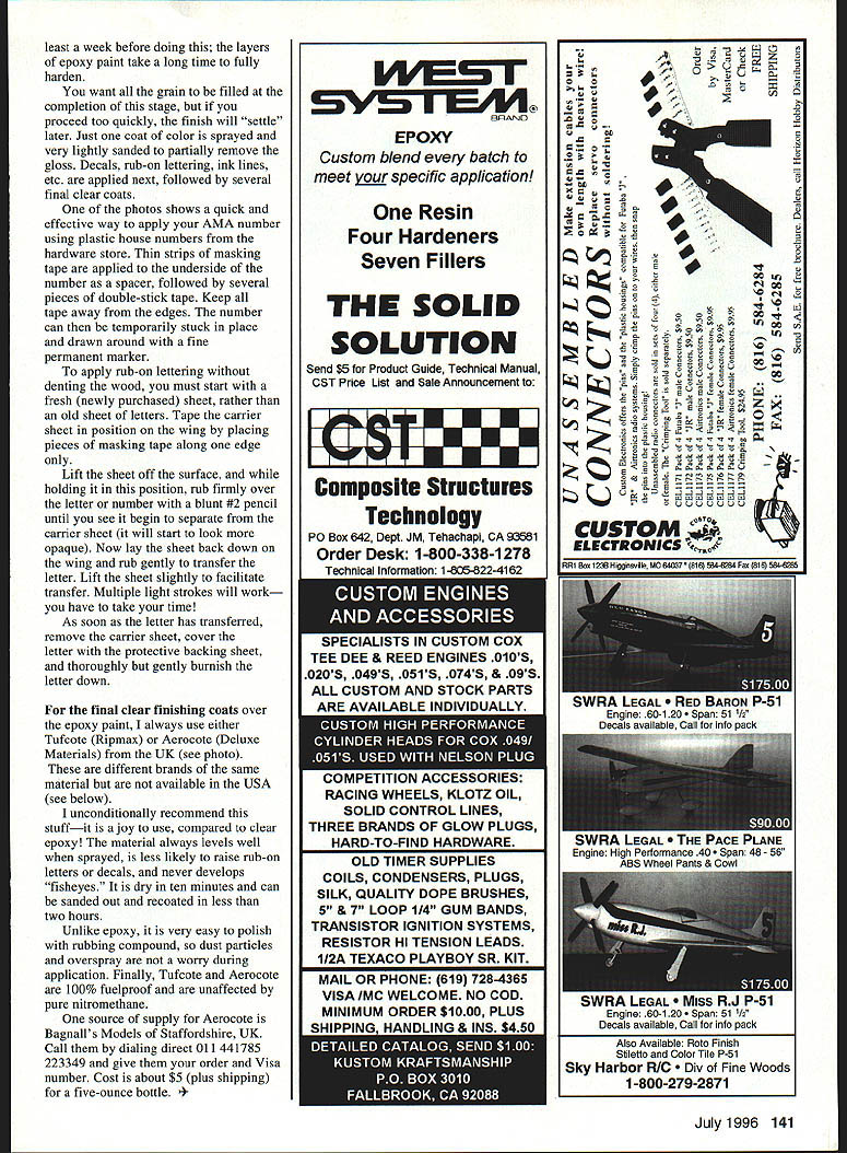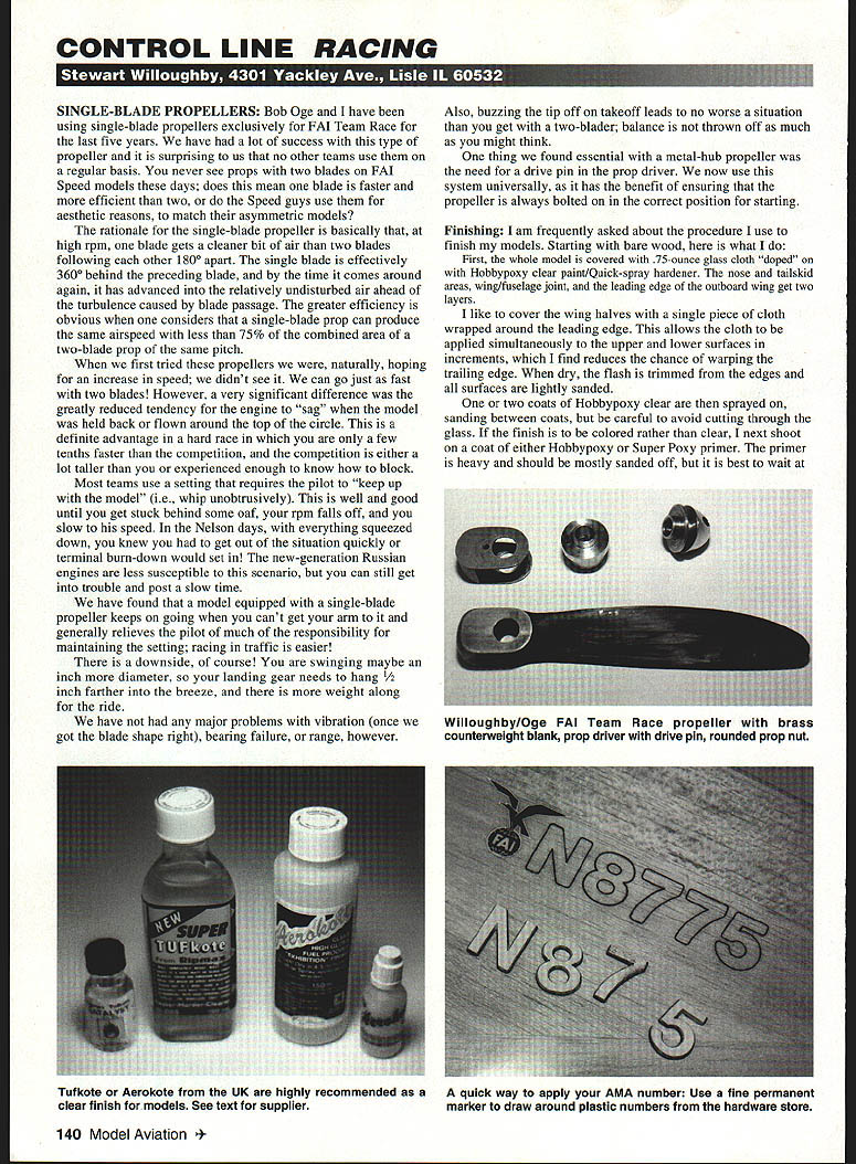 CONTROL LINE RACING i q34'rIiuh SINGLE-BLADE PROPELLERS Bob Oge have using single-blade propellers exclusively FAL Team Race last five years have lot success type propeller surprising us no other teams use regular basis never see props two blades FAI Speed models days does mean blade faster efficient two Speed guys use aesthetic reasons match asymmetric models rationale single-blade propeller basically high rpm blade gets cleaner bit air two blades following other 1800 apart single blade effectively 3600 behind preceding blade time comes around again has advanced relatively undisturbed air ahead turbulence caused blade passage greater efficiency obvious considers single-blade prop can produce same airspeed less 75% combined area two-blade prop same pitch first tried propellers naturally hoping increase speed didnt see can go just fast two blades However very significant difference greatly reduced tendency engine sag model held back flown around top circle definite advantage hard race few tenths faster competition competition either lot taller experienced enough know block Most teams use setting requires pilot keep up model ie whip unobtrusively well good until get stuck behind some oaf rpm falls off slow speed Nelson days everything squeezed down knew get out situation quickly terminal burn-down would set new-generation Russian engines less susceptible scenario can still get trouble post slow time have found model equipped single-blade propeller keeps going cant get arm generally relieves pilot much responsibility maintaining setting racing traffic easier downside course swinging maybe inch diameter landing gear needs hang 1/2 inch farther breeze weight along ride have major problems vibration once got blade shape right bearing failure range however Also buzzing tip off takeoff leads no worse situation get two-blader balance thrown off much might think thing found essential metal-hub propeller need drive pin prop driver now use system universally has benefit ensuring propeller always bolted correct position starting Finishing am frequently asked about procedure use finish models Starting bare wood what First whole model covered 75-ounce glass cloth doped Hobbypoxy clear paint/Quick-spray hardener nose tailskid areas wing/fuselage joint leading edge outboard wing get two layers like cover wing halves single piece cloth wrapped around leading edge allows cloth applied simultaneously upper lower surfaces increments find reduces chance warping trailing edge dry flash trimmed edges surfaces lightly sanded two coats Hobbypoxy clear sprayed sanding between coats careful avoid cutting through glass finish colored rather clear next shoot coat either Hobbypoxy Super Poxy primer primer heavy should mostly sanded off best wait 140 Model Aviation oughbylOge FAI Team Race propeller brass counterweight blank prop driver drive pin rounded prop nut Tufkote Aerokote UK highly recommended quick way apply AMA number Use fine permanent clear finish models See text supplier marker draw around plastic numbers hardware store least week before doing layers epoxy paint take long time fully harden want grain filled completion stage proceed too quickly finish will settle later Just coat color sprayed very lightly sanded partially remove gloss Decals rub-on lettering ink lines etc applied next followed several final clear coats photos shows quick effective way apply AMA number using plastic house numbers hardware store Thin strips masking tape applied underside number spacer followed several pieces double-stick tape Keep tape away edges number can temporarily stuck place drawn around fine permanent marker apply rub-on lettering denting wood must start fresh newly purchased sheet rather old sheet letters Tape carrier sheet position wing placing pieces masking tape along edge Lift sheet off surface holding position rub firmly over letter number blunt #2 pencil until see begin separate carrier sheet will start look opaque Now lay sheet back down wing rub gently transfer letter Lift sheet slightly facilitate transfer Multiple light strokes will work have take time As soon letter has transferred remove carrier sheet cover letter protective backing sheet thoroughly gently burnish letter down final clear finishing coats over epoxy paint always use either Tufcote Ripmax Aerocote Deluxe Materials UK see photo different brands same material available USA see below unconditionally recommend stuffit joy use compared clear epoxy material always levels well sprayed less likely raise rub-on letters decals never develops fisheyes dry ten minutes can sanded out recoated less two hours Unlike epoxy very easy polish rubbing compound dust particles overspray worry during application Finally Tufcote Aerocote 100% fuelproof unaffected pure nitromethane source supply Aerocote Bagnalls Models Staffordshire UK Call dialing direct 011 441785 223349 give order Visa number Cost about $5 plus shipping five-ounce bottle SVSrEA4 BPArJO EPOXY Custom blend event batch meet specific application Resin Four Hardeners Seven Fillers THE SOLID SOLUTION Send $5 Product Guide Technical Manual CST Price List Sale Announcement Composite Structures Technology P0 Box 642 Dept JM Tehachapi CA 93581 Order Desk 1-800-338-1278 .IMLi uN TEE DEE & REED ENGINES 010S 020S 049S 051S 074S & 09S ALL CUSTOM AND STOCK PARTS ARE AVAILABLE INDIVIDUALLY S Am6SI COMPETITION ACCESSORIES RACING WHEELS KLOTZ OIL SOLID CONTROL LINES THREE BRANDS OF GLOW PLUGS HARD-TO-FIND HARDWARE OLD TIMER SUPPLIES COILS CONDENSERS PLUGS SILK QUALITY DOPE BRUSHES 5 & 7 LOOP 114 GUM BANDS TRANSISTOR IGNITION SYSTEMS RESISTOR HI TENSION LEADS 112A TEXACO PLAYBOY SR KIT MAIL OR PHONE 619 725-4365 VISA IMC WELCOME NO COD MINIMUM ORDER $1000 PLUS JIDOII Alao Available Roto Finish Stiletto Color Tile P-Si Sky Harbor R/C Fine Woods 1-800-279-2871 July 1996 141 AC 2 0 00 cr1 C 0 0 0 0 0 0 N C o0 0~4J0 a-0 -CT 0 0 0 0 0 mg ot0 t u 1 Ge .00 L o o 100 F a0 QQQQQQQ CUSTOM o ELECTRONICS LEGAL BARON Engine 60-