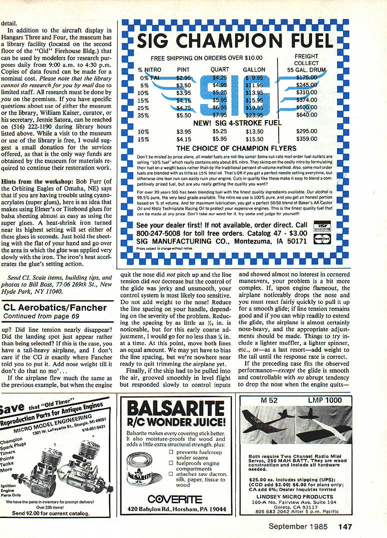 jii Scale Bill Boss SCALELIKE construction need always accomplished building up structure piece piece some cases scaleike structure can cut solid block case point rudder construction shown accompanying photos first step cut out rudders basic shape solid block wood instance piece 4 x 11 x l-in-thick planking Now carve rud der its exact shape size rudder sanded out very smooth cover 3A-oz glass cloth resin After curing excess cloth cut away sanding done again application resin may satis factory purposes second coat resin will fill cloth pores better provide stronger final structure Sand out second coat resin necessary ready create scale structure next step lay out ribpattern other structural features carved rudder close real planes structure can good three-view drawings have much type detail shown care fully mark areas removed accompanying photos shows darkened areas structure being cut Out Dremel saw Please note cutting out unwanted areas trailing edge rudder should held up blocked such way keep rudders centerline parallel saw table will keep cuts straight both sides rudder After unwanted material has removed completing rudder mat ter covering applying much detail deem necessary project instance rudder covered silk rib-stitching tapes put place trim tab control rod hinges installed can seen sec ond photo trim tab hinges con trol rod made piano wire bits pieces scrap aluminum aluminum tubing odd 00-90 nut 1/32 alumi num rivets made look like screws flattening scoring heads put together dab two five-minute epoxy final photo shows completed painted rudder Also seen picture running light installation 1 volt grain-of-wheat bulb rod sticking out top rudder will rudder hinge pin installed plane rudder finished meas ured l04-in high 3%-in wide its widest part weighed 15 ounces does method con struction make lightness also provides model component very strong will warp easily type construction very suitable Continued page 146 68 Model Aviation eyes tell story 8-year-old Justin Davies West Babylon NY Intent taking detail Bob Benders Indoor Rubber Scale mode 1916 RAF experimental reconnaissancelbomber planean RE-a model 150 display Long Islands Cradle Aviation Museum model show details about museum s research library visiting hours read Bill Boss comments months column Bill thought might Interested seeing made rudder latest project Scale P51 Mustang Scaiet1pe construction usedbut done easy wayl L rudder has carved baisa plan k fiberglass cloth resin appi marked up cutouts Biii drilled hole middie cutout area could get biade Dremei jigsaw action cut out areas jigsaw Center photo shows fabric covering rib tapes Instalied weii trim tab its control rod Last photo R completed painted ruddercomplete running light Hinge pin sticks out top finger pressure released Add weight nose tail necessary achieve desired balance point Flying Hook up control lines 26 ft long Check AMA rule book pages 17 18 recommended line-ending methods Make sure elevator moves freely response control inputs minimum tension lines Dont fly near overhead power lines takeoff have helper hold model fuselage run 20 25 feet launch model air level attitude landing anticipate fuel about run out fly model level about shoulder height engine quits let model glide landing applying up-elevator just prior touching down Should unfortunate crash take place will amazed resistant model damage event really bad crash breaks wing no reason dismay 5-mm epoxy right field can glue wing pieces together repair will hardly visible KEY ThERE IT osing let say afew words about friend Everett shown pictures kindest caring people Ive ever met does let mental retardation term doesnt exactly seem right him interfere bona fide interest aviation willingness help out example us can leam benefit CL Scale/Boss Continued page 68 models elevator cloth paper covering applied Scale documentation source Over weekend May 18-19 1985 pleasure attending model airplane static show put Cradle Aviation Museum located old Mitchel Air Field Hangars Three Four Garden City New York show put Nassau Flyers LI Condors RC model airplane clubs cooperation museums volunteer staff over 150 RC FF CL Scaie models display show helped draw several hundred visitors normal weekend first its kind museum expected annual affair now enjoyed seeing models display interested museum scaie documentation standpoint would like pass following information modelers unmediate New York CityLong Island area might visiting William Kaiser Commander USN Retired served naval aviation during World War II now museums curator indicated museum open public Friday Satur day Sunday admission free basic reason weekend-only opening museum staffed community volunteers over see activities during visiting hours also engage maintenance restoration full-scale aircraft museum other days during week museum contains quite number planes would interest Scale modelers scale detailing Planes display cover aviation Wright BrQthers era present day jet fighters course planes display part shaping history aviation Long Island making Cradle Aviation Planes display include Spirit St Louis actual plane flown around country 50th anniversary Lindberghs famous flight well several planes built Grumman Republic Aviation Corporations Among planes beautifully restored P-47 Blue Angels version Fl lA Tiger F9F Cougar F-84F Thunderstreak F-105B Thun derchief Some older vintage planes include Jenny JN-4 Thomas Morse Scout S4C PT-22 planes available extensive picture-taking examination scale Bucker Jun gmeister 049 Engine ingspan Biplane Suitable 2-4 Channel R/C systen. classic its kind As agile biplane aerobatics As model really performs excellent planform dureble enjoyable ship fly RIC confect events meve get rehele line vivId lavvrites Kit tith @ Please seed see icr var Flyline Calaing $2995 Pheen 17031 273-9593Onalere Oistribatvrn invited FLYLINE MODELS INC PO Box 2136 Fairfax VIrginia 22031 146 Model Aviation VINTASE -C PLANS cOISOLIDATED PUY-5A CATALINA 9