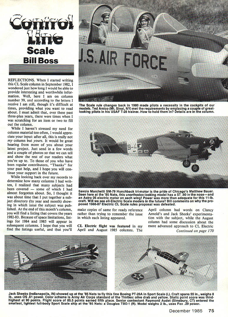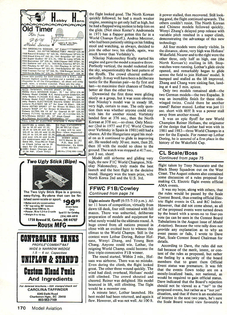 Scale Bill Boss REFLECTIONS started writing CL Scale column September 1982 wondered just long would able provide interesting worthwhile infor mation Well am column number 39 according letters receive am still though its difficult times providing what want read about must admit over past three-plus years times scratching item two fill out column havent stressed need column material too often would appre ciate input after really column yours would great hearing about latest project Just send few words couple photos can tell show rest readers what youre up have regular contributors Thanks past help hope will con tinue support future looking back over records determine columns writ ten realized subjects covered almost forgotten about So thought about time put together sub ject directory year month show ing issue subject pub lished end months column will find listing covers years 1982-83 Because space limitations list ings 1984 1985 will appear subsequent columns hope will find listings useful youll make copies same ready reference rather trying remember issue listing appeared CL Electric flight featured April August 1985 columns April column words Clancy Arnolds Jack Sheeks experimenta tion subject August column some discussion about advanced approach CL Electric Continued page 170 Jack Sheeks IndianapolIs IN showed up 85 Nats fly fine Boeing PT-26A Sport Scale L Craft spans 55 weighs 8 lb uses OS 61 power Color scheme Army Air Corps standard Thirties olive drab yellow Static point score third highest 90 points Flight score 855 points earned fifth place Senior contestant Raymond Audet Simsbury CT entered smallest lightest fullbody Sport Scale ship 85 Nats Douglas TBD1 R Model weighs 2 lb uses Fox 29 power December 1985 75 Scale rule changes back 1980 made pilots necessity cock pits models Ted Amico Mt Sinai NY met requirements em lacing couple great looking pilots USAF T28 trainer hold et ails column Savola Marchetti SM79 Hunchback tn-motor pride Chicagos Matthew Bauer Seen 85 Nats unorthodox-lookIng model has ST 60 noseand Astro 05 electric motor wing Power adequate 11-lb craft Will see all-Electric Scale models future Bill comments pro posed 198687 Electric CL Scale rules proposal defeated HO~ Horn Old Timer Jki AtomLOAZOS R GAS MODEL cIliodcL &uig RECORD BREAKER 1941 BROOKLYN DODGER 56 Cabin EWEST0 Retail $52 95"INTRODUCTORY PRICE0 039GB 1936 Recard Breaker- 96 $69 56 lO39Zipper-54$5356 1938 Kloud King 63 $42 36 1941 Brigidier 56 $4076 1941 Super- Quaker 70 512 76 1940 So Long 50s3aja6 1936 Boccaneer 69 $59 96 l9OaClipperMKl 7254156 1937 Dallaire taa $75 16 1935 Miss America 84 $7196 1941 Playboy Sr 80 $51 14 1991 Playboy Jr 54 $3116 1936 Powerhouse a4 553 56 1990 Sailplane 78 58976 1938 Trenton Terror 72 $40 76 1945 Ranger 46$3196 1939 Korda Wake 94 $19 16 Mercury 72 6 kits qualrfy SAM events FF & RIG feature highest quolity machine cut & sanded parts Superior Competition sheet strip wood wire & window material Plans ore orig PF hut models easily Convertiblo 3eh It/C KITS Sailplanes Electric power Gas Hobby Horn SENSOAR Glider 76 $1805 Midway Model GNOME RIG Hand Launch Clider$290t Jolly Models FLINGER RIG HLG 58 Span$2950 Midway Model FAST EDDIE Aerobatic /115 Elec$190t Jolly Models ELECTRICUS Electric Glider 65s$32St Leisure PLAYBOY SR 67 Gear 05 Elect $3aOt Astro ASTRO SPORT 37 Direct 05 Elect 522St Leisure WASP 37 Direct 05 Electrics$2250 Midway ULTRA MK IV a6 Geared 04 EP $3960 Midway FLYING QUAKER 84 40 45 4 stroke $6476 46s/Midway DENNY JR 72 Alum Camel$6396 4ks/Midwav BUZZARD BOMBSHELL 72$5196 FULL LINE OF ELECTRIC SYSTEMOt Parts AvarI SHIPPING & IgANULIINI Up $800 add $150 $801 $2000 add $225 $2001 $4500 add $300 $4501 $7000 add $350 aed over $7000 add $4 00 CA Addressees add 6% tao Send MO Visa/MC9-rEap Check lallow up 30 days CK clearancel COD Boact Charges plus $1 dl Cash Only 54 Page BJATALUUUBI $200 PP/tot Class copy will sent free-when requested order HOBBY HORN 10173 Moran St [A] PO Box 2212 Westminsler Ca 92604 17191 0938311 [AftHrs 719 0951203] Two Ugly Stick groovy easy-flying By-plane can fin ished semi-scale sport a ply construction 70 top wing 6W bottom Direct Sales Wing Area 1290 sq in Only Power 75 124 2 cycleSeed Si far Cataleg Weight9to 10 lbs 216 484-6810 1728 Bywood SE Canton OH 44707 RoUSH MFG flight looked good North Korean quickly followed much weaker engine seeming get half high flapped wing section help him glide since Kosters Andromeda 1971 has flapper gotten far World Champs flyoff Andras Meczner patiently sitting folding stool watching always decided join other two climb again much lower Verbitskys Nikolay Nakonechny finally started engine gave model massive throw Perfectly vertical model rocketed sky unquestionably best pattern flyoffs crowd cheered enthusi astically may well have deliberate tactic Russian pairto fly first lastto maximize chances finding better air other two Downwind first three gliding nicely group soon obvious Nikolays model steady lift very high certain max ques tion whether anyone could stay him another round Verbitsky landed first 376 sec North Korean 378 secso close Only Mecz ner 2nd 1977 FiG World Champ over Verbitsky Spain 1981 still chance Hungarians urged mQd el continued glide improving air needed 30 sec 20 10 model close ground watch stopped 417 sec just 3 sec short Model still airborne gliding very high new Fl C World Champion Nik olay Nakonechny truly made best launch best flight decisive round Hungary won team prize North Korea 2nd US 3rd FFWC Fl B/Cowley Continued page 74 Eight-minute flyoff 655-710 pm Af ter 11 hours competition virtually dawn till dusk four still remained full maxes unhurried deliberate preparation models equipment what surely would ultimate round huge crowd nations pressed close excited buzz witness climax World Champs Still contest Lothar Doring Reiner Hof sass Wenyi Zhang Young Bern Chang Anyone could win Lothar reigning World Champ could become first triple-consecutive F 1 B winner round started 