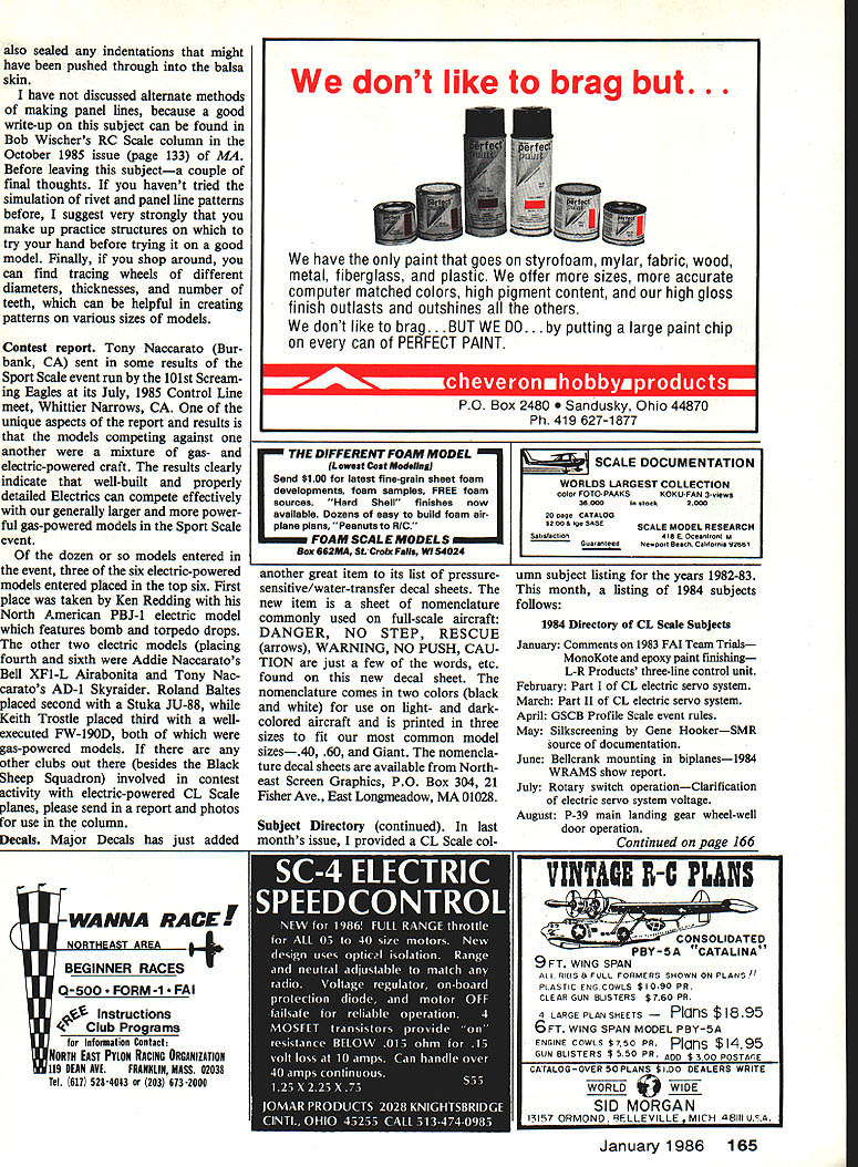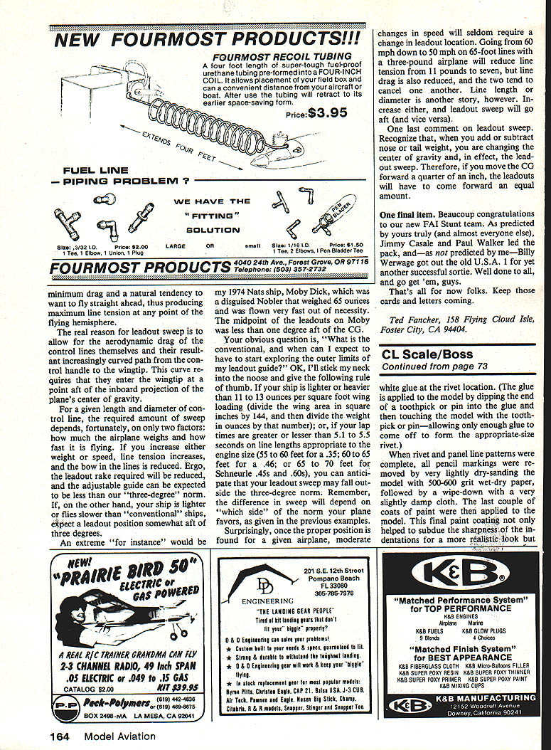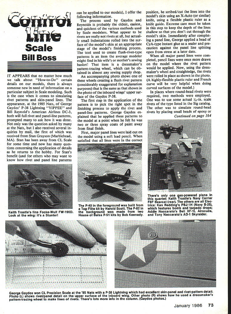 iiii Scale Bill Boss IT APPEARS no matter much talk about How-to-Do certain details models always someone new need information particular subject Scale modeling Such case comes simulating rivet patterns skin-panel lines appearance 1985 Nats George Gaydos P-38 Lightning YIPPEE Bill Reynolds American Airlines DC-3 both will full rivet panel-line patterns prompted ask done question asked Nats also received several quiries mail first received Stan Grayson Marblehead MA Stan has away CL Scale some time now has ques tions concerning application details returns hobby Stans benefit others may want know rivet panel line patterns can applied models offer following information process used Gaydos Reynolds probably oldest easiest quickest various methods used Scale modelers What appear rivets really rivets actual ly small indentations rolled sur face models skin appropriate stage models finishing process tool used create flush-rivet-type patterns item average modeler might find wifes mothers sewing basket item dressmakers pattern-tracing wheel can ob tained almost sewing supply shop An accompanying photo shows wheels creating flush rivet pattern considerably exaggerated explanation purposes same shown photo inboard wings upper sur face Gaydos P-38 first step application pattern pick right spot finishing process apply rivet panel-line patterns George Gaydos ex plained applied patterns model point felt two three spray coats paint away final finish First major panel lines laid out model using soft lead pencil satisfied lines correct position scribed/cut lines models skin using X-Acto similar knife using flexible plastic ruler knife guide Extreme care must taken step keep depth lines shallow dont cut through models skin Immediately after complet ing panel line George applied bead CyA-type instant glue sealer pre caution against panel line splitting open stress later date major panel lines com pleted pencil lines once drawn model rivet pattern would applied Now using dress makers wheel straightedge rivets rolled place shown photo highly-flexible plastic ruler French curve will very helpful doing curved surfaces model places round-head rivets required two methods employed use some actual A2-in scale rivets type listed Sig catalog other simulate round-head rivets placing small beads epoxy Continued page 164 George Gaydos won CL Precision Scale 85 Nats P-38 Lightning excellent skin-panel rivet-pattern detail Photo 1 shows rivetlpanel detail upper surface inboard wing Other photo R shows used dressmakers pattern-tracing wheel make lines rivets Theres lots info column Gaydos photos January 1986 73 Keith Trostles fine Focke-Wuif FW1900 Look wing its Stunter P40 foreground built Top Filte kit Harold Scott P82 back g round made two House Balsa P51 kIts Bob Kennedy Theres gas-powered plane quartet Keith Trostles Navy Carrier F8F Bearcat rear others Elec trics Ken Reddings PBJ1H Navy 525 features bomb torpedo drops Addle Naccaratos Bell XFi Alracuda Tony Naccaratos AD-i Skyraider NEW FOURMOST PRODUCTS! FOURMOST RECOIL TUBING four foot length super-tough fuel-proof urethanetubing pre-formed intoaFOUR-INCH COIL allows placement field box can convenient distance aircraft boat After use tubing will retract its earlier space-saving form Price$3 95 FUEL LINE PIPING PROBLEM Cf Size 3 32 0PrIce 5200 1 Tee 1 Elbow un Plug WE HAVE THE LARGE SOLUTION ORemailSize 1/16 IDP1CC 8150 1 Tee 2 Elbows Pen Bladder Tee __4040 24th Ave Forest Grove OR 97116 Telephone 503 357-2732 Fij us-v iju PROD UCTS minimum drag natural tendency want fly straight ahead thus producing maximum line tension point flying hemisphere real reason leadout sweep allow aerodynamic drag control lines themselves result ant increasingly curved path con trol handle wingtip curve re quires enter wingtip point aft inboard projection planes center gravity given length diameter con trol line required amount sweep depends fortunately two factors much airplane weighs fast flying increase either weight speed line tension increases bow lines reduced Ergo leadout rake required will reduced adjustable guide can expected less three-degree norm other hand ship lighter flies slower conventional ships e*pect leadout position somewhat aft three degrees An extreme instance would 1974 Nats ship Moby Dick disguised Nobler weighed 65 ounces flown very fast out necessity midpoint leadouts Moby less degree aft CG obvious question What conventional can expect have start exploring outer limits leadout guide OK Ill stick neck noose give following rule thumb ship lighter heavier 11 13 ounces per square foot wing loading divide wing area square inches 144 divide weight ounces number lap times greater lesser 51 55 seconds line lengths appropriate engine size 55 60 feet 35 60 65 feet 46 65 70 feet Schneurle 45s 60s can antici pate leadout sweep may fall out side three-degree norm Remember difference sweep will depend side norm plane favors given previous examples Surprisingly once proper position found given airplane moderate changes speed will seldom require change leadout location Going 60 mph down 50mph 65-foot lines three-pound airplane will reduce line tension 11 pounds seven line drag also reduced two tend cancel another Line length diameter another story however crease either leadout sweep will go aft vice versa last comment leadout sweep Recognize add subtract nose tail weight changing center gravity effect leadout sweep Therefore move CG forward quarter inch leadouts will have come forward equal amount final item Beaucoup congratulations new FAI Stunt team As predicted yours truly almost everyone else Jimmy Casale Paul Walker led pack andas predicted meBilly Werwage got out old USA 1 yet another successful sortie Well done go get em guys Thats now folks Keep cards letters coming Ted Fancher 1S8 Flying Cloud Isle Foster City CA 94404 CL Scale/Boss Continued page 73 white glue rivet location glue applied model dipping end toothpick pin glue touching model todth pick pinallowing enoug
