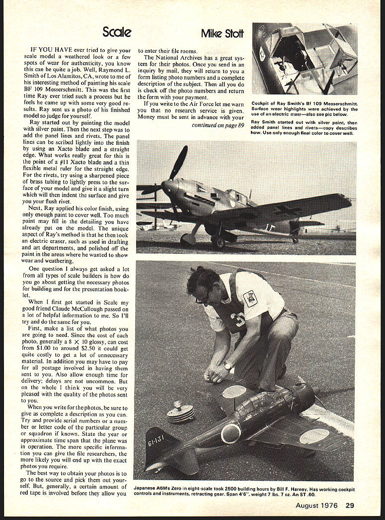 Scale IF YOU HAVE ever tried give scale model weathered look few spots wear authenticity know can quite job Well Raymond L Smith Los Alamitos CA wrote interesting method painting scale BF 109 Messerschmitt first time Ray ever tried such process feels came up some very good re sults Ray sent us photo finished model judge yourself Ray started out painting model silver paint next step add panel lines rivets panel lines can scribed lightly finish using Xacto blade straight edge What works really great point #11 Xacto blade thin flexible metal ruler straight edge rivets try using sharpened piece brass tubing lightly press sur face model give slight turn will indent surface give flush rivet Next Ray applied color finish using enough paint cover well Too much paint may fill detailing have already put model unique aspect Rays method took electric eraser such used drafting art departments polished off paint areas wanted show wear weathering question always get asked lot types scale builders go about getting necessary photos building presentation book let first got started Scale good friend Claude McCullough passed lot helpful information So Ill try same First make list what photos going need Since cost photo generally 8 lossy can cost $100 around $250 could get quite costly get lot unnecessary material addition may have pay postage involved having sent Also allow enough time delivery delays uncommon whole think will very pleased quality photos sent you write photos sure give complete description can Try provide serial numbers num ber letter code particular group squadron known State year approximate time span plane operation specific informa tion can give file researchers likely will end up exact photos require best way obtain photos go source pick out self generally certain amount red tape involved before allow Mike Stolt enter file rooms National Archives has great sys tem photos Once send inquiry mail will return form listing photo numbers complete description subject check off photo numbers return form payment write Air Force let warn no research service given Money must sent advance continued page 89 Ray Smith started out silver paint added panel lines rivetscopy describes Use enough final color cover well August1976 29 Cockpit Ray Smiths Bf 109 Messerschmitt Surface wear highlights achieved use electric eraseralso see pic below Japanese A6Ms Zero eightscale took 2500 building hours Bill F Harney Has working cockpit controls instruments retracting gear Span 46 weight 7 lbs 7 oz An ST 60 pushrods landing points earned notand comes wave have landing judge timer could also serve judge Shedding parts flipping over would still automatically render zero landing points should sailplanes integrity question due hard landing making adjust ments plane flier would challenged immediate launch flier refused would zero landing points launch could simple shoulderhigh hand launch winch high start reduced line length set up test thought cocked wing cracked tail section earning no landing points would encourage approaches landings could graceful planes July thermal Support FAI team address Rt 2 Box 490 Plainfield IL 60544 CL Scale/Stott continued page 29 order descriptions hands file researcher must interpret usually works out just fine Listed below addresses some places start looking National Archives Still Photo Branch 7th Constitution NW Washington DC 20408 Department Air Force HQ Aero Space Audio-Visual Service MAC 1221 S Fern St Arlington VA 22202 Naval Photographic Center Command ing Officer Anacostia Naval Air Station Washington DC 20390 Commandant Marine Corps Combat Pictorial Branch Code AO3P HQ Marine Corps Washington DC 20380 Most US Army aviation photos WWII prior years Air Force files later Army aircraft pictures try Commander US Army Audio-Visual Agency Room SAS 18 Pentagon Washington DC 20310 National Air & Space Museum Library Smithsonian Institute Washing ton DC 20560 also has good selection photos available Imperial War Museum Lambeth Road London 5E7 6HZ England have large collection photos particularly WWI English aircraft might good thing check things out advance ordering make sure have photos want available always call write ahead tend stopping own re searching some offices require appoint ments set up advance address 118 E Wheeler St North Mankato MN 56001 mislead modeler some early birds found out models nearly sucked up cloud base tables did turn favor sky clearing up midway through meet leaving usual hazy sunshine virgin rays energy wasted no time setting off some mighty potent lift seemed stick around remainder day idea using electric motors power model aircraft has actually around quite some time concept has applied reasonable success until recently has source power used abundantly initial stimulus came Mattels Super Star made its debut toy market offering relatively light electric power source adaptable little butchering freeflight models recent interest elec tric has prompted development some very fine motors presently being made available hobbyist majority models flown categories Scale Free-Flight RC U-Control used either VL Products system Astro Flight system both beautifully engineered powerplants proof meets results have excellent power suprisingly long motor runs turnout models predomi nently Scale Free-Flight partic ipation categories likely increase being electric rather current trend Thanks pun Bill Stroman Scale handled usual manner models being judged realism flight scale authenticity Scale flights general no less spec tacular always second guessing models intentions occasion ally suicidal winning model event Gotha Taube built master metallurgy Bill Stroman entire nose Bills Taube formed aluminum around balsa enclosing Astro Flights 02 motor sharp touch model slight tendency porpoise take-off model got off times did some very realistic flights Larry Moss placed Longster Monoplane looked very good having through ropes includes Flightmasters electric meet pre vious year Lon