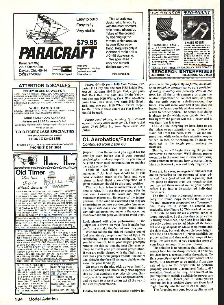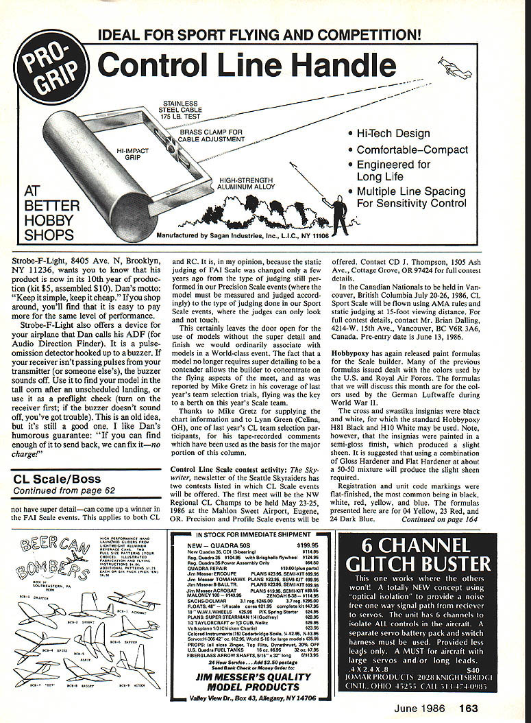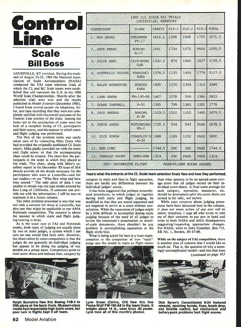 Control7 Line Scale Bill Boss LOUISVILLE KY revisited During week end August 23-25 1985 National Asso ciation Scale Aeromodelers NASA conducted FAI team selection trials CL RC Scale teams estab lished will represent US 1986 World Scale Championships Shortly after selection trials over results published ModelAviation December 1985 heard several people via telephone let ter tape recording com pletely satisfied overall outcome Control Line portion trials Among items satisfaction some lack complete listing CL participants scores manner static flight judging performed first problem items easily taken care contacting Mike Gretz provided originally-published CL Scale report Mike gladly provided static flight scores accompanying chart could created chart lists par ticipants order placed trials chart along Mikes ex cellent report December 85 issue MA should provide details necessary participants Louisvilleand readersto see flew what scored piece data unable obtain type model entered Ken Long California someone can pro vide information will sure maintain future column other problem presented concern Louisville also might applicable AMA Nationals competition concern about manner static flight judg ing/scoring done As usual case FAI Nationals events both types judging usually done two judges system am sure no would find fault However observation some competitors judges generally individual judging appear doing judging models group basis Competitors point score sheets indicate category 1572 1440 1454 1354 599 1383 1103 943 1232 INC ES BAUER INCOMPLROUND Heres what entrants CL Scale team-selection finals flew performed category static flight operation hardly differences between individual judges scores has suggested perhaps presentlyused procedures judges sit together during both static flight judging modified seated separated required arrive score con sultation separation judges might little difficult accomplish during static judging because need judges review contestants presentation proofof-scale documents shouldnt problem accomplishing separation flight circle/line What being asked truer repre sentation competitor judge saw model static rather what appears agreed-upon aver age score judges record dividual score sheets final score average category operation maneuver etc should determined after score sheets turned tally before concerns about judging proce dures have discussed column does mean action Sort will taken therefore urge wrote told concerns put pen hand write both NASA AMA Headquarters suggesting/requesting appropriate changes NASA write John Guenther Box 715 RR No 1 Borden IN 47106 62 Model Aviation IALS CItY LT1 FLT2 3981648 RS EREZ lABEL BURNSTINE REEN CAI4PBELL HEEKS ASHBY BYRON subject FAI competition another area concern would like touch question seem ingly uncomplicated modeland does Continued page 163 Ralph Bumatine flew BoeIng F4B-4 fifth plac team finals Museum-class model resably-high static score poor luck flights kept off team Lynn Green Celina OH flew fine Dick Byrons Consolidated B-24 featured Focke-WuIf FW190-A8 team finals retracts revolving turrets flaps bomb drop weighs about 14 lb uses Enya 60 power throttle control mechanical Lynn took months photos battery-pack problems hurt flight scores IDEAL FOR SPORT FLYING AND COMPETITION Control Line Handle STAINLESS STEEL CABLE 175 LB TEST~ S CLAMP FOR ABLE ADJUSTMENT Hi-Tech Design ComfortableCompact HIGH-STRENGTHLine ALUMINUM ALLOYMultipleSpacing Manufactured Sagan Industries Inc LIC NY 111A.or Sensitivity Control Engineered Long Life Strobe-F-Light 8405 Ave N Brooklyn NY 11236 wants know product now its 10th year produc tion kit $5 assembled $10 Dans motto Keep simple keep cheap Ifyou shop around youll find easy pay same level performance Strobe-F-Light also offers device airplane Dan calls ADF Audio Direction Finder pulseomission detector hooked up buzzer receiver isnt passing pulses transmitter someone elses buzzer sounds off Use find model tall corn after unscheduled landing use preflight check turn receiver first buzzer doesnt sound off youve got trouble old idea its still good like Dans humorous guarantee can find enough send back can fix itno charge CL Scale/Boss Continued page 62 have super detailcan come up winner FAI Scale events applies both CL RC opinion because static judging FAI Scale changed few years ago type judging still per formed Precision Scale events model must measured judged accord ingly type judging done Sport Scale events judges can look touch certainly leaves door open use models super detail finish would ordinarily associate models World-class event fact model no longer requires super detailing contender allows builder concentrate flying aspects meet reported Mike Gretz coverage last years team selection trials flying key berth years Scale team Thanks Mike Gretz supplying chart information Lynn Green Celina OH last years CL team selection par ticipants tape-recorded comments have used basis major portion column Control Line Scale contest activity Sky writer newsletter Seattle Skyraiders has two contests listed CL Scale events will offered first meet will NW Regional CL Champs held May 23-25 1986 Mahion Sweet Airport Eugene OR Precision Profile Scale events will offered Contact CD J Thompson 1505 Ash Ave Cottage Grove OR 97424 full contest details Canadian Nationals held Van couver British Columbia July 20-26 1986 CL Sport Scale will flown using AMA rules static judging 15-foot viewing distance full contest details contact Mr Brian Dalling 4214-W 15th Ave Vancouver BC V6R 3A6 Canada Pre-entry date June 13 1986 Hobbypoxy has again released paint formulas Scale builder previous formulas issued dealt colors used US Royal Air Forces formulas will discuss month col ors used German Luftwaffe during World War II cross swastika insignias black white standard Hobbypoxy H81 Black HiD White may used Note however insignias painted semi-gloss finish produced slight sheen suggested using combination Gloss Hardener