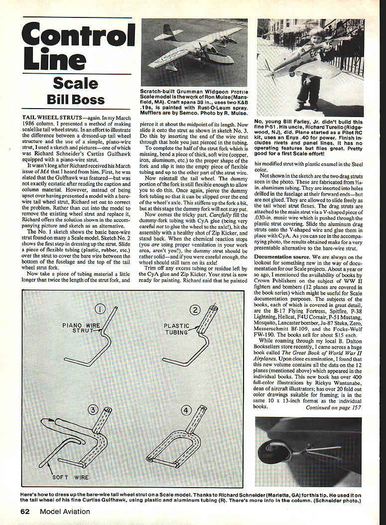 Control Line Scale Bill Boss TAIL WHEEL STRUTSagain March 1986 column presented method making scalelike tail wheel struts effort illustrate difference between dressed-up tail wheel structure use simple piano-wire strut used sketch picturesone Richard Schneiders Curtiss Gulfhawk equipped piano-wire strut wasnt long after Richard received March issue MA heard him First elated Gulfhawk featuredbut exactly ecstatic after reading caption column material However instead being upset over having presented model barewire tail wheel strut Richard set out correct problem Rather cut model remove existing wheel strut replace Richard offers solution shown accom panying picture sketch alternative No 1 sketch shows basic bare-wire strut found Scale model Sketch No 2 shows first step dressing up strut Slide piece flexible tubing plastic rubber etc over strut cover bare wire between bottom fuselage top tail wheel strut fork Now take piece tubing material little longer twice length strut fork pierce about midpoint its length Now slide onto strut shown sketch No 3 inserting end wire strut through hole just pierced tubing complete half strut fork missing bend piece thick soft wire copper iron aluminum etc proper shape fork slip empty piece flexible tubing up other part strut wire Now reinstall tall wheel dummy portion fork still flexible enough allow Once again pierce dummy fork tubing can slipped over end wheels axle stiffens up fork bit stage dummy fork will stay put Now comes tricky part Carefully fill dummy-fork tubing CyA glue being very careful glue wheel axle hit assembly healthy shot Zip Kicker stand back chemical reaction stops using proper ventilation work area arent dummy strut should rather solidand careful enough wheel should still turn its axle Trim off excess tubing residue left CyA glue Zip Kicker strut now ready painting Richard said painted modified strut plastic enamel Steel color shown sketch two drag struts seen photo fabricated 1/16 aluminum tubing inserted holes drilled fuselage forward endsbut glued allowed slide freely tail wheel strut flexes drag struts attached main strut via V-shaped piece 030-in music wire pushed through plastic strut covering Slide aluminum drag struts onto V-shaped wire glue place CyA As can see accompa nying photo results obtained make very presentable alternative bare-wire strut Documentation source always lookout something new way docu mentation Scale projects About ayearor ago mentioned availability books Crown Publishers subject WW H fighters bombers 12 planes covered book series might useful Scale documentation purposes subjects books covered great detail B-17 Flying Fortress Spitfire P-38 Lightning Hellcat F4U Corsair P-i Mustang Mosquito Lancaster bomber Ju-87 Stuka Zero Messerschmitt Bf-109 Focke-Wulf FW-190 books sell about $15 roaming through local B Dalton Booksellers store recently came across huge book called Great Book World War II Airplanes Upon close examination found new volume contains data 12 planes mentioned above appeared individual books new book has over 400 full-color illustrations Rickyu Wantanabe dean aircraft illustrators has over 20 fold Out color drawings suitable framing same 10 x 13-inch format individual booksContinued page 157 62 Modet Aviation Scratch-built Grumman wiageon Protlie Scale model Istheworkof Ron MuiseMans field MA Craft spans 38 uses two K&B 19s painted Rust-O-Leum spray Mufflers Semco Photo R Muise No young Bill Farley Jr didnt build fine P-51 uncle Richard Turello Ridge wood NJ did Plane started Pilot RC kit uses Enya 40 power Finish cludes rivets panel lines has no operating features flies great Pretty good first Scale effort Heres howto dress upthe bare-wire tall wheel strut Scale model Thanksto Richard SchneiderMarietta GA forthis tip used iton tall wheel fine Curtiss Gulfhawk using plastic aluminum tubing R Theres info column Schneider Photo too late 1950 K&B market own 049 Over half-amillion Baby Spitfires sold 1950 Mel next design 045 integral tank called Spitzy followed Royal Spitfire Royal Baby Spitfire 1953 market saturated engines Mel Anderson Manu facturing developing internal problems Thirty thousand dollars large sum days spent fuel facility never turned profit matter time before doors closed assets auctioned Mel went work Henry Engineering designed 100 series Veco 19 29 35 eventually falling out Gil Henry owner business quit work tool engineer firm made gyro components aerospace stayed until retirement 1970 1981 Mel Anderson bestowed modelings highest honor inducted Model Aviation Hall Fame Modeling experienced great loss though recent death Mel An derson June 9 1986 work did much make possible reliable powerful model engines now take granted will miss him big difference between collecting individual books have done cost about 5180 new single volume can obtained sale about $50 havent collected individual books new single volume will great addition aeronautical library savings some $1 30 Something new During past month mailbox contained sample new lubricant might just thing can use balky snap connectors ball joints control rods wheel bearings just about other linkage models lubricant suspended medium penetrates minute openings evaporates readily leaving very fine lubricating coating surface applied product called Slip-It works equally well plastics metals composite materials time read Slip-It should available local hobby shop write Micro Research Inc PO Box 2777 Dan bury CT 06813 information availability Aviation nostalgia Are looking infor mation classic rare aircraft yesteryear suggest drop line Little Hangar run Jack Little 1414 Brewster Ave Redwood City CA 94062 Jack former producer Littlecraft aircraft engine profiles has after several years rest relaxation again put together catalog listing three-views vintage alrcraft engine draw ings Jack also has avallable set 24 profession ally-drawn black-and-white pencil sketches published during WW II Fuller Paint Co drawings feature combat planes such 