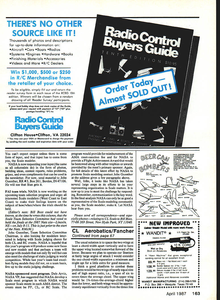 Control Line Scale Bill Boss SPRINGTIME preparation time Bob Emmett Seattle Skyraiders suggested recent Skywriter column spring months good time reflection last years contest performance thought perhaps time could used consider some basic non-rulebook rules use both off flying field ones could make coming competition season successful enjoyable rules Bob spoke general nature would apply events have some modification made apply spe cifically Scale events rules 1 Know rules particular Scale event sure read know rules AMA local event/events being flown Know number laps flight takes make official flight Know proper flying line size weight model Are mufflers required particular contest site Know flight options points 2 Have proper documentation Scale event will participating Re member considerable difference documentation requirements between Sport Precision Scale events Sport Scale maximum six pages docu mentation allowed Precision event has no set limitation sure provide good three- view drawing appropriate proof color markings subject alrcraft model present P-5 lB colors particular fighter squadron sure three-views dont use three-views ofaP-5 lD color documen tation support what have done model cant expect judge though might expert alrcraft judge model memory must judge basis proof provide Regardless whether its Sport Preci sion event good documentation will allow judges best possible job give model best possible score 3 Know equipment works before day contest Dont wait until contest time find out battery dead spare giow plugs home battery leads missing fuel bad fuel filter plugged up engine wont run Make handy checklist basic tools spare parts might need event see flight box before going field Dont fly model first time day meet sure test model its operating features long before contest will know going perform last thought leads us fourth final rule 4 Know limitations practice Re gardless experience level good idea try recognize limitations model own abilities As model sure operating features have built work properly smoothly dependably both ground air Remember models performance instances reflection well person handle controls during flight limitations come play Dont try performing maneuvers etc havent done before day contest level flying experience does allow contest place try first wing over brand new Scale model Last Ieastpractice thing can bring together Practice should done away contest atmosphere burden yourself pressures time limits associated competition Practice will help improve areas deficient will also provide better level confidence big contest day few last thoughts field use pit area engine test stand Exhaust spray noise inconsiderate nuisance Watch out equipment models others moving out pit area timely fashion Flying wires have stepped pit could mean dlsaster flying circle can summarize above following thought chances Scale event can improved knowing rules knowing equipment limitations providing proper documentation practicing FAI Team selection NASA National Association Scale Aeromodelers organiza tion topic dlscussion last months column column wrote about group East Coast modelers dlssatisfaction way team selection trials have held past few years wouldnt ordlnarily write about same subject again soon received NASA newsletter first aimost two years contained information about last months topic also other information indicate Continued page 162 66 Model Aviation Polands Jerry Ostrowaki flew /sscaie Lockheed P-38L-5L0 Aerolympics Power two 61 engInes Scale features Included retracting gear fowier flaps brakes missiles rockets bombs working cockpit instruments air brakes Preston plc Bill Harney Wakefield MA flew Japan ese A6M5 Zero 74 Aerolympics Lakehurst NJ Craft 1/o-scale weighs 7 lb 702 uses ST 60 power Other features include aluminum covering working instru ments cockpit controls retractable landing gear placed third 1970 World Champs Photo John Preston Robert Baisie Endicott NY pleased first-ever Scale projects Spitfire L Vought F4U CorsairR Theywere both made Sterling kits Baisie photos SMHTh ZNDUETNZRD 7555 S GbeI 5od Atmcadeo CA 93422 5I 456-1717 am InvIted join NATIONAL SOARING SOCIETY OFFICIAL AMA SOARING SPECIAL INTERESTGROUP YEARLY NSS SOAR-IN TOURNAMENTS NATION-WIDE EXCELLENCE AWARDS PROGRAM EXCELLENT 81-MONTHLY NEWSLETTER NSS FULLY SUPPORTS ThE F3B SOARING TEAM & 1SF SOARING PROGRAM NSS IS INVOLVED IN ThE ORGANIZATION AND OVERSEEING O ThE SOARING PORTION OF AMA NATS INCLUDING AWARDS BANQUET YEARLY DUES ARE $1200 SPECIAL FAMILY RATES NSS OFFICERS ARE FROM ALL 11 DISTRICTS Information Contact NSS Secretary/Treasurer R T DICK CR0 WLEY P0 Box 440342 Aurora CO 80044 towards supporting category Free Flight Club memberships $1250 per year says year-end renewal slip Should lower rates subscription newsletter am unable say can write Jim Adams SCAMPS Secretary 2538 W Spurgeon Santa Ana CA 92706 inquire accordingly Excuse now go dye some plastic See ya downwind Harry Murphy 3824 Oakwood Blvd Ander son IN 46011 FF Old-Timers/Haught Continued page 62 much wasbin trailing edge down enough Most fliers start i Other trim factors same both methods trim situation think step through NEW FOURMOST PRODUCTS Bulk head Fitting Simple method feed fuel vent tubes through solId bulkheads DrIll hole No lB drIll sIze bulkhead fIrewall up 3/8 thick ProvIdes sealed tank compartment elImInates fuel line chaffIng Color coded easy identIfIcatIon MOULDED NYLON FUELPROOF WeIght 1/2GM EACH SIze 3/32 10 PRICE 2for $250 FOURMOST PRODUCTS 4040 24th Ave Forest Grove OR 97116 Bomb Release Fourmost Bomb-release mechanism SImple lIght weIght device Ideal fun-fly events Fasten unIt plane screws provIded Attach spring-loaded latch thread connect throttle rudder servo CorrosIon problem unit molded nylon sprIng stainless WeIght 1/10 OUNCE PRICE $250 503 357-2732 before attempting change Take easy keep flying Clarence Haught 3226 Honeysuckle Dr Coeur dAlene ID 83814 Hemiptere/Backstrom Continued page 65 techn