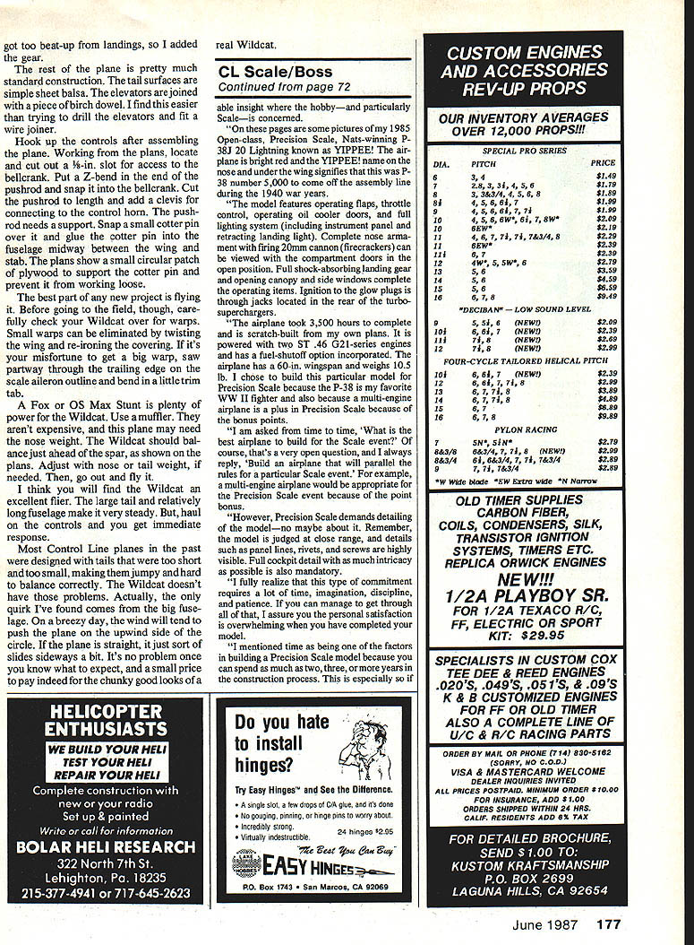 Control Line Scale Bill Boss GUEST MODELER During past few months probably have noticed name George Gaydos Jr Elmwood Park NJ column respect Garden State Circle Burners annual Scale contests Profile Scale rules recently connection comments US FAI CL Scale team-selection program George modelers well-known yet national level well-known Northeast tireless pro moter CL Scale modeling national level George recently fulfilled longtime ambition capturing first place Precision Scale 1985 Westover Nationals 25 years Scale modeling finally Nationals victory George has asked able pass some thoughts comments subject CL Scale modeling months column thoughts comments follow have asked Bill Boss allow speak fellow CL Scale modelers through column subject getting involved CL Scale events competition level am expert subject feel 30 years ofCLmodel buildingandflyingover25 years CL Scale gives knowledgeContinued page 177 Main landing gear strutdetali includes brake hose brake scissors tread tire simu lated machining strut Gaydos photo 72 Model Aviation George GaydoS Eimwood Park NJ won CL Precision Scale 85 Nats Lockheed P-38J Lightning model spans 60 weighs 101/2 lb uses two ST 48 G21 engines Operating features Include flaps throttle control cooler doors lighting system including instrument panel lights retracting landing light shock-absorbing landing gear firing 20mm cannon firecracker working access doors nose armament compartment operable canopy model P-38 mixed armament 50 caliber 20mm automatic weapons skin panel-line rivet detail shows dotheturbochargers Photo byG Gaydos got too beat-up landings added gear rest plane pretty much standard construction tail surfaces simple sheet balsa elevators joined piece birch dowel find easier trying drill elevators fit wire joiner Hook up controls after assembling plane Working plans locate cut out -in slot access bellcrank Put Z-bend end pushrod snap bellcrank Cut pushrod length add clevis connecting control horn pushrod needs support Snap small cotter pin over glue cotter pin fuselage midway between wing stab plans show small circular patch plywood support cotter pin prevent working loose best part new project flying Before going field though care fully check Wildcat over warps Small warps can eliminated twisting wing re-ironing covering its misfortune get big warp saw partway through trailing edge scale aileron outline bend little trim tab Fox OS Max Stunt plenty power Wildcat Use muffler arent expensive plane may need nose weight Wildcat should bal ance just ahead spar shown plans Adjust nose tail weight needed go out fly think will find Wildcat excellent flier large tail relatively long fuselage make very steady haul controls get immediate response Most Control Line planes past designed tails too short andtoo small making jumpy hard balance correctly Wildcat doesnt have problems Actually quirk Ive found comes big fuse lage breezy day wind will tend push plane upwind side circle plane straight just sort slides sideways bit Its no problem once know what expect small price pay indeed chunky good looks real Wildcat CL Scale/Boss Continued page 72 able insight hobbyand particularly Scaleis concerned pages some pictures 1985 Open-class Precision Scale Nats-winning P 38J 20 Lightning known YIPPEE air plane bright red YIPPEE name nose under wing signifies F38 number 5000 come off assembly line during 1940 war years model features operating flaps throttle control operating oil cooler doors full lighting system including instrument panel retracting landing light Complete nose arma ment firing 20mm cannon firecrackers can viewed compartment doors open position Full shock-absorbing landing gear opening canopy side windows complete operating items Ignition glow plugs through jacks located rear turbo superchargers airplane took 3500 hours complete scratch-built own plans powered two ST 46 G21-series engines has fuel-shutoff option incorporated airplane has 60-in wingspan weighs 105 lb chose build particular model Precision Scale because P-38 favorite WW II fighter also because multi-engine airplane plus Precision Scale because bonus points am asked time time What best airplane build Scale event course thats very open question always reply Build airplane will parallel rules particular Scale event example multi-engine airplane would appropriate Precision Scale event because point bonus However Precision Scale demands detailing modelno maybe about Remember model judged close range details such panel lines rivets screws highly visible Full cockpit detail much intricacy possible also mandatory fully realize type commitment requires lot time imagination discipline patience can manage get through assure personal satisfaction overwhelming have completed model mentioned time being factors building Precision Scale model because can spend much two three years construction process especially SPECIAL PRO SERIES DIAPITCHPRICE 63 4$149 728 33*4 56$179 83 3&3/4 4 5 6 8$189 8*4 5 6 6* 7$199 94 5 6 6* 7 7*$199 104 5 6 6W 6* 7 8W$209 106EW$219 114 6 7 7* 7* T&3/4 6$229 116EW$239 11*6 7$239 124W 5 5W 6$279 135 6$359 145 6$459 1556$659 166 7 8$949 DECIBAN SOUND LEVEL 95 5* 6NEW$209 10*6 6* 7 NEW$239 11*7* 8NEW$269 127* 8NEW$299 FOUR-CYCLE TAILORED HELICAL PITCH 10*6 6* 7 NEW$239 126 6* 7 7* 8$299 136 7 7* 8$389 146 7 7* 8$489 156 7$689 166 7 8$989 PYLON RACING 7SN 5*N 8&3/86&3/4 7 7* 8 NEW 8&3/46* 6&3/4 7 7* 7&3/4 97 7* 7&3/4 $279 $299 *289 $289 W Wide bkIe EW Extra wide N Narrow OLD TIMER SUPPLIES CARBON FIBER COILS CONDENSERS SILK TRANSISTOR IGNITION SYSTEMS TIMERS ETC REPLICA OR WICK ENGINES NE WI! 1/2A PLAYBOY SR FOR 1/2A TEXACO RIC FF ELECTRIC OR SPORT KIT $2995 SPECIALISTS IN CUSTOM COX TEE DEE & REED ENGINES 020S 049S 051S & 09S K & B CUSTOMIZED ENGINES FOR FF OR OLD TIMER ALSO COMPLETE LINE OF U/C & RIC RACING PARTS June1987 177 OUR INVENTORY AVERAGES OVER 12000 PROPS! hate install hinges Try Easy Hinges See Difference single slot few drops C/A gist its done No gouging pinning hinge p