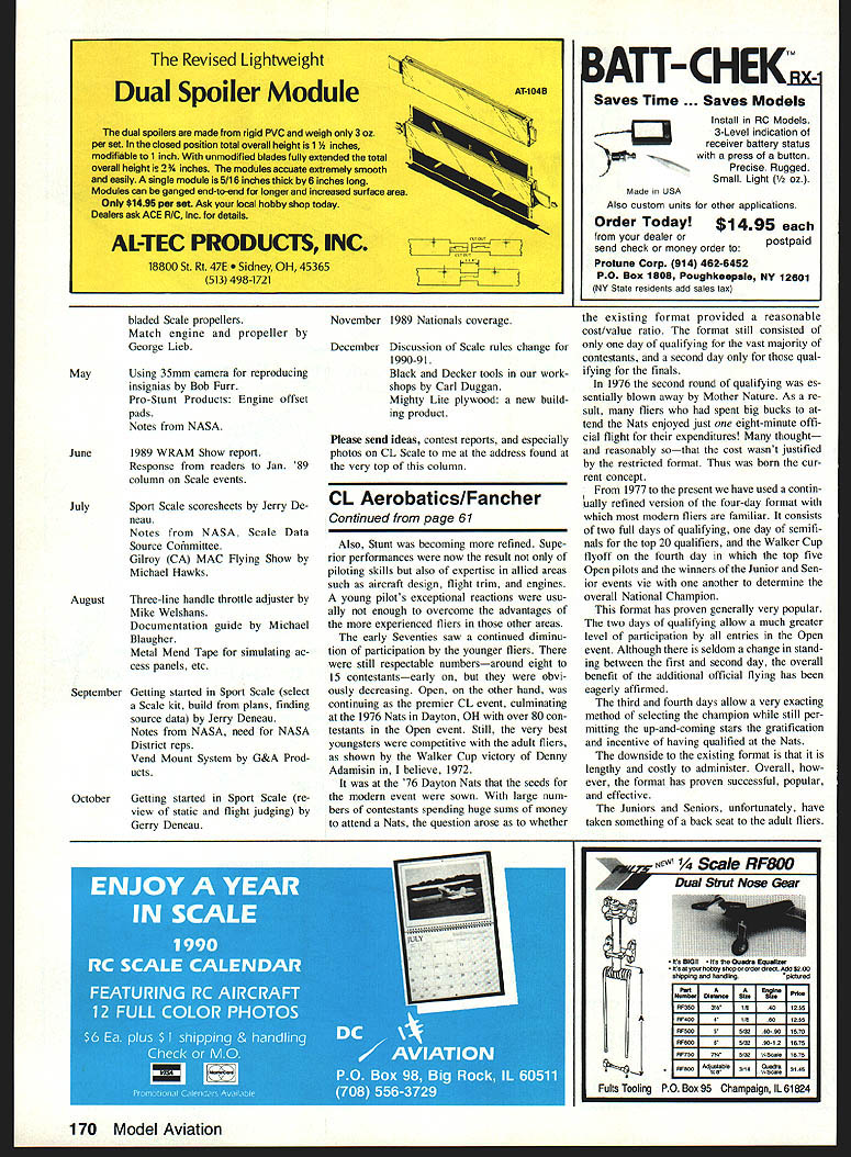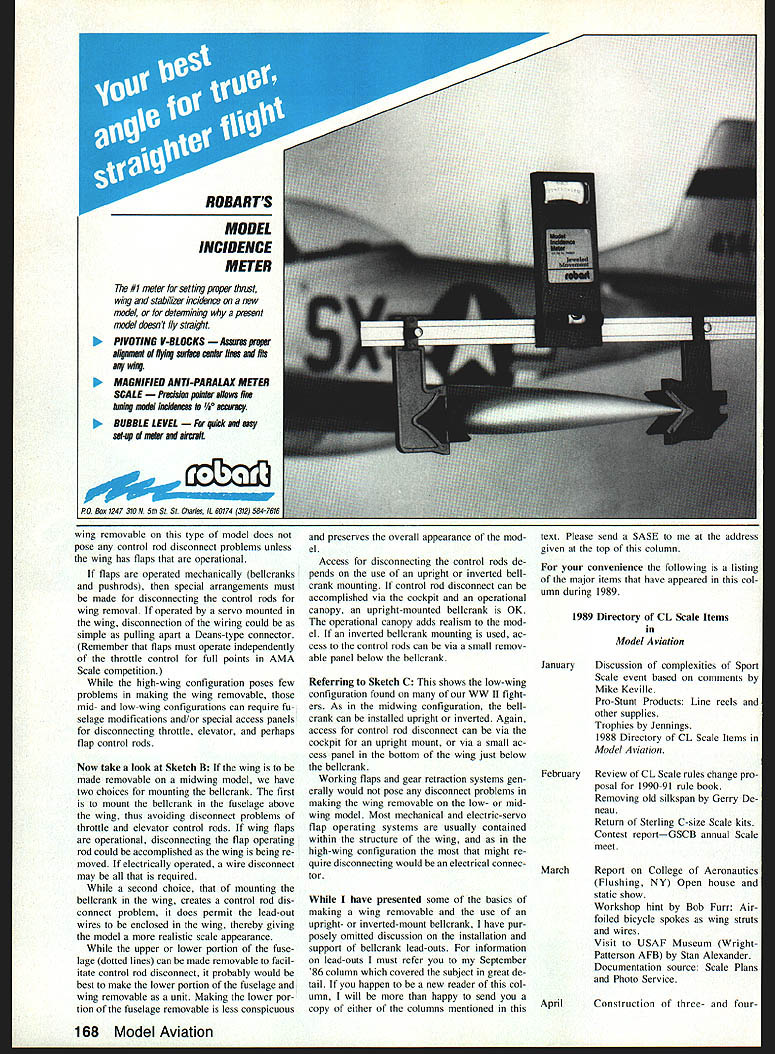 MAJOR TOPIC October December columns getting started Sport Scale covered basics selecting model find ing documentation Static flight judging also reviewed have written about bellcrank placement past month will explore subject little further based ideas taken Gerry Deneaus continuing series articles CL Sport Scale appearing clubs newsletter Probable Cause Emphasis month will converting RC kit CL use decid ing whether models wing will remov able permanently fixed model Trying determine type bellcrank its location generally first step taken conversion RC kit CL use Should bellcrank installed fuselage wing could dictated models wing configuration high-wing midwing low-wing Another very important consideration whether wing will made removable glued permanently place Because larger size models Scale modelers build ing days removable wing has some dis tinct advantages light ever-diminishing capacities forms transportation Also considered type bellcrank upright inverted mounting direction travel throttle control arm engine permanently fixed fuselage have decide what size style bellerank upright inverted would required pro vide proper direction travel engine throttle control However wing made removable must consider access control rod con nections throttle elevator perhaps flaps Before moving let note October 88 column has extensive information suppose could start assumption Scale models would equipped throttle control operated via three-line bellcrank system Throttle control neces sary obtaining maximum flying points com petition also adds greatly flying enjoy- ontinued page 166 ment model wing regardless model configuration high- mid- low-wing 60 Model Aviation Control Line Scale Bill Boss 77-06 269th Street New Hyde Park NY 11040 Want build Scale model can remove wing ease transport mount bellcrank Bill Boss gives us some answers months column Charles Bauers Norridge IL big Precision Scale prototype Douglas Skyraider won 89 Hats Its big enough removable wing Models electronic control system op erates flaps landing gear throttle Jim McCurrachs North Vancouver BC P 51 Mustang features Canadian markings nicely weathered finish Sport Scale entry 1989 Tn-Cities Nats Gerry Deneau Aurora C0 claims worked Sport Scale Curtiss P-6E tween 1957 198831 years placed Douglas DC-3 other name C-47 third 89 Hats Author Bill Boss has R4D Ken Burtons Roberts WA large based several CL Scale columns Marine R40 large enough candi- Gerrys ideas found club newalet date removable wing Good-flying ter Probable Cause photos Sport Scale entry seen 89 Hats month taken Mike Weishans Peifect Stability gyro output reverse switch neutral adjust trimmer precise rudder servo neutral adjustment Airtronics SC-i Precision Ball Bearing Gyroscope System compact helicopter single axis gyro corates advanced technological features out standing ffight performance andi maneuverability Designed easy instal lation setup adjustment SC-i provides superior stability control demand ing flying conditions economically-priced gyro features ball-bearing equipped gimbal regulated gyro motor voltage supply easy mounting connector system convenient gyro setup LLYr tio N N] SEN OR in-flihtonoff operation dual ~AIRTRONICS sensitivity precision SC-i gyro GYRO MIXER BAIT automatically senses movement directs proper command 96252 appropriate servo N mixer amplifier utilizes automatic power source selector Detection Method Hall Effect Sensor SG-1 G offers perfect blend stability per formance compatibility Airtronics RIC systems Standard RONICSIA 11 Autry Irvine CA 92718714 830-s information about Airtronics quality products please call write address above Bird Prey/Baxter Continued page 58 wings being neutrally stable will continue straight last heading established modification should used Control Line model think Symmetrical wing panels made flown cir cles no outside forces encountered extra tension afforded asymmetrical wing arrangement will hold model course Cutting streamer inboard panel however can cause plane swerve circle cut spar holes through engine mounts slightly oversized way spars can removed replaced fairly easily should wings need replaced Push spars through holes center rib slide wing panels guiding lead-out wires through holes Since wing will instantly fold spars should come loose make sure theyre securely glued cores Add strapping tape trailing edge fantail can now assembled elevator hinged using favorite hinging method Slide fantail over trailing edge wing glue securely stall control horn attach pushrod Adjust pushrod controls 300 total travel Cut leading edge away clear engine add ply firewall Add wing tips ribs braces lead-out guide tubes Running lead-outs through tips creates attractive appearance Resist temptation Instead simply glue lead-out tubes bottom tip have replace wing panel leadouts can easily removed wing tip facilitate sliding new panel over lead-out wires smooth airfoil fill dents de pressions spar/foam junction Magic Model Filler light spackling com pound Cover entire plane Fas-Cal favorite low-temperature covering Adjust center-of-gravity coincide center spar sliding en gine back forth necessary Install engineand again dont forget attach restraint cable Flying Bird Prey gives predictable reliable handling no quirks catch off-guard Properly balanced model both stable responsive Like well-designed flying wing itll stantly snap turn Because its larger size Bird probably wont fast previous modelsbut youll hard-pressed find ship gives tighter turns airplane overly touchy Does hunt yes know its tail-heavy Slug gish turns Its nose heavy Does slow down bounce turns has too much control travel Adjust trim ac cordingly adding nose tail weight ad justing control travel until feels right flying style Tail weight can re duced cutting four 1 /2-in lightening holes fantail Lets see cant spark flying wing re vival Build fly Bird Prey should contention some awesome purses becoming avail able Combat matches around coun try Combat fraterni