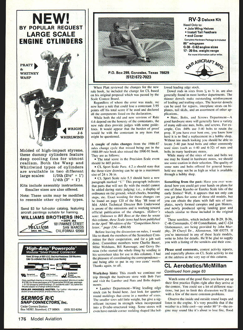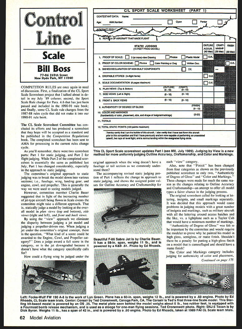 Control Line Scale Bill Boss 77-06 269th Street New Hyde Park NY 11040 COMPETITION RULES once again need discussion First finalization CL Sport Scale Scoresheet project talked about de tail July 89 column second Sport Scale Rule change Para 46 has just passed included 1990-91 rule book finally some CL Scale rule changes 1987-88 rules cycle did make 1990-91 rule book CL Scale Scoresheet Committee has con cluded its efforts has produced scoresheet hope will accepted standard published Competition Regulations book completed scoresheet has sent AMA processing current rules change cycle As youll remember two scoresheet parts Part static judging Part 2 flight judging Part 2 completed scor esheet essentially same published last July Part has changed considerably especially approach static judging committees original approach static judging break model down various sections ie fuselage wing landing gear engine cowl propeller generally way used seeing models judged However committee member Charlie Bauer suggested light increasing number jet-type aircraft being flown Scale events committee might take different approach statically judge model looking over model plan views top bottom side views right left front back views using view approach eliminate disparity between judging jet model judging propeller-driven judging jet under committees original concept question What kind score could awarded Engine Cowl Propeller cat egory Does judge award full score category jet downgraded because doesnt have what category specifically calls could flying wing judged under IL r-jnrvvnrn PAHI 1 CONTESTANT DATk Nuns AgeAMA kmtiuOpen U IRcRAFrTIIAT MADE FUONT STATIC JUDGING 15 FEET FROM MODEL 1 PROOF OF SCALE E 3 nue-vlew Drawing C Photos EPleetlo Model 2 PROOF OF COLOR SCNENE EPhotos C Color Palntlng Dwg 3 SIGNED DECLARATION OF NON-BUILT COMPONENTS QoK 4 DROPABLE STORES In-Itlght Items 5 SCALE DOCUMENTATION 6 pages Msxlnuml 6 PLAN VIEWS Crop & Bottom 7 SIDE VIEWS Left & Right 8 FRONT & BACK ViEWS 9 AUTHENTICITY OF DEGREE OF GLOSS 10 COLOR AND MARKINGS Awntfnentloty oOlOr pIscenielit size end shape Inalgnls/meInlngs kJI101 IrvI tO-iS1010 0-15010 0-1010-10 FINISH 010 0-20 11 TOTALS 12 TOTAL STATIC POINTS 100 poInts maxirtiam hereby ceulily tiM sin tie builder IN sirmalt elms sanity have test Scan tile elruslt prior conWettlon have previously am now capable peulomilng mu usnealeted takeoff two laps level flight ends normal landag wIlNn designated flying dials CL Sport Scale scoresheet updates Part see MA July 1989 Judging View new method uniformly judging Outline Accuracy Craftsmanship Color Markings original approach wing doesnt have fuselage tail section commonly under stand accompanying revised static judging por tion Part reflects change approach static judging shows assigned point val ues Outline Accuracy Craftsmanship view category Also note Finish has changed four categories shown previously published scoresheet two Authenticity Degree Gloss Color Markings changes made much same rea son changes relating Outline Accuracy Craftsmanshipan attempt offer model types fairer chance judging process original scoresheet called looking let tering insignia small markings separately decided approach would cause problems judging models great number insignia markings such military aircraft lettering around access hatches like vs lightplane such Taylor Cub would have minimum number markings Authenticity Degree Gloss felt important committee would require modeler prove painted model high gloss semigloss matte finish Shouldnt penalty putting high-gloss finish model camouflaged should have matte finish Color Markings category includes judging authenticity color placement Continued page 175 Left Focke-Wuif FW 190 A-8 work Lyn Lureen Plane has 60-in span weighs 12 lb powereu y e ou engine Photo uy u Rhoads CL Scale team trials Center Corsair Ted Cronenwett Canoga Park CA Corsair Teds first three-line Scale model Ster ling kit-based model powered 05 25 metal plate seen behind model weighs about 5 lb has rubber feet equipped Fourmost bomb release mechanism used stooge one-man flying sessions Ted Cronenwelt photo Right SNJ-5 Texan Dick Byron Weighs 11 lb has span 42 powered 60 engine Photo Ed Rhoads taken 1989 FAI CL Scale team trials 62 Model Aviation OIJrLINE CRAFT1 FV114 MNSNP Beautiful F-86 Sabre Jet Charlie Bauer has 58-in span weighs 11 lb nnwwrad K&B 61 Phnto Ed Rhoads Bind pushrods cable copper wire slip cable Out tube solder wire pushrods Slip cable back tube fit threaded rod back hook clevis cable belicrank Adjust clevis until correct elevator up-and-down throw achieved Try keep movement smooth can lead-outs lead-out guide can now fit ted Cut delta fins ply locate posi tion epoxy place Apply good ep oxy fillet along full length cable tube make sure stays place Engines cornerstone successful twin installations good engine match Hunt down two 049 engines have good starting charac teristics similar power Check latter tachometer plan placing hotter two engines no two engines absolutely identical output inboard side Bolt engines place mount wheels test balancing Youll have add quite bit lead nose try get opening provided Once model balances add last bit sheeting remove engines wheels give entire airplane good sanding applied seven well-sanded coats clear dope sprayed can auto acrylic enam el achieve high-gloss finish Using variety automotive pinstriping tape great time trimming model windows cut Flying way flying field stop pickup some 35-ft steel flying lines dont have already recommend paved hard dirt flying surface Test run engines struct pit crew hold Avanti fu selage just ahead wing helps keep hands clear prop arcs model released its small wing two engines Avanti moves Out sprightly fashion Besides being drag eraser its also quite crowd pleaser CL Scale/Boss Continued page 62 size shape insignia/markings ap proach overall model considered regardless its type number markings urge review proposed scoresheets direct comments mi