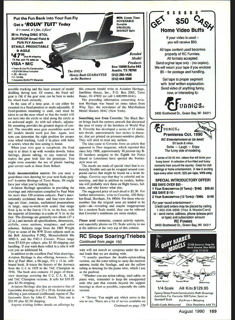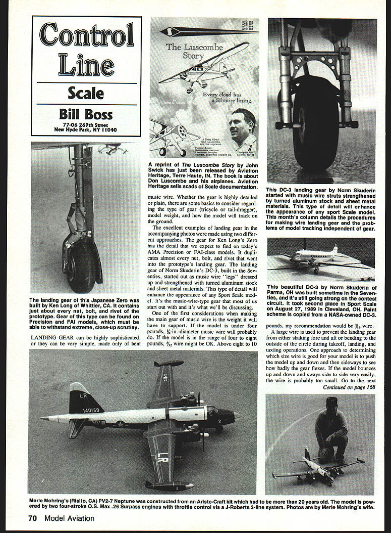 The landing gear Japanese Zero built Ken Long Whittier CA contains just about nut bolt rivet prototype Gear type can found Precision FAI models must able withstand extreme close-up scrutiny LANDING GEAR can highly sophisticated can very simple made bent reprint Luacambe Story John Swick has just released Aviation Heritage Terre Haute IN book about Don Luscombe airplanes Aviation Heritage sells scads Scale documentation music wire Whether gear highly detailed plain some basics consider regard ing type gear tricycle tail-dragger model weight model will track ground excellent examples landing gear accompanying photos made using two differ ent approaches gear Ken Longs Zero has detail expect find todays AMA Precision FM-class models dupli cates almost nut bolt rivet went prototypes landing gear landing gear Norm Skuderins DC-3 built Sev enties started out music wire legs dressed up strengthened turned aluminum stock sheet metal materials type detail will enhance appearance Sport Scale mod el Its music-wire-type gear us start Out its what well discussing first considerations maldng main gear music wire weight will have support model under four pounds A-in-diameter music wire will probably model range four eight pounds %2 wire might OK Above eight 10 DC-3 landing gear Norm Skuderin started music wire struts strengthened turned aluminum stock sheet metal materials type detail will enhance appearance sport Scale model months column details procedures making wire landing gear prob lems model tracking independent gear beautiful DC-3 Norm Skuderin Parma OH built sometime Seven ties its still going strong contest circuit took second place Sport Scale August 27 1989 Cleveland OH Paint scheme copied NASA-owned DC-3 pounds recommendation would 3/ wire large wire used prevent landing gear either shaking fore aft bending outside circle during takeoff landing taxiing operations approach determining size wire good model push model up down sideways see badly gear flexes model bounces up down sways side side very easily wire probably too small Go next Continued page 168 Merle Mohrlngs Rialto CA PV2-7 Neptune constructed Aristo-Craff kit 20 years old model pow ered two four-stroke OS Max 26 Surpass engines throttle control via J-Roberts 3-line system Photos Merle Mohrlngs wife 70 Model Aviation Confrol Line Scale Bill Boss 77-06 269th Sneet New Hyde Park NY 11040 THE BEST FUSELAGE JIG EVER PERIOD Provides Solid Support Accurate Building Rugged Construction 7 Ply Aircraft Plywood Provides Lifetime Use Two Sizes Available Regular Fuselages Up 6 Wide Jumbo Fuselages Up 9 Wide Use Own Building Board Work Bench Base Mount Jig Station Uni-Strut Guide Rails Most Versatile Set-Up Contains Complete Hardware Instructions Including Uni-Strut Information Box 4 Standard Jig Stations 52795 Box 4 Jumbo Jig Stations 1995 TwoS ft long Guide Rails including mounting nuts 2195 IVANS MAGIC GADGET protractor device used Ivan Kristensen accurately measure aileron elevator rudder throw Takes guess work out trimming out airplane quality tool complete instructions log book carrying case1795 PLUG-IN ADJUSTABLE STAB KIT last can optimize stab incidence best flight charac teristics pair glass filled nylon adjusters included provide micro screw adjustment smaller front tube Main tube aluminum matching phenolic socket S695 Include 52 SOlitem UPS esidents Add 6% Sales Tat GATOR RIC PRODUCTS 3713 Pompano Dr acola FL 32514 1 476-8639 PLUG-IN WING ADJUSTER KIT Four glass filled nylon brackets included key wing panels front rear allow accurately adjust panel straight flight Complete hardware & instructions5995 WING TUBE & SOOETS Aluminum alloy tubing plug-in wings Included pair special slip-fit phenolic sockets build wing structure Now size models 718 diax2S 595 Ii dias25 995 11/zdias3S1495 did notice certain maneuvers such Vertical Eight Overhead Eight routine first figure obtained plane would suddenly come out top suc ceeding duplicate maneuver analysis problem time engine dropped off power Well observations after 16 flights Im going continue working combination get familiar setup Theres no question about now understanding what fliers perceiving advantages However Ill need air time before can feel know about pipe will react believe advantages will accrue good pipe combination can get workable setup quickly using known numbers Ill another column fall latest technology Tech tip days so-called bulletproof controls arrow-shaft pushrods norm solving flexing controls other things start show up work way through doing installation Space concern now hack up pristine interior fuselage worry couple things can First its always better plan before cut wood make no guarantee follow premise Take good look plans lay out travel flap-to-elevator pushrod De velop patterns formers consider following need anything just barest outline clear arrow shaft pushrod stiff arrow shaft answer dont So keep thought lets look make formers standard procedure making fuselage formers used to use %-in cross-grained balsa pushrod braces added necessary satisfactory cut out middle isnt much strength left basic approach going employ laminate wood grain layers crossed 30 angle can use either two laminations /16 %2 balsa /32 plywood Using patterns rough out shapes sheets wood point will need flat surface like some plate glass com plete laminating process Take some slow setting CyA glue outline rough formers Place part glue face up glass put other piece top grain desired cross angle Apply heavy pressure until glue kicks now have very stiff former thats ready final trimming Hit jigsaw trim finish up outline sandpaper Ive performed measurements gram scale can barely detect difference weight between laminated part %-in sheet former same shape CL Scale/Boss Continued page 70 largest size repeat test might waste bit wire its cheap price pay model will function properly ground competition maintain highest possi ble score ground handling operations forming main landing gear wire take care se