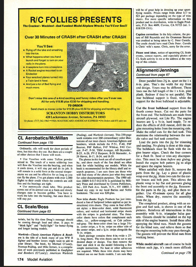 FREE ADVICE Build light better fly ing longer lasting Scale model advice given Doug Dahike Oshkosh WI Doug says An old comment about Scale folks spending much time outside end up nonflyable model still has strong elements truth truth us probably dont give too much thought weight place ment individual parts put Scale models together especially case building kits As Control Liners know invariably have add weight Outer wing tip nose tail balance models Doug says weighing placing parts according weight can reduce amount additional weight required balance purposes Its possi ble save couple ounces weight typ ical Profile Scale kit key Dougs weight reduction process investment good scale Doug uses four-beam Ohaus Centigram scale says scale type can cost $100 seems like large sum money spend weighing model parts its one-time cost lifetime model building Now weight-reduction process Lets use typical Profile Scale kit example Lay out plans table workbench Place parts leading trailing edges wing ribs spars eleva tor surfaces sheeting respec tive places plans Starting wing tips weigh both place heaviest outboard side wing Now weigh set ribs starting tip ribs working toward center wing always placing heaviest rib outboard side wing Lets look leading trailing edges Weigh leading edges select heaviest outboard side Take leading edge se lected outboard side determine end heaviest Block up end leading edge place other scale Note weight Now reverse leading edge again note weight Place heaviest end out board end outhoard wing panel Use same procedure trailing edges whether solid V-sheeted type Weigh piece ends piece always placing heaviest piece end toward outboard end outboard wing panel time should getting idea placing heaviest part end part outboard side thus reducing amount addi tional wing tip weight might needed Use same procedure elevator surfaces wing sheeting fuselage prestamped shaped dont have much control youre making fuselage plank weigh both ends put heavy end toward nose plane should obvious above technique nothing making what have should also obvious model will have strength needs use less wing tip weight process materialweighing process used scratchbuilding full-bodied Scale model care taken select lightest material possible sev eral ounces might saved saved weight could result better flying model need less horsepower could reinvested fine details model Dougs theme think light gives us following consider Did know scratch-building 35-size model selecting materials can save much five six ounces over identical kit Did know 35-size model using lightest wheels spinner prop versus heaviest can result five-ounce difference weight Did know about 50% weight metal fuel tank solder Given equal lengths music wire lighter length %-in music wire two three four lengths /16 wire single length A-in wire heavier four equal lengths /16 wire Normal balsa weighs about eight pounds per cubic foot normal five-ply plywood light types about 48 lb/cu ft comes plastics can range 80-115 lb/cu ft ver sus eight pounds per cubic foot balsa sup pose could go comparing maContinued page 174 Left One two diverse models Charles Bauer Norridge IL scratch-built Profile Scale Focke Wuif TA-i 54 Night Fighter spans 80 uses two Royal 25s equipped three-line system Outer wing panels removable engine naceiles its interesting although ship excellent combat production stopped due lack adequate glue Charles Bauer photo Middle other extreme home-built known Weedhopper its Cox RC kit thats no longer available Weedhopper powered 049 engine said fly very well 35-ft lines Bauer photo Right P-61 Black Widow Night Fighter work Virgil Wilbur placed third Sport Scale event includes three-line system throttle control Photos taken Ted Cronenwett during Knights Round Circle Joust Whittier Narrows flying site El Monte CA Contest featured CL Sport Scale West Coast 112A CL Profile Scale October 1990 63 Conoi Line Scale Bill Boss 77-06 269th Street New Hyde Park NY 11040 Merle Morhing Rialto CA uses small electric starler during preflight runup 049 en gInes Russian version B-29 Super Fortress fine covering job panel lines make great-looking Profile Scale model Merle big four-engine profiles Remember Japanese Kawanishi H6K-4 May15 flying boat June 89 issue Ted Cronenwett photo F4U-1 Corsair Ted Cronenwett Canoga Park CA powered OS-25FP engine employs three-line control system fea tures engine cut-off Placed second Sport Scale event Diamond markings wing rudder used USS Frank lin color scheme markings can found Corsair Planes Fame Mu seum Chino CA Photo Merle Mohring Youll See * Flying off lake smashing ice * What happens whan hand launch forget turn radio plane * A mplane turn tree4ane * A Rocket engine mourst#to E7mdecker * Four wrecked planes turne0 Twin flewi * And just lot Bad much Dont miss ons oti Send check m 420 L phone 717342-1963 VISA-MASTE CL Aerobatics/McMiIIan Continued page 170 Ordinarily oils will work short periods time dry out couple other choices know will work Use Vaseline some Teflon powder mixed touch warm soldering iron will flow Vaseline bearing cools down will stay put its job will remain solid form normal temper atures use effective long can fly plane Ive got planes over 2000 flights credit controls still free bearings tight Use motorcycle chain lube product comes out its aerosol can foam slowly changes state become gellike have work lube bearing once will stay put CL Scale/Boss Continued page 63 terials time Dougs message should coming through loud clear pays think light build light better flying longer lasting models WarbirdsClassic American Fighters & Bomb ers title book WW II fighter bomber lovers might want add library book Michael OLeary Norman Pealing Mike Jerram compila tion work previously published Gunfighter Bombers OLeary American Warbirds Pealing Warbirds Jerram 239-page work contains over 260 extraordinary color illus trations classic American fighters bombers include P-5 1 P-40 F8F Bearcat F6F Hellcat F4F Wildca