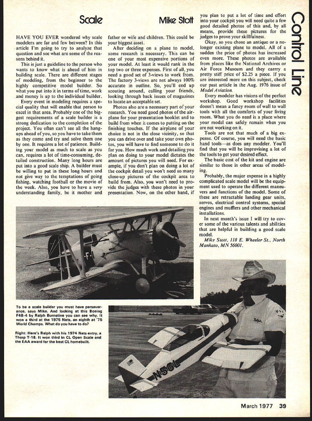 Scale HAVE YOU EVER wondered scale modelers far few between article Im going try analyze question see what some rea sons behind just guideline person wants know what ahead him building scale different stages modeling beginner highly competitive model builder So what put terms time work money up individual builder event modeling requires spe cial quality will enable person excel area Probably big gest requirements scale builder strong dedication completion project often cant see hang ups ahead you have take come try solve one requires lot patience Build ing model much scale can requires lot time-consuming de tailed construction long hours put good scale ship builder must willing put long hours give way temptations going fishing watching football movie week Also have have very understanding family mother Right Heres Ralph 1974 Nats entry Thorp T-18 won third CL Open Scale EAA award best CL homebuilt Mike Stoti father wife children could biggest asset After deciding plane model some research necessary can expensive portions model least would rank top two three expenses First need good set 3-views work factory 3-views always 100% accurate outline So youll end up scouting around calling friends looking through back issues magazines locate acceptable set Photos also necessary part research need good photos air plane presentation booklet build comes putting finishing touches airplane choice close vicinity can drive over take own pho tos will have find someone much work detailing plan doing model dictates amount pictures will need ex ample dont plan doing lot cockpit detail wont need close-up pictures cockpit area build Also wont need pro vide judges photos presentation Now other hand plan put lot time effort cockpit will need quite few good detailed photos means provide pictures judges prove skillfulness Okay chose antique nolonger existing plane model sudden price photos has increased photos available places like National Archives Air Force Museum carrry pretty stiff price $225 piece interested subject check past article Aug 1976 issue Model viation modeler has visions perfect workshop Good workshop facilities doesnt mean fancy room wall wall tools comforts living room What need place model can safely remain working Tools much big ex pense course will need basic hand toolsas does modeler Youll find will improvising lot tools get desired effect basic cost kit engine similar other areas model ing Probably major expense highly complicated scale model will equip ment used operate different maneu vers functions model Some retractable landing gear units servos electrical control systems special engines mufflers other mechanical installations next months issue will try cov er some various talents abilities helpful building good scale model Mike Stott 118 E Wheeler St North Mankato MN 56001 March 1977 39 scale builder must have persever ance says Mike looking Boeing F4B-4 Ralph Burnstine can see won third 1975 Nets eighth 75 World Champs What have do