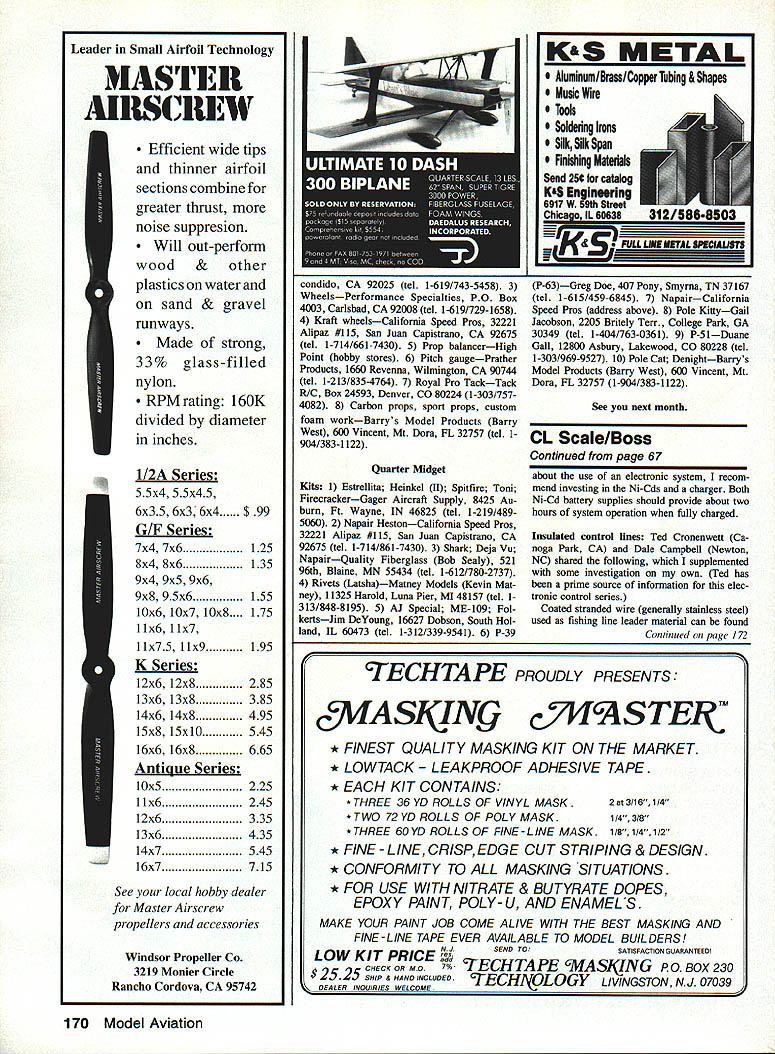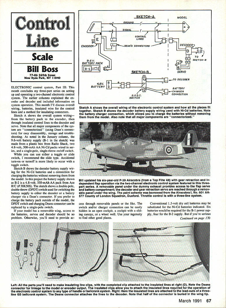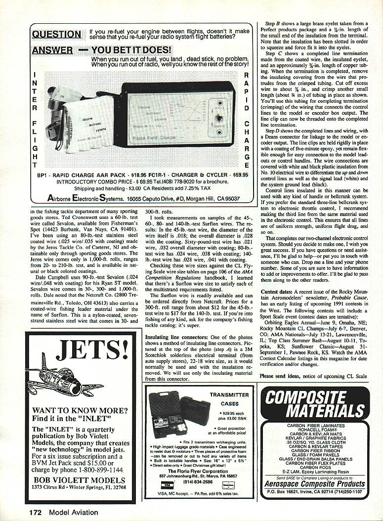 ELECTRONIC control system Part III month concludes three-pan series setting up operating two-channel electronic control system earlier columns explained en coder decoder included information system operation month Ill discuss overall wiring batteries insulated wire control lines method insulating connectors Sketch shows overall system wiring battery pack encoder through insulated control lines decoder servo Note major components sys tem connectorized using Deans connec tors easy disassembly storage trouble shooting As noted January column 96-volt battery supply B-i sketch made plastic box Radio Shack two 48-volt 500-rnAh AA Ni-Cd packs wired ser ies single-pole single-throw on/off switch can use either toggle slide switch recommend slide type Accidental turn-on turnoff likely occur toggle switch Sketch B shows decoder battery supply wir ing Ni-Cd batteries connection charging batteries removing model project battery supply shown B-2 48-volt 550-mAh AA pack Ace R/C #381505 sketch shows double-pole double-throw DPDT switch used switching battery supply either decoder battery charger via Deans connector prefer charge battery pack outside model DPDT switch charging Deans connector can replaced single-pole switch model has removable wing access batteries servos decoder should no problem Otherwise youll need provide ac Sketch shows overall wiring electronic control system pieces fit together Sketch B shows decoder battery supply wiring used Ni-Cd batteries Note battery charger connection allows charge batteries removing model Also note major components connectorized Bill updated six-year-old P-39 Airacobra Top Flite kit gear retraction dependent flap operation via two-channel electronic control system featured threepart series removable panel under dummy exhaust provides access flap servo battery compartment decoder gear retraction servo reached through remov able panel under wing paint scheme borrowed Airacobra No 601 AH 577 County London Squadron Duxford Throttle control three-line system cess through removable panels like switch and/or charger connection can easily hidden open cockpit cockpit slid ing canopy wheel well Use ingenuity find other good places Conventional 15-volt dry cell batteries may substituted Ni-Cd batteries indicated Six batteries would required B- 1 power sup ply four B-2 supply youre serious Continued page 170 Left parts youll need make insulating line clips completed clip attached insulated lines right 0 Note Deans connector linkage model encoder output insulated clips allow attach insulated lines required operation electronic control system type handle belicrank system Right Insulated lines attached lead-outs threeline GS belicrank system Deans connector attaches lines decoder Note half connector buried wing tip March 1991 67 Conoi Line Scale Bill Boss 77-06 269th Street New Hyde Park NY 11040 MODEL DEANS CONNECTORS IDECODER ID TO SKETcH-S SKEIkIL.SERVO .TO DECODER 4AV BATTERY BAT lERY 4CHARGER opor4CONNECTION SWITCH Leader Small Airfoil Technology MASTE 11 AIRSCREW Efficient wide tips thinner airfoil sections combine greater thrust noise suppresion Will out-perform wood & other plastics water sand & gravel runways Made strong 33% glass-filled nylon RPM rating 160K divided diameter 1/2A Series 55x4 55x45 6x35 6x3 6x4$ 99 GIF Series 7x4 7x6125 8x48x6135 9x4 9x5 9x6 9x8 95x6155 10x6 10x7 10x8.. 175 11x6 11x7 inches 11x75 11x9195 K Series 12x6 12x8 13x6 13x8 14x6 14x8 15x8 15x10 285 385 495 545 16x6 16x8665 Antique Series lOxS225 11x6 12x6 13x6 14x7 16x7 245 335 435 545 715 See local hobby dealer Master Airscrew propellers accessories Windsor Propeller Co 3219 Monier Circle Rancho Cordova CA 95742 condido CA 92025 tel 1-619/743-5458 3 WheelsPerformance Specialties PO Box 4003 Carlsbad CA 92008 tel 1-619/729-1658 4 Kraft wheelsCalifornia Speed Pros 32221 Alipaz #115 San Juan Capistrano CA 92675 tel 1-714/661-7430 5 Prop balancerHigh Point hobby stores 6 Pitch gaugePrather Products 1660 Revenna Wilmington CA 90744 tel 1-213/835-4764 7 Royal Pro TackTack R/C Box 24593 Denver CO 80224 1-303/7574082 8 Carbon props sport props custom foam workBarrys Model Products Barry West 600 vincent Mt Dora FL 32757 tel 1904/383-1122 Quarter Midget Kits 1 Estrellita Heinkel II Spitfire Toni FirecrackerGager Aircraft Supply 8425 Au burn Ft Wayne IN 46825 tel 1-219/4895060 2 Napair HestonCalifornia Speed Pros 32221 Alipaz #115 San Juan Capistrano CA 92675 tel 1-714/861-7430 3 Shark Deja vu NapairQuality Fiberglass Bob Sealy 521 96th Blame MN 55434 tel 1-612/780-2737 4 Rivets LatshaMatney Models Kevin Mat ney 11325 Harold Luna Pier MI 48157 tel 1313/848-8195 5 AJ Special ME-109 Fol kertsJim DeYoung 16627 Dobson South Hol land IL 60473 tel 1-312/339-9541 6 P-39 KS METAL AluminumlBrasslCopper Tubing & Shapes Music Wire S loch Soldenng Irons Silk Silk Span Finishing Mateuials Send 2K catalog KSrina 6917 P-63Greg Doe 407 Pony Smyrna TN 37167 tel 1-615/459-6845 7 NapairCalifornia Speed Pros address above 8 Pole KittyGail Jacobson 2205 Britely Terr College Park GA 30349 tel 1-404/763-0361 9 P-51Duane Gall 12800 Asbury Lakewood CO 80228 tel 1-303/969-9527 10 Pole Cat DenightBarrys Model Products Barry West 600 vincent Mt Dora FL 32757 1-904/383-1122 See next month CL Scale/Boss Continued page 67 about use electronic system recom mend investing Ni-Cds charger Both Ni-Cd battery supplies should provide about two hours system operation fully charged Insulated control lines Ted Cronenwett Ca noga Park CA Dale Campbell Newton NC shared following supplemented some investigation own Ted has prime source information elec tronic control series Coated stranded wire generally stainless steel used fishing line leader material can found Continued page 172 170 Model Aviation TEGHTA PE PROUDLY PRESENTS 5fMASIIN CjUA S TERJ * FINEST QUALITY MASKING KIT ON THE MARKET * LOWTACK LEAKPROOF ADHESIVE TAPE * EACH KIT CONTAINS * THREE 36 YD ROLLS OF VINYL MASK 2at3/161/4 *TWO 72YD ROLLS OF POLY MASK 114318 * THREE 6OYD ROL