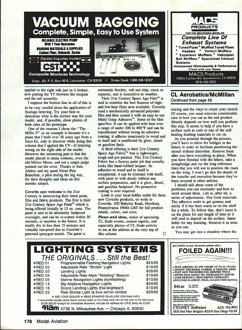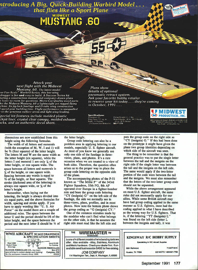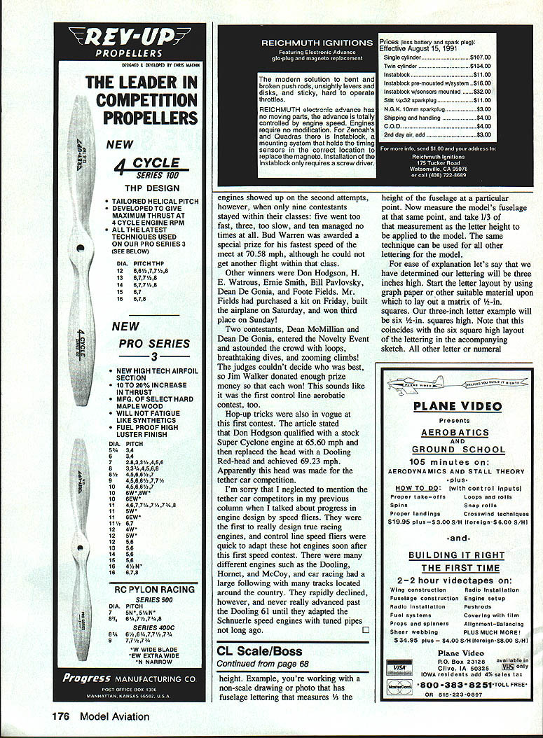 LETTERING numerals markings generally placed models based whatever data able find subject aircraft data might Profile-type publications artists renditions photographs three-view plan drawings Two possible problems data might have difficulty determining size letters numerals cases see information side aircraft Seeing side aircraft often leaves modeler wonder insignia group code lettering should applied other side plane Lets start first problemthat determining size lettering model US Air Force fighter plane WW II era lettering numerals will single stroke Gothic type shown accompanying sketch taken technical order era first step determine lettering height once has established definite formula determining stroke width spacing letters numerals words fortunate enough working scale three-view drawings show aircraft lettering insignia determining letter height will no problem will simply matter measuring letters applying plan scale obtain exact height youre working non-scale drawings photos youll have some estimating determine letter Continued page 176 P-51 Miilie P 343rd Fighter Sqdn 55th FIghter Group 8th AF fighter-bomber rois over Europe bore Group Code letters CY-G Fuseiage Group Code iettering can probiem mod eier cant find proof what lettering longs both sides lettering should applied aircraft AJ-2 Profile Scale modeis work Peter Jackson Maryviiie MO Models buiit using set oid Berkeiy AJ-1 pians guide appropriate modifications produce AJ-2 version smaii version powered 020 engines whiie larger modei powered 049s engines iook iike Coxs can teii expression Jacksons 4-year-oid grandson ian Jack son enjoys Grandpaws pianes Photo Peter Jackson Aiphabet & Numeral Sketch taken Technicai Order WW ii era shows singie stroke Gothic lettering used military aircraft time period Text contains details formuies used determining size spacing appiied aircraft 68 Model Aviation Luix Scale Bill Boss 77-06 269th Street New Hyde Park NY 11040 Ed Robinson Croton Hudson NY produced huge eight toot 1912 BlacKburn made kit avaiiabie Dave Boddington England Black burn weighs just over eight ib powered four-stroke Enya its type modei flies weii calm days Stearman Cox 049 made Guiliow rubber kit Robinson converted Aibatros-DV prof lie Comet Rubber kit put Cox 074 throttled engine fun approach Scaie THE LEADER IN COMPETITION PROPELLERS fbI NEW 4 CYCLE SEflIES 100 THP DESIGN TAILORED HELICAL PITCH DEVELOPEDTOGIVE MAXIMUM THRUST AT 4 CYCLE ENGINE RPM ALLTHE LATEST TECHNIQUES USED ON OUR PRO SERIES 3 SEE BELOW DIAPITCH THP 1266776 13677/8 14677V8 1567 16678 NEW PRO SERIES 3 NEW HIGH TECH AIRFOIL SECTION 10T020%INCREASE IN THRUST MFG OF SELECT HARD MAPLE WOOD WILLNOTFATIGUE LIKE SYNTHETICS FUELPROOFHIGH LUSTER FINISH DIA PITCH 5S/ 34 6 34 7 2833456 6 334568 6/2 45667 9 4566/z77 10 4566/z7 10 6W6W 10 6EW0 ii 46777Vo78 Ii SW ii 6EW 11 67 12 4W 12 5W 12 56 13 56 14 56 15 56 16 4N 16 678 engines showed up second attempts however nine contestants stayed within classes five went too fast three too slow ten managed no times Bud Warren awarded special prize fastest speed meet 7058 mph although could get another flight within class Other winners Don Hodgson H E Watrous Ernie Smith Bill Pavlovsky Dean De Gonia Foote Fields Mr Fields purchased kit Friday built airplane Saturday won third place Sunday Two contestants Dean McMillian Dean De Gonia entered Novelty Event astounded crowd loops breathtaking dives zooming climbs judges couldnt decide best Jim Walker donated enough prize money won sounds like first control line aerobatic contest too Hop-up tricks also vogue first contest article stated Don Hodgson qualified stock Super Cyclone engine 6560 mph replaced head Dooling Red-head achieved 6923 mph Apparently head made tether car competition Im sorry neglected mention tether car competitors previous column talked about progress engine design speed fliers first really design true racing engines control line speed fliers quick adapt hot engines soon after first speed contest different engines such pooling Hornet McCoy car rcing large following tracfks located around country rapkly declined however never really advanced past Dooling 61 until adapted Schnuerle speed engines tuned pipes long agoD CL Scale/Boss Continued page 68 height Example youre working non-scale drawing photo has fuselage lettering measures /3 height fuselage particular point Now measure models fuselage same point take 1/3 measurement letter height applied model same technique can used other lettering model ease explanation lets say have determined lettering will three inches high Start letter layout using graph paper other suitable material upon lay out matrix A-in squares three-inch letter example will six -in squares high Note coincides six square high layout lettering accompanying sketch other letter numeral 176 Model Aviation b p I v0UUL RIGHTfl PLANE VIDEO Presents AEROB ATICS AND GROUND SCHOOL 105 minutes AERODYNAMICS AND STALL THEORY plus HOW TO DO control inputel Proper takeoffsLoops rolls SpinsSnap rolls Proper landingsCrosswind techniques $1995 plusS 300 S/H foreign-S6O0 S/HI BUILDING IT RIGHT THE FIRST TIME 22 hour videotapes Wing ConstructionRadio Installation Fuselage constructionEngine setup Radio installatIonPushrods Fuel systemsCovering film Props spinnersAlignmentBalancing Shear webbingPLUS MUCH MORE $3495 plus S/H torelgn-$8OO S/Hi Plane Video PO Box 23128avaIlable 1V1S41Clive IA 50325 [J IOWA residents add 4% sales tax 800383-8251TOLL FREE LXJ OR 515-223-0897 RC PYLON RACING SERIES 500 DIAPITCH 75N 5N 6I677/6 SERIES 400C 866777 977/7 W WIDE BLADE EW EXTRA WIDE hI tJAOAAW dimensions now established height using following formulas width letters numerals exception M W 1 will 2A four squares letter height letters M W same width letter height six squares letters numeral 1/6 letter height square wide space between letters numerals /6 height square wide Spacing between words equal 2A height four squares stroke darkened area lettering always square wide 