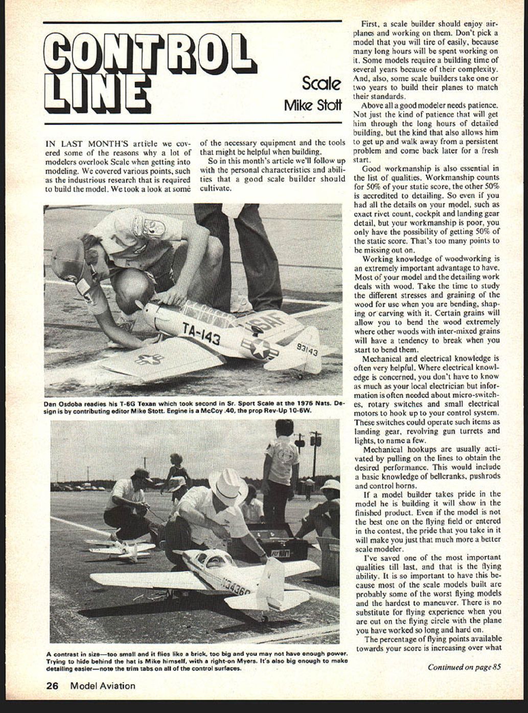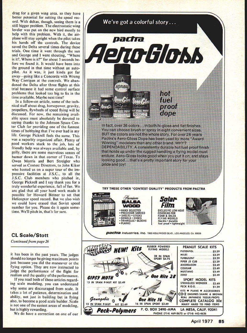 I Scale Mike Stoft IN LAST MONTHS article cov ered some reasons lot modelers overlook Scale getting modeling covered various points such industrious research required build model took look some necessary equipment tools might helpful building So months article well follow up personal characteristics abili ties good scale builder should cultivate First scale builder should enjoy air planes working Dont pick model will tire easily because long hours will spent working Some models require building time several years because complexity also some scale builders take two years build planes match standards Above good modeler needs patience just kind patience will get him through long hours detailed building kind also allows him get up walk away persistent problem come back later fresh start Good workmanship also essential list qualities Workmanship counts 50% static score other 50% accredited detailing So details model such exact rivet count cockpit landing gear detail workmanship poor have possibility getting 50% static score Thats too points missing out Working knowledge woodworking extremely important advantage have Most model detailing work deals wood Take time study different stresses graining wood use bending shap ing carving Certain grains will allow bend wood extremely other woods inter-mixed grains will have tendency break start bend Mechanical electrical knowledge often very helpful electrical knowl edge concerned dont have know much local electrician infor mation often needed about micro-switch es rotary switches small electrical motors hook up control system switches could operate such items landing gear revolving gun turrets lights name few Mechanical hookups usually acti vated pulling lines obtain desired performance would include basic knowledge bellcranks pushrods control horns model builder takes pride model building will show finished product model best flying field entered contest pride take will make just much better scale modeler Ive saved important qualities till last flying ability important have cause scale models built probably some worst flying models hardest maneuver no substitute flying experience out flying circle plane have worked long hard percentage flying points available towards score increasing over what Continued page 85 26 Model Aviation Dan Osdoba readies T-6G Texan took second Sr Sport Scale 1976 Nets De sign contributing editor Mike Stott Engine McCoy 40 prop Rev-Up 10-6W contrast sizetoo small flies like brick too big may have enough power Trying hide behind hat Mike himself right-on Myers Its also big enough make detailing easiernote trim tabs control surfaces drag given wing area have better potential setting speed rec ord deltas though seeing still bigger problem electrostatic wing leveler put new bird mostly help problem air plane will stay upright pilot takes hands off controls device saved Delta several times during trials time went through sun George shouting Where about 5 seconds fore found would have ground time auto pilot As just kinda got far awaygoing like Concorde Wrong Way Corrigan controls aban doned Delta after three flights trial because some control surface problems looked too big fix time available Maybe next time follow-on article some tech nical stuff about drag horsepower gravity propellers flywheels speed flying will discussed now remaining avail able space must absolutely devoted saying thanks Johnson Space Cen ter Club providing funnest times hobbying Ive ever life George Pickrell feels same superbly organized affair Plenty good workers stuck job lots friendly help always available golly some marvelous senses humor down corner Texas Owen Morris Bert Streigler served Contest Directors John Kiker hosted us super tour im pressive facilities JSC JSC Club members pitched George Pickrell say thank truly wonderful experience full fun glad hard work made possible Howard Bittner set Helicopter speed record also wish could have erased Soviet speed number Please again some time Well pitch thats sure CL Scale/Stott Continued page 26 has past years judges should no longer giving maximum points just because did maneuver flying option now instructed judge performance flight realism quality performance read both articles regard ing scale modeling can understand some discouraged scale takes lot patience determination ability just building flying also become good scale builder Scale easiest areas modeling highly rewarding have correction ALA HAND SELECTED PRECISION SANDED SHEETS KS DOWELS S TRIANGLES KS PLANKS PUCUD Industrle8 Inc 7080 HOLLYWOOD BLVD. LOS ANGELES CA 90028 RUBBER POWERED FLYING MODELS NEW Kits 28INSPAN GIPSY MOiNDee Nit 2 13 IN SPAN P NUT KIT $349 J4 neeVite 1 13 IN SPAN P-NUTKIT $34916 IN SPAN SPORT $349 PEANUT SCALE KITS PIETENPOL$329 MILES$329 TURBULENT$329 PIPER i3 CUB$329 ANDREASON$349 COUGAR$349 MUSTANG$349 ZERO$349 SPORT MODEL KITS STRINGLESS WONDER $249 PECK ROG$139 KITS 0 PLANS S ACCESSORIES CO-2 ENGINES SHARK & BROWN REAL JAPANESE TISSUE-PROPS COMPLETE CATALOG 50 MANY HARD TO FIND ITEMS PeckwPIvmers PO BOX 2498-AMA LA MESA CALIF 92041 PHONE 17141 469-8675 714 442-4636 April 1977 85 TRY THESE OTHER CONTEST QUALITY PRODUCTS FROM PACTRA SoIa Film EXCLUSIVE LOW-HEAT COVERING FOR FOAM&BALSA FLYING MODELS flexible ble fuel proof tweight 5% nitro $650 gallon Custom Blended Bill Hager 10% nitro $725 gallon 15% nitro $800 gallon 54 gallon drum 15% $21954 HARRYS HOBBIESWESHIP FREE WITH 5214 N Dixie Drive Dayton Ohio 45414 past articles stated World Championships may going threeyear schedule have informed going remain present two-year schedule time being personally hope reconsider threeyear proposal future date Mike Stott 118 East Wheeler St North Mankato MN 56001 CL Combat/Johnson Continued page 27 lots USA rest dont have remotest idea about FAI Combat get practice develop skills AMA Slow Combat good starting place flown FAI style Eliminate kill entirely count paper cuts 100 points given cutting string right back started having get