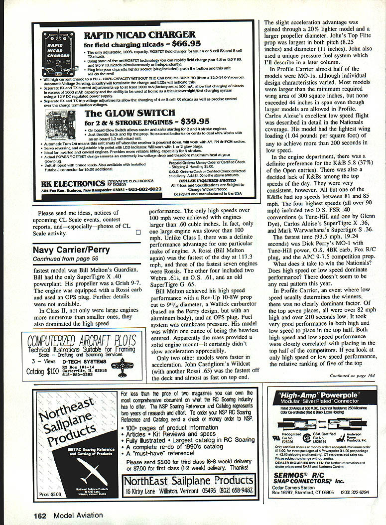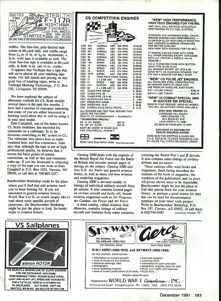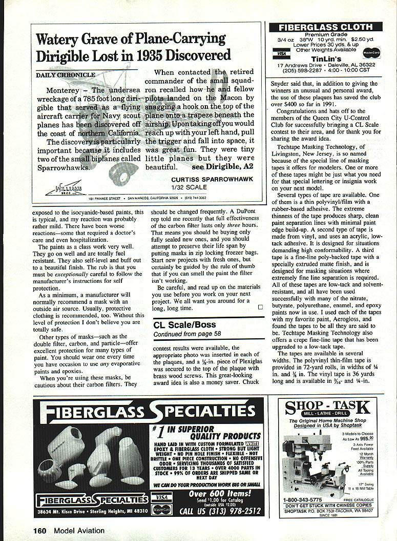 THE QUEEN CITY U-CONTROL CLUB recently took strides toward promoting CL Scale activities Cincinnati area Sunday June 3 marked day Queen City Club held its first CL Scale contest included Sport Profile events Although five contestants meet club members learned lot about both static flight judging contestants Charles Bauer Norridge Illinois Lynn Green Celina Ohio George Kite Indianapolis Indiana John Hale Louisville Kentucky Ken Grasser great group competitors George Kite placed first Sport event 1909 Antoinette followed John Hale flying Pitts Special Charlie Bauer third place flying F86 Profile event Lynn Green placed first P-61 Black Widow Charlie Bauer second place very large TA 154 Moskito CD Chuck Snyder said everything went off just fine running Scale contest great learning experience hoping better turnout next Scale meet awards presented winners unique member Queen City Club cabinet-maker designed awards bases plaques made cherry black walnut measure about 10 unique set awards cludes photo winning contestant made presented Queen City U-Control Club its first annual Scale con test Photo Jim Snyder Contestants First Annual Queen City U-Control Club Scale Meet held June 23 1991 John Hale Ken Grasser Charles Bauer Lynn Green George Kite Photo Jim Snyder in x 55 have kerfed edges three-section layout provides space club logo appropriate event graphic picture contestant receiving award club logo graphic lettering either hand drawn computer generated laid out finally George Kite Indianapolis IN cleans up 1909 AntoInette after flight put him first place Sport event Photo Jim Snyder photocopied using parchment paper Photos taken contestant model static judging completed film taken pre arranged basis one-hour-photo shop developed pictures flight judging taking place Continued page 160 Left This clean-looking neatly painted Pitts Special ready takeoff Pitta took second place John Hale Louisville Ken tucky Sport event Right highly modified P-51 Mustang designated Experimental finished color scheme used famous Paul Mantz printing fuselage listing accomplishments plane plane Bendix Trophy Winner 1946 1947 1948 held several other transcontinental records model built Ken Grasser Photo Jim Snyder 58 Model Aviation Lc Scale Bill Boss 77-06 269th Street New Hyde Park NY 11040 4 P-61 Black Widow lathe work Lynn Green Ceilna Ohio great-looking profile ver sion Night Fighter placed first Profile event Photo Jim Snyder Masking tapes have come age Techtspe Masking Technology Livingston New Jer sey can provide various types masking tapes can make application spe cial intricate paint schemes much easier exposed isocyanide-based paints typical reaction probably rather mild have worse reactionssome required doctors care hospitalization paints class work very well go well totally fuel resistant also self-level buff out beautiful finish rub must exceptionally careful follow manufacturers instructions self protection As minimum manufacturer will normally recommend mask outside air source Usually protective clothing recommended too Without level protection dont believe totally safe Other types maskssuch double filter carbon particleoffer excellent protection types paint should wear time have occasion use evaporative paints epoxies youre using masks cautious about carbon filters should changed frequently DuPont rep told recently full effectiveness carbon filter lasts three hours means should buying fully sealed new ones should attempt preserve life span putting masks zip locking freezer bags Start new projects fresh ones certainly guided rule thumb can smell paint filter isnt working careful read up materials use before work next project want around long long time CL Scale/Boss Continued page 58 contest results available appropriate photo inserted plaques %-in piece Plexiglas secured top plaque brass wood screws great-looking award idea also money saver Chuck S Premium Grade 3/4 oz 38W 10 yrd mm $250 yd L~rPrices 30 yds & up Weights Available TinLins 17 Andrews Drive Daleville AL 36322 205 598-2287 1000 OST Snyder said addition giving winners unusual personal award use plaques has saved club over $400 far 1991 Congratulations hats off members Queen City U-Control Club successfully bringing CL Scale contest area thank sharing award idea Techtape Masking Technology Livingston New Jersey named because special line masking tapes offers modelers tapes might just what need special lettering insignia work next model Several types tape available thin polyvinyl/film rubber-based adhesive extreme thinness tape produces sharp clean paint separation lines minimal paint edge build-up second type tape made vinyl uses acrylic lowtack adhesive designed situations demanding high conformability third tape fine-line poly-backed tape specially extruded matte finish designed masking situations extremely fine line separation required tapes low-tack solventresistant have used successfully nitrate w butyrate polyurethane enamel epoxy paints now use used tapes favorite paint Aerogloss found tapes said Techtape Masking Technology also offers crepe fine-line tape has upgraded low-tack tape tapes available several widths polyvinyl thin-film tape provided 72-yard rolls widths % vinyl tape 36 yards long available /16 A-in SHOP TASK original Home Machine Shop Designed USA Shoptask 3 Models Choose As LoA As 99599 3 AxiS PoAer Feed Available 12 MoatS Warracty 100% PatIo SuESly Toolieg Avatlable 17 Sedeg ii o 18 Mill Table 1 -8OO-~- 75141EE CATALOGUE DONT GET STUCK WITH CHINESE COPIES SHOPTASK PC BOX 7531-IWUOMA WA 98407 SINCE 1981 160 Model Aviation DA] Watery Grave Plane-Carrying Dirijible Lost 1935 Discovered contacted th retired commander pn 4 squad ron recalled l * fellow ded tte acon hook top e beneath igofttyou would left hand pull r fall space tiny see Dirigible A2 CURTISS SPARROWHAWK 1/32 SCALE 161 FAWNEE STREET MARCOS CALIFORNIA 92609 1 74432 ____________FII widths fine-line poly-backed tape comes 60-yard rolls widths range /16 4 in /6-in