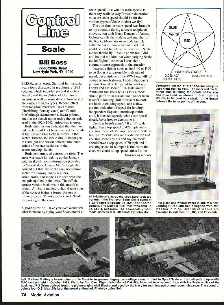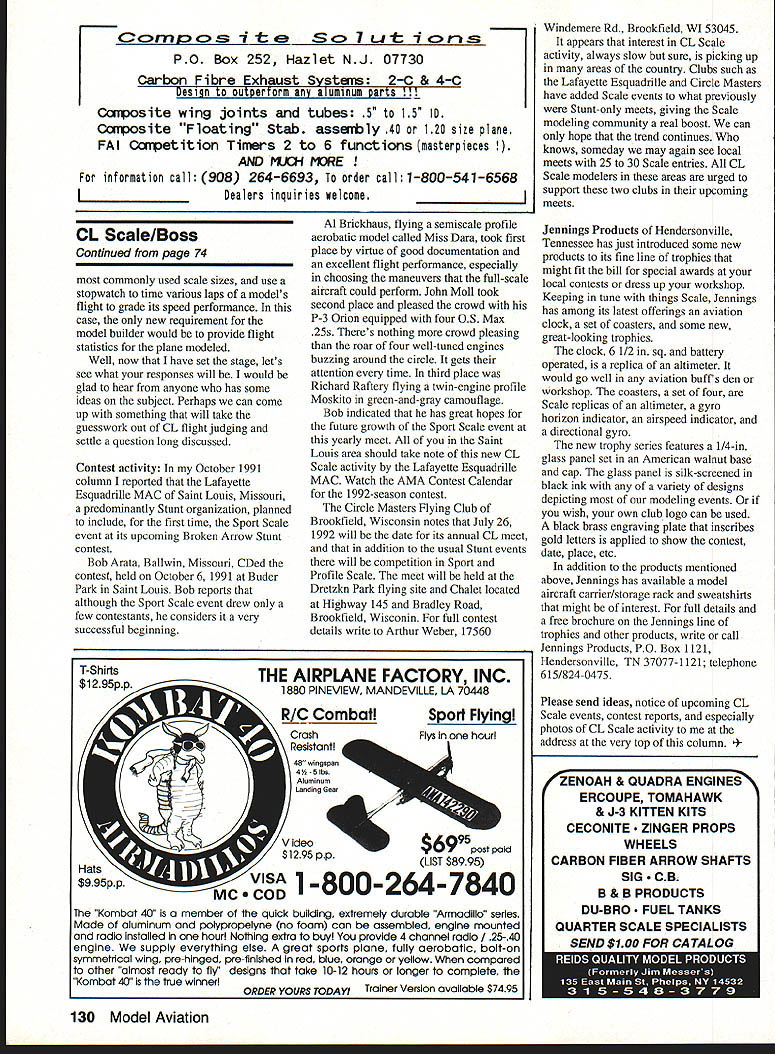 ERROR error error Star-and-bar insignia topic discussed January 1992 column included several sketches showed evolution US aircraft insignia well some data size various insignia types Recent letters longtime modelers Jack Conrad Harrisburg Pennsylvania Claude McCullough Montezuma Iowa pointed Out sketch representing insignia used 1920-1942 period error Both letter writers indicated inner red circle should have touched points star blue field shown sketch Instead circle should tangent straight line drawn between inner points star shown accompanying sketch Both gentlemen course right error made making up January column sketch information provided Sam Abdow Claude McCullough also pointed Out January column sketch wrong replicas home-builts models seen insignia applied way official correct version shown months sketch Scale modelers should take note correct insignia format use future projects Thanks Jack Claude picking up error good question Have ever wondered what meant flying Scale model scale speed Just what scale speed realistic way us determine what scale speed should various types Scale models fly question scale speed brought attention during recent telephone conversation Gerry Deneau Aurora Colorado Scale modeler member Rocky Mountain Aeromodelers called ask knew method could used determine fast Scale model should fly admit did did tell him judging Scale model flights use what consider common-sense approach question expect fighter such P-40 P-5 1 flown reasonably high rate speed biplane WW era will course much slower added ones judgment must tempered what knows has seen full-scale aircraft rule book tells us model should perform scalelike manner takeoff landing full throttle takeoff cut back cruising speed slow gradual reduction speed landing independent flap throttle operation etc does specify what scale speed should determine Could simple full-scale fighter has top speed 420 mph cruising speed 360 mph model built 1/6 scale can divide top cruising speeds six say model should have top speed 70 mph cruising speed 60 mph case could set up speed tables Continued page 130 Corrected sketch star-and-bar insignia used 1920 1942 inner red circle rather touching points star blue field shown last months sketch tangent straight line drawn between inner points star 74 Model Aviation Scale Bill Boss 77-06 269th Street New Hyde Park NY 11040 BLUE WHITE RED\ INNER RED CIRCLE DOES NOTTANGENT HERE TOUCH HERE Al Brickhauss aerobatic Miss Dara took top honors first-ever Sport Scale event Lafayette Esquadrille MAC-sponsored glass-and-walnut award new contest October 1991 meet held Jennings Products line designed St Louis Missouri semiscale profile modeler mind Over 40 variations model uses OS 40 Photo John Moll available suit CL RC FF events Len Hichard Fiafterys twin-engine profile Moskito green-and-gray camouflage came third Sport Scale Lafayette Esquadrille MAC contest held October 1991 Photo Ron Carr Right John Moll Oakville Missouri took second place Scale replica Lockheed P-3 Orion derived piston-engine civil Electra used Navy maritime patrol reconnaissance sound Johns four OS Max 25s kept crowd enthralled Photo John Moll Cmg c S t 1 ox 252 Haziet NJ 07730 Carbon Fibre Exhaust Systems & 4-C Design outoertorm aluminum Darts fl Cciposite wing joints tubes 5 15 ID Caiosite Floating Stab asseritly 40 120 size plane FAt Ccietition Timers 2 6 functions masterpieces ILOf I$RE rmation call 908 2646693 order call 18005416568 Dealers inquiries welcome CL Scale/Boss Continued page 74 commonly used scale sizes use stopwatch time various laps models flight grade its speed performance case new requirement model builder would provide flight statistics plane modeled Well now have set stage lets see what responses will would glad hear anyone has some ideas subject Perhaps can come up something will take guesswork out CL flight judging settle question long discussed Contest activity October 1991 column reported Lafayette Esquadrifle MAC Saint Louis Missouri predominantly Stunt organization planned include first time Sport Scale event its upcoming Broken Arrow Stunt contest Bob Arata Ballwin Missouri CDed contest held October 6 1991 Buder Park Saint Louis Bob reports although Sport Scale event drew few contestants considers very successful beginning Al Brickhaus flying semiscale profile aerobatic model called Miss Dara took first place virtue good documentation excellent flight performance especially choosing maneuvers full-scale aircraft could perform John Moll took second place pleased crowd P-3 Orion equipped four OS Max 25s Theres nothing crowd pleasing roar four well-tuned engines buzzing around circle gets attention time third place Richard Raftery flying twin-engine profile Moskito green-and-gray camouflage Bob indicated has great hopes future growth Sport Scale event yearly meet Saint Louis area should take note new CL Scale activity Lafayette Esquadrille MAC Watch AMA Contest Calendar 1992-season contest Circle Masters Flying Club Brookfield Wisconsin notes July 26 1992 will date its annual CL meet addition usual Stunt events will competition Sport Profile Scale meet will held Dretzkn Park flying site Chalet located Highway 145 Bradley Road Brookfield Wisconin full contest details write Arthur Weber 17560 THE AIRPLANE FACTORY INC 1880 PINEVIEW MANDEVILLE LA 70448 R/C Combat__________ Crash Resistant 48 wingspan 4 -5Ibs Aluminum Landing Gear Video$ 5 LIST $8995 1-8O0-264- 7840 Kombat 40 member quick building extremely durable Armadillo series Made aluminum polypropelyne no foam can assembled engine mounted radio installed hour Nothing extra buyl provide 4 channel radio / 25-40 engine supply everything else great sports plane fully aerobatic bolt-on symmetrical wing pre-hinged pre-finished red blue orange yellow compared other almost ready fly designs take 10-12 hours longer complete Kombat 40 true winner ORDER YOURS TODAYI Trainer Version available $7495 Sport Flying Flys houil Windemere Rd Brookfield WI 53045 a