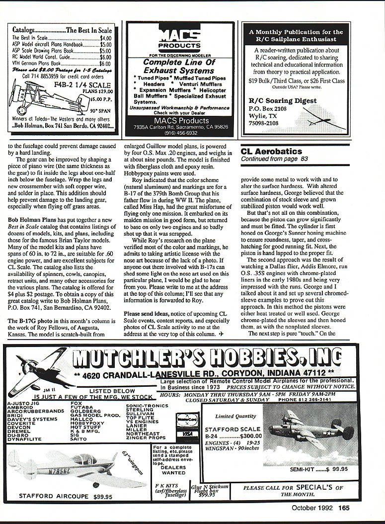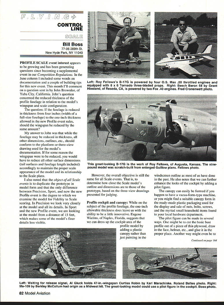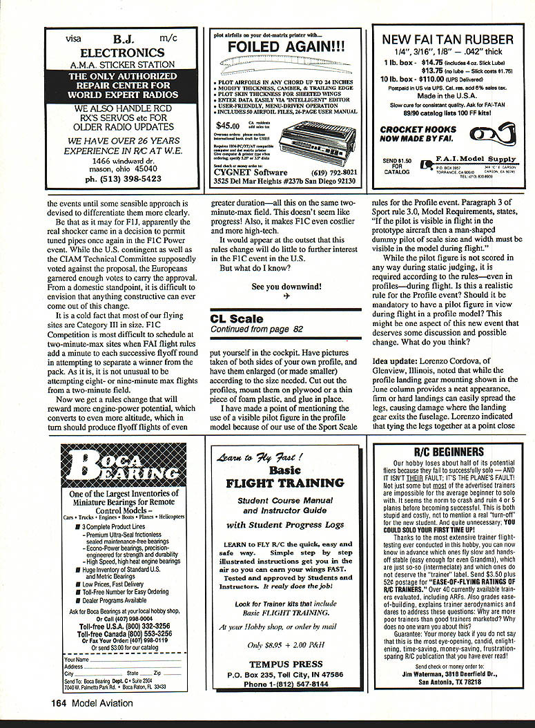 CONTROL LINE Bill Boss 77-06 269th St New Hyde Park NY 11040 PROFILE SCALE event interest appears growing has generating questions since becoming supplemental event Competition Regulations June column included some words documentation couple building tips new event month Ill comment question sent John Brownlee Yuba City California Johns question concerned reduced thickness profile fuselage relation models wingspan scale configuration question fuselage reduced thickness four inches width full-size fuselage one-inch thickness allowed new Profile event rules should wingspan reduced same amount answer John fuselage may reduced thickness other dimensions outlines etc should conform planform three-view drawing used models documentation some reason wingspan reduced would have reduce other surface dimensions tail surfaces fuselage length included accordingly maintain proper scale appearance model its relationship Scale plans also noted object Scale events duplicate prototype model form difference between Precision Sport now new Profile event degree examine model Fidelity Scale scoring Precision look very closely model its details Sport new Profile event looking model distance 15 feet makes some models finer details less visible However overall objective still same Scale events determine close Scale models outline dimensions prototype based three-view drawings presented judging windscreen outline us have done past also notes can further enhance looks cockpit adding pilot figure canopy can easily formed happen have vacuu-form-type machine might find suitable canopy form ready-made plastic packaging used display sale nuts bolts screws myriad small household items found local hardware department pilot figure can made several ways might cut basic bust profile out piece thin plywood draw face helmet etc glue proper place Another way might 82 Model Aviation Left Roy Fellowss B-17G powered four OS Max 20 throttled engines equipped 8 x 6 Tornado three-bladed props Right Beech Baron 58 Grant Hiestand Reseda CA powered two Fox 40 engines Fred Cronenwett photo great-looking B-17G work Roy Fellows Augusta Kansas ninepound model scratch-built enlarged Guillow plans Fellows photo Profile cockpit canopy subject profile fuselage one-inch allowable thickness does leave us ability little innovative Eugene Wielms Naples Florida suggests can dress up cockpit area profile model adding plastic canopy rather just painting Left Waiting release signal Al Gluck holds 47-in-wingspan Curtiss Robin Karl Marsohinke Roland Baltes photo Right Me-i 09 Berkley McCollum origin Midwest kit great-looking model could use pilot figure cockpit Boss photo visaBJrn/c ELECTRONICS --TAT1 WE HAVE OVER 26 YEARS EXPERIENCE IN IC AT WE 1466 windward dr mason ohio 45040 ph 513 398-5423 events until some sensible approach devised differentiate clearly may FlJ apparently real shocker came decision permit tuned pipes once again FlC Power event US contingent well ClAM Technical Committee supposedly voted against proposal Europeans garnered enough votes carry approval domestic standpoint difficult envision anything constructive can ever come out change cold fact flying sites Category III size FlC Competition difficult schedule two-minute-max sites FAI flight rules add minute successive flyoff round attempting separate winner pack As it unusual attempting eight- nine-minute max flights two-minute field Now get rules change will reward engine-power potential converts altitude turn should produce flyoff flights greater durationall same twominute-max field doesnt seem like progress Also makes FLC costlier high-tech would appear outset rules change will little further interest FiC event US what know See downwind *CL Scale Continued page 82 put yourself cockpit Have pictures taken both sides own profile have enlarged made smaller according size needed Cut out profiles mount plywood thin piece foam plastic glue place have made point mentioning use visible pilot figure profile model because use Sport Scale rules Profile event Paragraph 3 Sport rule 30 Model Requirements states pilot visible flight prototype aircraft man-shaped dummy pilot scale size width must visible model during flight pilot figure scored way during static judging required according ruleseven profilesduring flight realistic rule Profile event Should mandatory have pilot figure view during flight profile model might aspect new event deserves some discussion possible change What think Idea update Lorenzo Cordova Glenview Illinois noted profile landing gear mounting shown June column provides neat appearance firm hard landings can easily spread legs causing damage landing gear exits fuselage Lorenzo indicated tying legs together point close Largest Inventories Miniature Bearings Remote Control Models Cars ks Engines s es copters E 3 Complete Product Lines Premium Ultra-Seal frictionless sealed maintenance-free bearings Econo-Power beatings precisionengineered slrength durability High Speed high heat engine beatings E Huge Inventory Standard US Metric Beatings E Low Prices Fast Delivery Toll-Free Number Easy Ordering U Dealer Programs Available Ask Boca Beatings local hobby shop Call 407 9980004 Toll-f roe USA 800 332-3256 Toll-free Canada 800 553-3256 Fax Order 407 9980119 send $300 catalog Name 164 Model Aviation KX sLRVOt etc t-ui OLDER RADIO UPDATES pIne aIrfoils dot asatrh prInter FOILED AGAIN! PLOT AIRFOILS IN ANY CHORD UP TO 24 INCHES MODIFY TIuCKNEss CAMBER & TRAILING EDGE PLOT SEIN THICENESS FOR SHEETED WINGS ENTER DATA EASILY VIA INTELLIGENr EDITOR USER-FRIENDLY MENU-DRIVEN OPERATION INCLUDES 50 AIRFOIL FILES 26-PAGE USER MANUAL $45oo d.l bask am 0 Rsslrss lBMCXTXTwps*lN comOr asides 54t s15e GO spm & pds 5 sddp s sor 3F disks Scsi 555k inoQ sd , CYGNET Software619 792-8021 3525 Del Msr Heights #237b Ssm Diego 92130 NEW FAI TAN RUBBER 1/4 3/16 1/8 thick 1 lb box $1475 lincludes 4 ox Slick Lubel $1375 iso lube k costs *1751 10 lb box- $11000 tups Doliveeedl Postpaid US via UPS Cal re