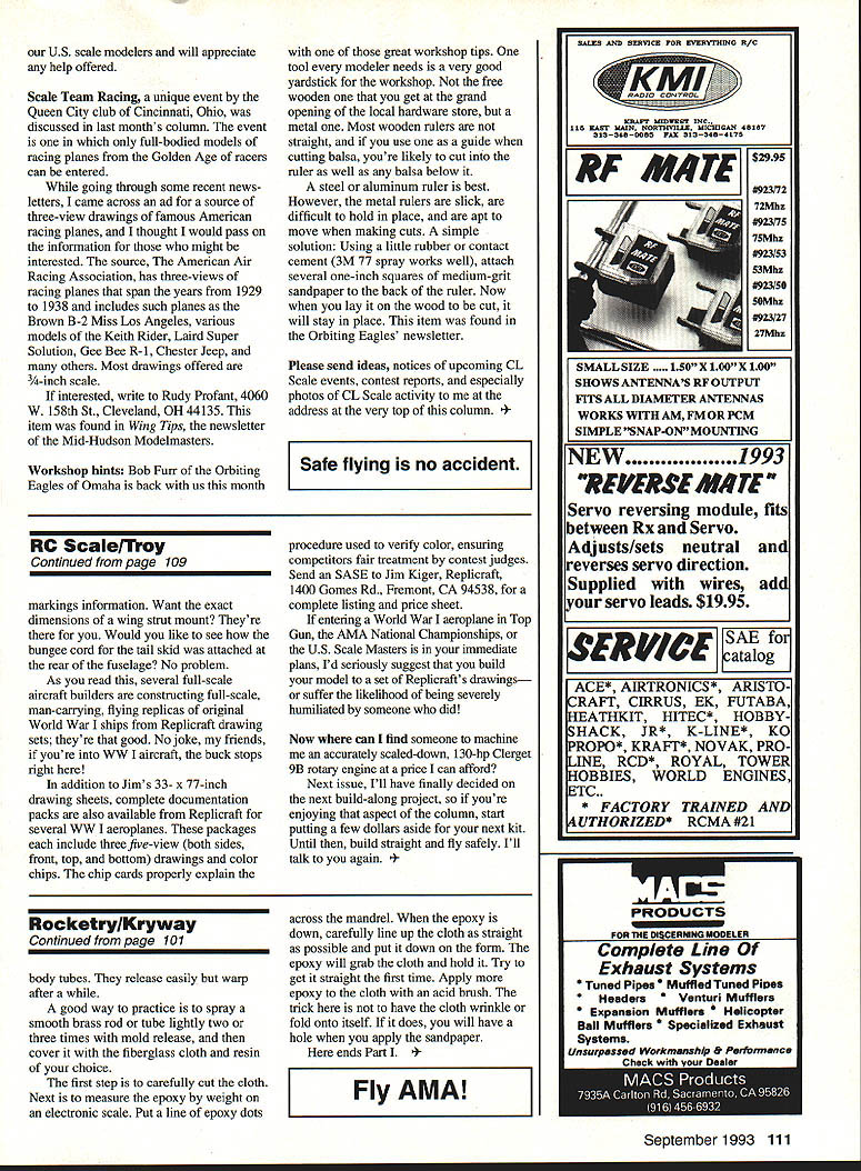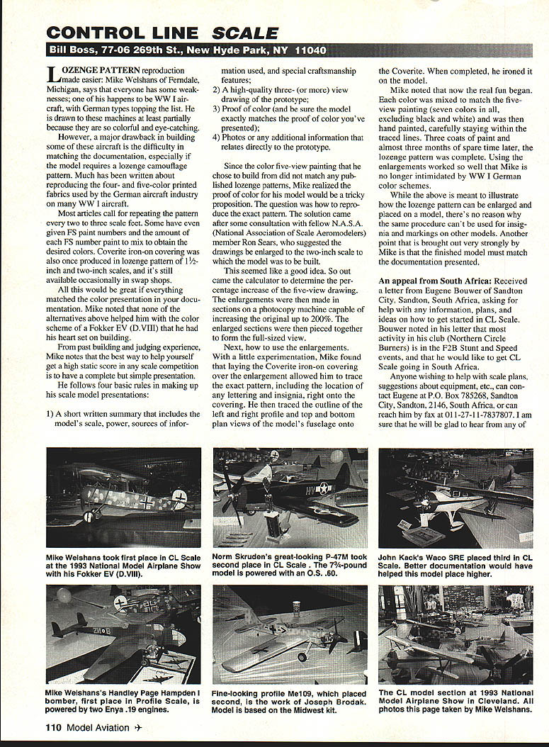 CONTROL LINE SCALE LOZENGE PATTERN reproduction made easier Mike Weishans Ferndale Michigan says everyone has some weak nesses happens WW air craft German types topping list drawn machines least partially because colorful eye-catching However major drawback building some aircraft difficulty matching documentation especially model requires lozenge camouflage pattern Much has written about reproducing four- five-color printed fabrics used German aircraft industry WW aircraft Most articles call repeating pattern two three scale feet Some have given FS paint numbers amount FS number paint mix obtain desired colors Coverite iron-on covering also once produced lozenge pattern 1 1/2 inch two-inch scales its still available occasionally swap shops would great everything matched color presentation docu mentation Mike noted alternatives above helped him color scheme Fokker EV DVIII heart set building past building judging experience Mike notes best way help yourself get high static score scale competition have complete simple presentation follows four basic rules making up scale model presentations 1 short written summary includes models scale power sources infor mation used special craftsmanship features 2 A high-quality three- view drawing prototype 3 Proof color sure model exactly matches proof color youve presented 4 Photos additional information relates directly prototype Since color five-view painting chose build did match pub lished lozenge patterns Mike realized proof color model would tricky proposition question repro duce exact pattern solution came after some consultation fellow NASA National Association Scale Aeromodelers member Ron Sears suggested drawings enlarged two-inch scale model built seemed like good idea So out came calculator determine per centage increase five-view drawing enlargements made sections photocopy machine capable increasing original up 200% enlarged sections pieced together form full-sized view Next use enlargements little experimentation Mike found laying Covente iron-on covering over enlargement allowed him trace exact pattern including location lettering insignia right onto covering traced outline left right profile top bottom plan views models fuselage onto Coverite completed ironed model Mike noted now real fun began color mixed match fiveview painting seven colors excluding black white hand painted carefully staying within traced lines Three coats paint almost three months spare time later lozenge pattern complete Using enlargements worked well Mike no longer intimidated WW German color schemes above meant illustrate lozenge pattern can enlarged placed model theres no reason same procedure cant used insig nia markings other models Another point brought out very strongly Mike finished model must match documentation presented An appeal South Africa Received letter Eugene Bouwer Sandton City Sandton South Africa asking help information plans ideas get started CL Scale Bouwer noted letter activity club Northern Circle Burners F2B Stunt Speed events would like get CL Scale going South Africa Anyone wishing help scale plans suggestions about equipment etc can con tact Eugene PO Box 785268 Sandton City Sandton 2146 South Africa can reach him fax 011-27-11-7837807 lam sure will glad hear 110 Model Aviation Weishans took first place CL Scale Norm Skrudens great-looking P-47M took 1993 NatIonal Model Airplane Show second place CL Scale und Fokker EV DVllI model powered 0S 60 John Kacks Waco SRE placed third CL Scale Better documentation would have helped model place higher Mike Weishanss Handley Page Hampden Fine-looking profile Mel 09 placed bomber first place Profile Scale second work Joseph Brodak powered two Enya 19 engines Model based Midwest kit CL model section 1993 National Model Airplane Show Cleveland photos page taken Mike Weishans US scale modelers will appreciate help offered Scale Team Racing unique event Queen City club Cincinnati Ohio discussed last months column event full-bodied models racing planes Golden Age racers can entered going through some recent news letters came across ad source three-view drawings famous American racing planes thought would pass information might interested source American Air Racing Association has three-views racing planes span years 1929 1938 includes such planes Brown B-2 Miss Los Angeles various models Keith Rider Laird Super Solution Gee Bee R-l Chester Jeep others Most drawings offered 3/4-inch scale interested write Rudy Profant 4060 W 158th St Cleveland OH 135 item found Wing Tips newsletter Mid-Hudson Modelmasters Workshop hints Bob Fun Orbiting Eagles Omaha back us month RC ScaIeIToy Continued page 109 markings infonnation Want exact dimensions wing strut mount Theyre Would like see bungee cord tall skid attached rear fuselage No problem As read several full-scale aircraft builders constructing full-scale man-carrying flying replicas original World War ships Replicraft drawing sets theyre good No joke friends youre WW aircraft buck stops right addition Jims 33- x 77-inch drawing sheets complete documentation packs also available Replicraft several WW aeroplanes packages include threefive-view both sides front top bottom drawings color chips chip cards properly explain RocketrylKryway Continued page 101 body tubes release easily warp after good way practice spray smooth brass rod tube lightly two three times mold release cover fiberglass cloth resin choice first step carefully cut cloth Next measure epoxy weight electronic scale Put line epoxy dots great workshop tips tool modeler needs very good yardstick workshop free wooden get grand opening local hardware store metal Most wooden rulers straight use guide cutting balsa youre likely cut ruler well balsa below steel aluminum ruler best However metal rulers slick difficult hold place apt move making cuts simple solution Using little rubber contact cement 3M 77 spray works well attach several one-inch squares medium-grit sandpaper back ruler Now lay wood cut wil