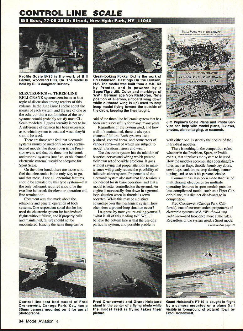 CONTROL LINE SCALE ELECTRONICS vs THREE-LINE BELLCRANK systems continues topic discussion among readers column June issue spoke about merits system use other combination two systems would probably satisfy CL Scale modelers guess serenity difference opinion has expressed system best they/it should used feel electronic systems should used very sophis ticated models like flown Preci sion event three-line belicrank pushrod systems five- six-channel electronic systems would adequate Sport Scale other hand feel electronics way go operating features should actuated type systemthat bellcrank required should two-line bellcrank elevator operation line termination Comment also made about reliability general operation both systems respondent noted has used electronic system hundreds flights failure properly built maintained failure should encountered Exactly same thing can said three-line bellcrank system has used successfully many years Regardless system used well its maintained always chance failure Both systems use pushrod control horns connectors various sortsall subject model vibrations stress wear electronic system has addition batteries servos wiring present own set possible problems goes saying proper attention main tenance will greatly reduce possibility failure either system Proponents electronic system also note line tension needed its basic operation model better controlled ground An engine easily shut down groundloop situation its throttle servo operated may distinct advantage over mechanical system often does ground-loop situation occur suppose now youre asking yourself what leading Well believe bottom line use particular system possible problems either strictly choice individual modeler nothing competition rules whether Precision Sport Profile events stipulates system used modeler accomplishes operating fea tures such flaps throttle bomb bay doors cowl flaps tank drops crop dusting banner towing personal choice Comment has also made use multichannel electronics multiple operating features sport models puts less-complicated model such Piper Cub biplane distinct disadvantage competition Fred Cronenwett Canoga Park Cali fornia ardent proponents electronic systems said should stop right hereand look once rules Regardless system used Sport model 84 Model Aviation ile Scale 5-25 work Bill Great-looking Fokker Drl work Barber Woodland Hills CA model Ed Robinson Hastings Hudson held Bills daughter Brittany NY model built VK Kit Proctor powered SuperTigre 60 Color markings WW German ace Von Richtofen Note position ailerons inboard wing down outboard wing up used help keep model flying toward outside circle keeping lines taught Jim Pepinos Scale Plans Photo Ser vice can help model plans 3-views photos plan enlarging research Continued page 88 Control line test bed model FredFred Cronenwett Grant Heistand Cronenwett Canoga Park Ca has astand center flying circle 35mm camera mounted aerialthe model Fred flying takes photographspicture Grant Heistands PT-19 caught flight camera mounted plane tail visible foreground picture flown Fred Cronenwett During years popular Fox 45BB motor has refined has maintained its excellent reputation power durability newest Fox 45s light weight extremely user friendly now equipped new Fox Single Needle E-Z Carbi youre looking little extra power same user friendly' characteristics try FOX 50DB RC Fox motors backed limited Lifetime Warranfy motor fails prematurely due factory detect abuse use synthetic fuels repaired no charge POWER YOUR AIRPLANE WITH PROVEN PERFORMER FLY FOXI MOTOR REPAIR POLICY interest Fox motors perform well field reason repair policy intended insure repaired Fox motors will run well possible customers leel repair charges reasonable following basis will follow until further notice 1 Any motor sent us disassembled inspected necessary parts replaced reassembled check run insure its proper pertormance Only motor runs well returned customer Otherwise pulled down second time parts replaced 2 The charges made basis retail price parts used charge labor charges less $1000 $1000 charged price parts exceeds 50% current retail price motor 50% maximum charged necessary replace part way can assured whatever condition motor send us will get good running motor back will cost new 3 Of course inspection shows part failed prematurely due factory defect would make no charge 4 Please ask give estimates An estimate made disassembling motor just guess time motor logged disassembled inspected letter written cost almost great completing repair 5 If give us Visa Mastercard number expiration date motor will returned prepaid Otherwise motor will returned COO FOX MANUFACTURING COMPANY 5305 Towson Avenue 57 Fort Smith AR 72901 Phone 501-646-1656 FOXFAX 501-646-17- CL ScalelBoss Continued page 84 required perform six flight options simptest models engine control should able accomplish making equally competitive complicated models less-complicated throttle-controlled model should able following six options taxi lap touch-and-go worth two options engine control three laps circle 45O addition prototype may have performed banner towing crop dusting various aerobatic maneuvers little research prototype should reveal what model should capable doing up modeler prac rice flight features done well makes less sophisticated model equally competitive real bottom line modeler chooses model control system wishes build fly skills abilities determine well modet will perform competition also believe should restrictive way about control system used given event want see CL Scate events grow electronic controls improve numbers activity appears number requests have received Electronic System Mini-Guide theyre still coming interest use electronics CL models high As use promotion stand ard three-line system am ready willing present information new ideas operation model operating feature Control Line aerial photography new scale option Fred Cronenwett does very simply attach 35mm camera model get airb