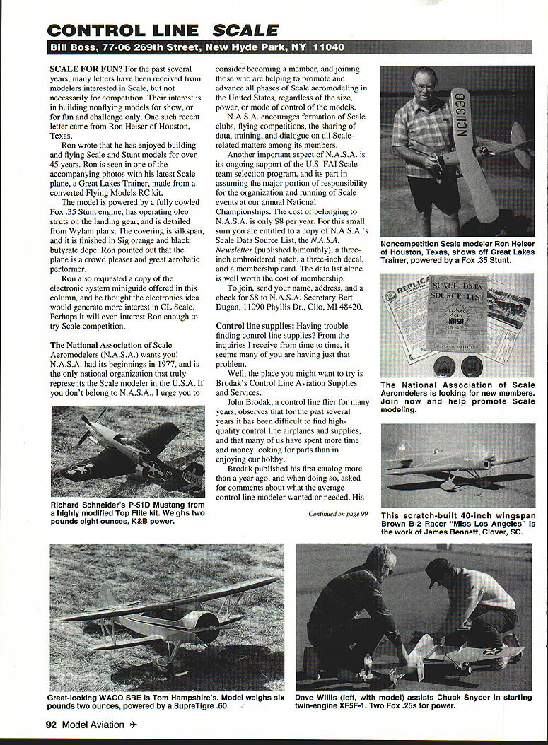 CONTROL LINE SCALE U ru U SCALE FOR FUN past several years letters have received modelers interested Scale necessarily competition interest building nonflying models show fun challenge such recent letter came Ron Heiser Houston Texas Ron wrote has enjoyed building flying Scale Stunt models over 45 years Ron seen accompanying photos latest Scale plane Great Lakes Trainer made converted Flying Models RC kit model powered fully cowled Fox 35 Stunt engine has operating olco struts landing gear detailed Wylam plans covering silkspan finished Sig orange black butyrate dope Ron pointed out plane crowd pleaser great acrobatic performer Ron also requested copy electronic system miniguide offered column thought electronics idea would generate interest CL Scale Perhaps will interest Ron enough try Scale competition National Association Scale Aeromodelers NASA wants NASA its beginnings 1977 national organization truly represents Scale modeler USA dont belong NASA urge consider becoming member joining helping promote advance phases Scale aeromodeling United States regardless size power mode control models NASA encourages formation Scale clubs flying competitions sharing data training dialogue Scalerelated matters among its members Another important aspect NASA its ongoing support US FAI Scale team selection program its part assuming major portion responsibility organization running Scale events annual National Championships cost belonging NASA $8 per year small sum entitled copy NASA s Scale Data Source List NASA Newsletter published bimonthly threeinch embroidered patch three-inch decal membership card data list alone well worth cost membership join send name address check $8 NASA Secretary Bert Dugan 11090 Phyllis Dr Clio MI 48420 Control line supplies Having trouble finding control line supplies inquiries receive time time seems having just problem Well place might want try Brodaks Control Line Aviation Supplies Services John Brodak control line flier years observes past several years has difficult find highquality control line airplanes supplies us have spent time money looking parts enjoying hobby Brodak published first catalog year ago doing asked comments about what average control line modeler wanted needed 92 Model Aviation ompetition Scale modeler Ron Heiser Houston Texas shows off Great Lakes Trainer powered Fox 35 Stunt National Association Scale Aeromdelers looking new members Join now help promote Scale modeling Richard Schneiders P-51 D Mustang highly modified Top Flite kit Weighs twoContinued page 99This scratch-built 40-inch wingspan pounds eight ounces K&B powerBrown B-2 Racer Miss Los Angeles work James Bennett Clover SC Great-looking WACO SRE Tom Hampshires Model weighs six Dave Willis len model assists Chuck Snyder starting pounds two ounces powered SupreTigre 60 twin-engine XF5F-1 Two Fox 25s power CL ScalelBoss Continued paqe 92 response needs often mentioned now second catalog 89 pages dedi cated entirely listing control line kits engines supplies great importance control liners Brodak s carries complete line two- three-line bellcranks handles now known Brodak J Roberts bellcranks handles control systems previously known LR GS sys tems Included 100 CL airplanes listed famous J Roberts profile scale models Bearcat Corsair Skyraider Also included Roberts classic Scale kits Howard DGA 57inch wingspan Stinson Reliant SR-6 62-inch wingspan kits recent conversation J Robert Smurthwaite originator J Roberts profile models remarked good chance adding four designs profile line P-5 H Supermarine Spiteful Seafang Martin AM- 1 Mauler Grumman F7F-3 Tigercat about same size original line Anyone wishing receive copy great new catalog can write Brodak s Control Line Aviation Supplies Services 100 Park Ave Carmichaels PA 15320 Tel 412 966-2726 Cost catalog $3 Workshop hints Bob Furr Orbiting Eagles Omaha says making flexible cable leadouts has always problem him because hard because tubing needed crimped ends too easily cut noted shopping fishing tackie came across precut tubing sleeves used making cable fishing leaders sleeves come various sizes cleanly cut save lot time sleeves available local fishing/bait shop perhaps theyll order placing order option sleeves can obtained Netcraft Company 2800 Tremainsville Rd Toledo OH 43613 Netcraft has surfion connector sleeves five sizes might used model leadouts following inside diameters #1-033 #2-047 #3-055 #4-071 #5-080 sleeves depending size come boxes 25 36 bags 100 crimping tool also available full details cost sleeves crimping tool write Netcraft Bob goes say insist cutting own tubing can done inserting music wire tubing rolling tubing under modeling knife score Once tubing scored move music wire until lines up score flex tubing Usually will break cleanly along score because brass copper harden rapidly knife rolled over Hair clips following tip found Wing Tips newsletter Mid-Hudson Modelmasters meant tip Peanut Scale builders dont know reason cant useful Scale builders Useful lightweight clamps can made easily aluminum hair clips can formed/shaped accommodate various clamping requirements clamping action soft firm makes clips suitable clamping chores building fine details cockpit Because long reach also make excellent selfclosing tweezers clips cost about two dollars six-pack local drug store store sells womens hair accessones Heeeeelp Now winter months have passed new flying season hand am writing column beginning June maybe will have some new mate rial column about telling about new projects special building techniques about photos can use new supply things write about Please send ideas notice upcoming CL Scale events contest reports especially photos CL Scale activity address very top coluam engines performance anything less True AAC ABC piston/cylinder assemblies Now available over 25 different types popular engines choice professional modelers worldwide Send $200 1993 catalog Performance Specialties ox 3146 nerville NV 89410 Phone 702 265-7