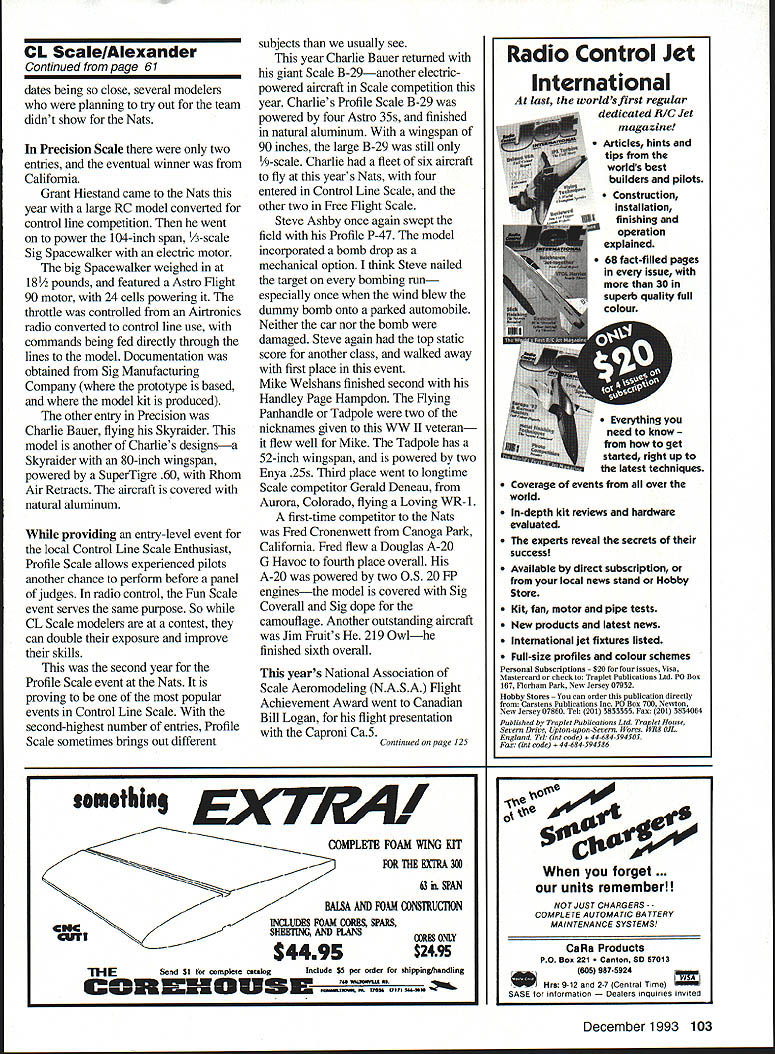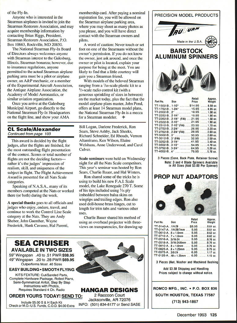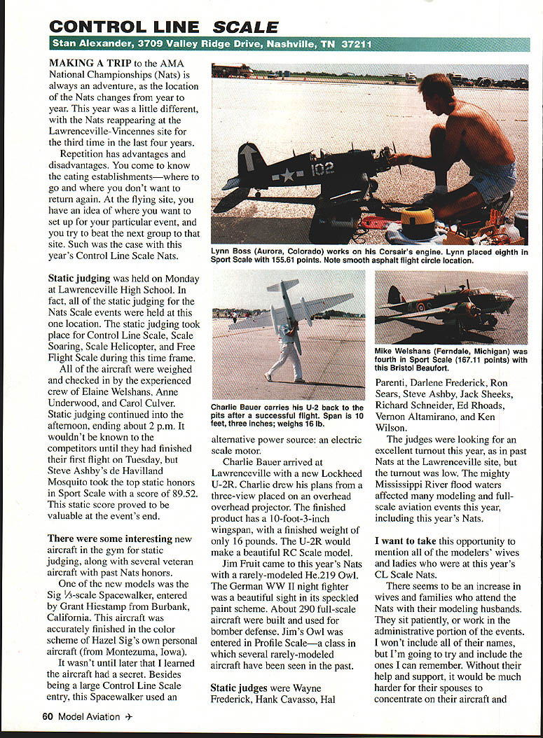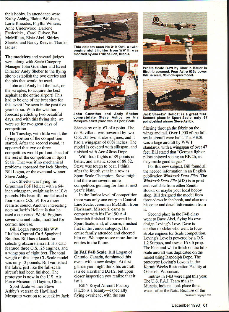 CONTROL LINE SCALE MAKING TRIP AMA National Championships Nats always adventure location Nats changes year year year little different Nats reappearing Lawrenceville-Vincennes site third time last four years Repetition has advantages disadvantages come know eating establishmentswhere go dont want return again flying site have idea want set up particular event try beat next group site Such case years Control Line Scale Nats Static judging held Monday Lawrenceville High School fact static judging Nats Scale events held location static judging took place Control Line Scale Scale Soaring Scale Helicopter Free Flight Scale during time frame aircraft weighed checked experienced crew Elaine Welshans Anne Underwood Carol Culver Static judging continued afternoon ending about 2 pm wouldnt known competitors until finished first flight Tuesday Steve Ashbys de Havilland Mosquito took top static honors Sport Scale score 8952 static score proved valuable events end some interesting new aircraft gym static judging along several veteran aircraft past Nats honors new models Sig 1/3-scale Spacewalker entered Grant Hiestamp Burbank California aircraft accurately finished color scheme Hazel Sigs own personal aircraft Montezuma Iowa wasnt until later learned aircraft secret Besides being large Control Line Scale entry Spacewalker used alternative power source electric scale motor Charlie Bauer arrived Lawrenceville new Lockheed U-2R Charlie drew plans three-view placed overhead overhead projector finished product has 1 O-foot-3-inch wingspan finished weight 16 pounds U-2R would make beautiful RC Scale model Jim Fruit came years Nats rarely-modeled He219 Owl German WW II night fighter beautiful sight its speckled paint scheme About 290 full-scale aircraft built used bomber defense Jims Owl entered Profile Scalea class several rarely-modeled aircraft have seen past Static judges Wayne Frederick Hank Cavasso Hal Parenti Darlene Frederick Ron Sears Steve Ashby Jack Sheeks Richard Schneider Ed Rhoads Vernon Altamirano Ken Wilson judges looking excellent turnout year past Nats Lawrenceville site turnout low mighty Mississippi River flood waters affected modeling fullscale aviation events year including years Nats want take opportunity mention modelers wives ladies years CL Scale Nats seems increase wives families attend Nats modeling husbands sit patiently work administrative portion events wont include names Im going try include ones can remember Without help support would much harder spouses concentrate aircraft 60 Model Aviation Boss Aurora Colorado works Corsairs engine ynn piacea eigrnn Sport Scale 15561 points Note smooth asphalt flight circle location Mike Weishans Ferndale Michigan fourth Sport Scale 16711 points Bristol Beaufort Charlie Bauer carries U-2 back pits after successful flight Span 10 feet three inches weighs 16 lb hobby attendance Kathy Ashby Elaine Weishans Lone Rhoades Phyllis Winters Anne Underwood Darlene Fredericks Carol Culver Pat McMillian Elsie Abel Shirley Sheeks Nancy Reeves Thanks ladies modelers several judges went along Scale Category Manager John Guenther Event Director Andy Sheber flying site establish two circles pits would used John Andy luck scruples acquire best asphalt entire airport best sites event Ive seen past five years weather forecast predicting two beautiful days flying site set two great days competition Tuesday little wind flying portion competition started After second round appeared two three competitors would pull out ahead rest competition Sport Scale no mechanical problems appeared Jack Sheeks Bill Logan eventual winner Steve Ashby Jack Sheeks flying Grumman F6F Hellcat 64inch wingspan weighing 1O/2 pounds beautiful model used four-stroke 05 91 realistic sound Another interesting note Jacks Hellcat used converted World Engines seven-channel radio modified control line use Bill Logan entered WW Italian Caproni Ca5 Spaghetti Bomber Bill has knack selecting obscure aircraft Ca5 featured three OS 25 engines wingspan eight feet total weight large CL Scale model 13 pounds Bill varnished fabric just like full-scale aircraft finished prototype now US Air Force Museum Dayton Ohio Sport Scale winner Steve Ashbys veteran de Havilland Mosquito went squeak Jack Sheeks 67 point de Havilland powered two OS 35 two-stroke engines wingspan 60 inches model covered silkspan finished AeroGloss Dope four flights 89 points better static score 8952 Steve tough beat think after fourth year row Sport Scale Champion Steve might find several competitors gunning him next years Nats Junior level competition entry Control Line Scale Jeremiah McMillin Florissant Missouri came compete Fw 190 A-4 Jeremiah finished 10th overall Sport Scale course finished first Junior category entire family attended cheered him hope see Junior entries future FAT F4B Scale Bill Logan Ontraio Canada dominated event new design first glance might think aircraft de Havilland DH2 upon closer inspection realize isnt Bills Royal Aircraft Factory FE2b beautyespecially flying overhead sun filtering through fabric wings tail Over 1900 fullscale aircraft built FE2b large aircraft WW standards wingspan over 47 feet Bill stated German fighter pilots enjoyed seeing FE2b made good targets new subject Bill found needed information English publication Windsock Data Files Windsock Data File #18 print available either Zenith Books maybe local hobby shop Bill designed model three-views book also took color detail information Second place F4B class went Dave Abel flying owndesign Lovings Love Dave another modeler went fourstroke engines Scale competition Lovings Love powered OS 12 Surpass uses 16 x 6 prop blue-and-white finish fullscale aircraft duplicated model using Randolph Dope prototype Lovings Love Kermit Weeks Restoration Facility Oshkosh Wisconsin Entries F4B light year US EAI Team trials Muncie Indiana took place three weeks after Nats Because Continued page 103 December 1993 61 seldom-seen He-219 Owl twinengine night fight