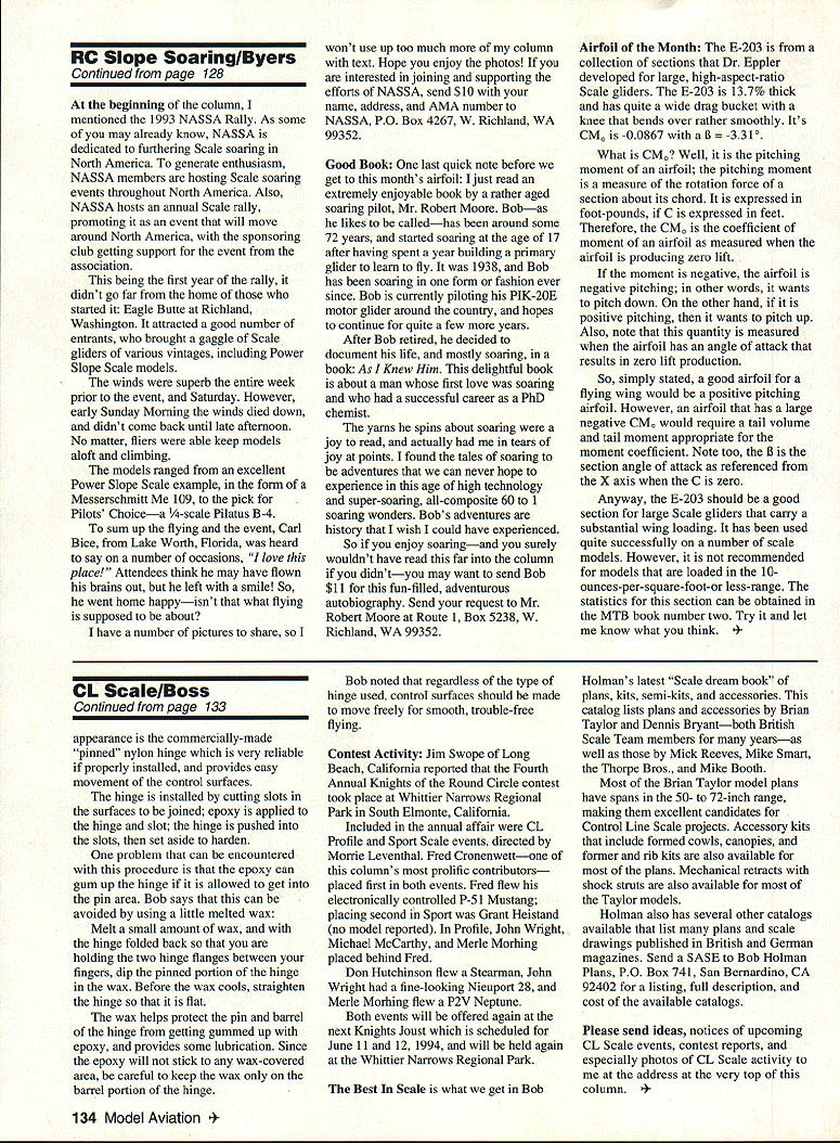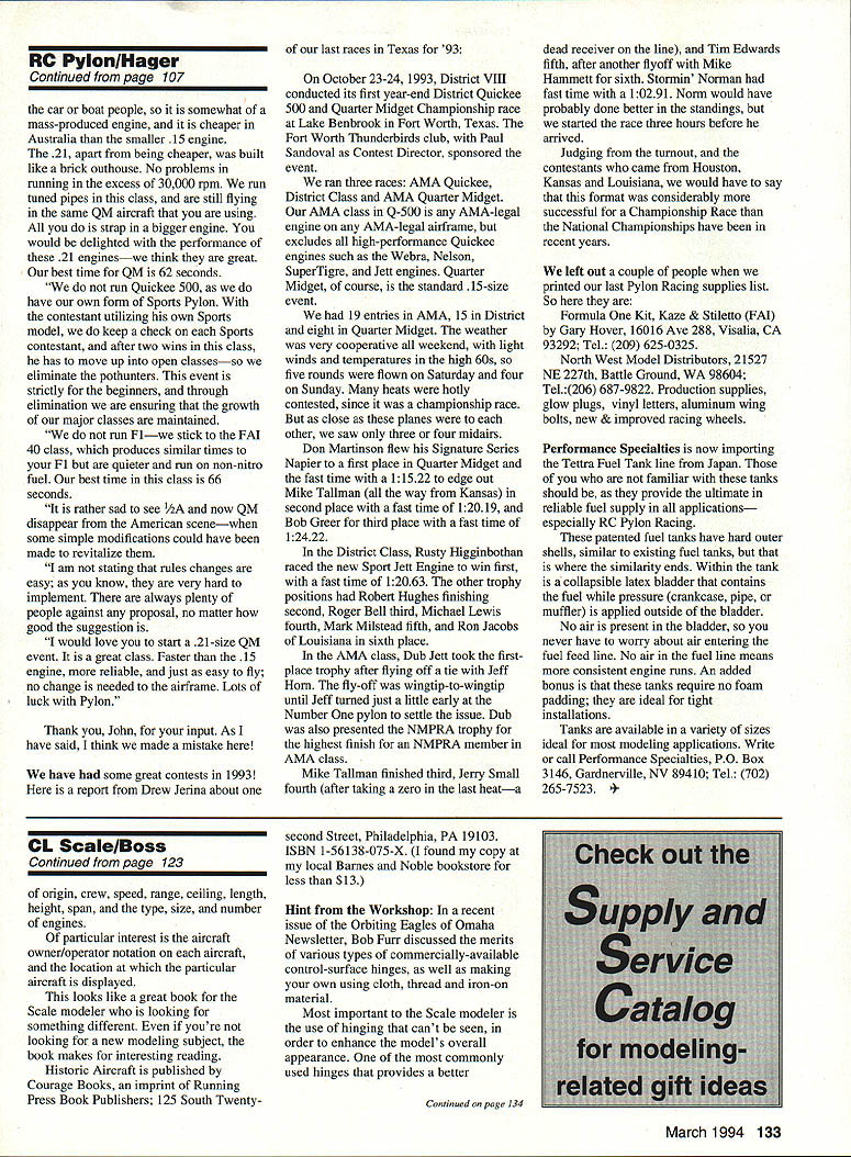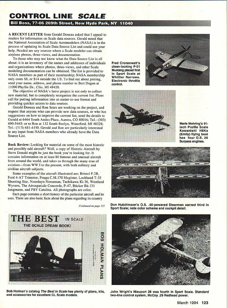 CONTROL LINE SCALE 11111 RECENT LETTER Gerald Deneau asked appeal readers information Scale data sources Gerald noted National Association Scale Aeromodelers NASA process updating its Scale Data Source List could use help Needed sources Scale modeler can obtain airplane photos three-views documentation may know what Data Source List about inventory names addresses individuals organizations photos three-views other Scale modeling documentation can obtained list provided NASA members part membership NASA membership costs $8 $14 outside US find out about joining send name address phone number Bert Dugan 11090 Phyllis Dr Clio MI 48420 objective NASAs latest project collect new material completely reorganize current list Plans call putting information easier-to-use format providing quicker access data sources Gerald Deneau Ron Sears working project request anyone can provide new data sources has suggestions improve current list send details Gerald 6464 South Andes Place Aurora CO 80016 Tel 303 690-5445 Ron 132 South Roslyn Waterford MI 48328 Tel 313 681-4150 Gerald Ron particularly interested input NASA members already have Data Source List Book Review Looking material some historic possibly odd aircraft Well copy Historic Aircraft Steve Donald might just book youre looking contains information least 80 famous unusual aircraft around world takes us through eras aviationfrom WW Ito present both military civilian aircraft subjects Some examples aircraft illustrated Bristol F2B Ford 4-AT Trimotor Fouga CM170 Magister Lockheed T-33 Shooting Star Noorduyn Norseman Tachikawa Ki-36 Westland Wyvern Arospatiale Concorde P-47 BUcker Bu 131 Jungmann PBY Catalina photographs color page contains short history particular aircraft its uses also basic facts about plane regarding its country Fred Cronenwetts clean-looking P-51 Mustang placed first Sport Scale Whittier Narrows Electronic throttle control Merle Mohrings 91inch Profile Scale Kawanishi H8Ka Emily flying boat has four OS 26 Surpass engines March 1994 123 Continued page 133 Don Hutchinsons OS 40-powered Stearman earned third Sport Scale note color scheme cockpit detail Bob Holmans catalog Best Scale has plenty plans kitsJohn Wrights Nleuport 28 fourth Sport Scale Standard accessories excellent CL Scale modelstwo-line control system Mccoy 29 Redhead power RC PylonlNager Continued page 107 car boat people somewhat mass-produced engine cheaper Australia smaller 15 engine 21 apart being cheaper built like brick outhouse No problems running excess 30000 rpm run tuned pipes class still flying same QM aircraft using strap bigger engine would delighted performance 21 engineswe think great best time QM 62 seconds run Quickee 500 have own form Sports Pylon contestant utilizing own Sports model keep check Sports contestant after two wins class has move up open classesso eliminate pothunters event strictly beginners through elimination ensuring growth major classes maintained run Flwe stick FAI 40 class produces similar times Fl quieter run non-nitro fuel best time class 66 seconds rather sad see 1/2A now QM disappear American scenewhen some simple modifications could have made revitalize am stating rules changes easy know very hard implement always plenty people against proposal no matter good suggestion would love start 21-size QM event great class Faster 15 engine reliable just easy fly no change needed airframe Lots luck Pylon Thank John input As have said think made mistake have some great contests 1993 report Drew Jerina about last races Texas 93 October 23-24 1993 District VIII conducted its first year-end District Quickee 500 Quarter Midget Championship race Lake Benbrook Fort Worth Texas Fort Worth Thunderbirds club Paul Sandoval Contest Director sponsored event ran three races AMA Quickee District Class AMA Quarter Midget AMA class Q-500 AMA-legal engine AMA-legal airframe excludes ail high-performance Quickee engines such Webra Nelson SuperTigre Jett engines Quarter Midget course standard 15-size event 19 entries AMA 15 District eight Quarter Midget weather very cooperative weekend light winds temperatures high 60s five rounds flown Saturday four Sunday heats hotly contested since championship race close planes other saw three four midairs Don Martinson flew Signature Series Napier first place Quarter Midget fast time 11522 edge out Mike Tallman way Kansas second place fast time 12019 Bob Greer third place fast time 12422 District Class Rusty Higginbothan raced new Sport Jett Engine win first fast time 12063 other trophy positions Robert Hughes finishing second Roger Bell third Michael Lewis fourth Mark Milstead fifth Ron Jacobs Louisiana sixth place AMA class Dub Jett took firstplace trophy after flying off tie Jeff Horn fly-off wingtip-to-wingtip until Jeff turned just little early Number pylon settle issue Dub also presented NMPRA trophy highest finish NMPRA member AMA class Mike Tallman finished third Jerry Small fourth after taking zero last heata dead receiver line Tim Edwards fifth after another flyoff Mike Hammett sixth Stormin Norman fast time 10291 Norm would have probably done better standings started race three hours before arrived Judging turnout contestants came Houston Kansas Louisiana would have say format considerably successful Championship Race National Championships have recent years left out couple people printed last Pylon Racing supplies list So Formula Kit Kaze & Stiletto FAI Gary Hover 16016 Ave 288 Visalia CA 93292 Tel 209 625-0325 North West Model Distributors 21527 NE 227th Battle Ground WA 98604 Tel206 687-9822 Production supplies glow plugs vinyl letters aluminum wing bolts new & improved racing wheels Performance Specialties now importing Tettra Fuel Tank line Japan familiar tanks should provide ultimate reliable fuel supply applications especially RC Pylon Racing patented fuel tanks have hard outer shells similar existing fuel tanks similarity ends Within tank collapsible latex bladder contains fuel pressure crankcase
