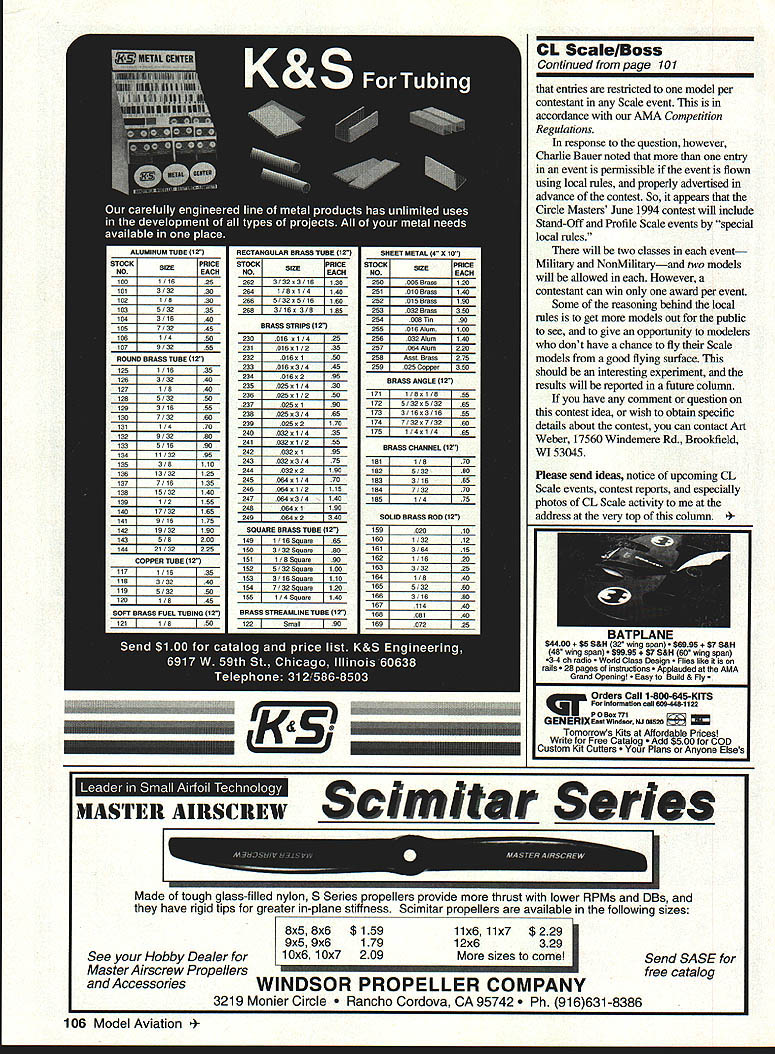 CONTROL LINE SCALE THE QUICK DECAL following article found Probable Cause newsletter Rocky Mountain Aeromodelers editor stated article originated Don Bartic Indy Sportliners MAC neat would decorate latest creations custom decals reflecting bizarre imagination synonymous free fighters us have skills cut out tissue images represent original intent Well fans life good long photocopier available Keep eyes focused text because author going guide through very simple process once experience youll think am genius will naming kids dogs cats squirrels after goes. First look telephone directory yellow pages under heading Artists Materials find closest store give store call ask carry sheets MACTAC Chartpak applique film Most likely theyll tell get material comes 8inch x il-inch sheets 15 mils thick flexible Now create designs plain paper adhere copies artwork such logos typed copy anything will copy copy machine third step now complete youll find its no brain-buster far Now comes hard part Take artwork applique film place photocopier like work go quality copiers have single-sheet feeds So place artwork original copy platen close cover feed applique film hand may want experiment sheet copy paper first make sure side copies before waste film about $1 per sheet important applique film has backing sheet want sure copied artwork will appear film film backing Application newly made decal simple film self-adhesive apply just cut around image lightly Acto knife necessary cut through backing sheet Place decal desired surface burnish place article goes warn newly made decal fuel-proof apply butyrate dope other dope surface want soak surface 60% nitro fuel coat epoxy polyurethane order process sounds like just thing dressing up Scale models nomenclature found military planes Using computer laser printer allows print font size would great creating propersize lettering particular model printer use doesnt make small enough local print shops have copiers can reduce copy fine increments Sounds like great processwhy give atry Mustang Modeler Enthusiast MM E new newsletter edited Charles L Neely dedicated dissemination information oneand airplane Mustang hoped new publication will provide means collecting providing accurate Mustang data will aid producing accurate model also hoped newsletter will appeal interested lesserknown histories personal experiences relate subject Neely explains popularity Mustang has inspired much myth legend has obscured tainted what aircraft really was/is hoped interchange data history ideas will separate fact fiction notes learn about something realize did know mind hopes will share realization Mustang truth much interesting Mustang legend Plans have well-balanced format covering static display radio control free flight control line concepts substantial forays realms literature kit reviews full-size aircraft MM E will published quarterly Charles Neely 4142 W Cambridge Ave Visalia CA 93277 four-issue subscription will $16 US $20 orders outside US Approximate dates publication will first January April July October full details subscriptions write address above Contest Activity Art Weber member Circle Masters Flying Club Wisconsin reported 1993s CL meet included Sport Profile Scale quite successful After meet over contestant asked model could entered event answeras us knowis Continued page 106 April 1994 101 Joe Sroczyks Mustang looks great about take oft Merle Mohrings Corsair powered SuperTigre 40 weighs about 11 pounds powered Fox Eagle 60 single-channel electronic system controls throttle Art Webers Curtiss P-40 weighs 75 pounds has SuperTigre 60 standard three-line control system Art Webers Gee Bee NR2100 weighs about two pounds 08 Max 25 power standard three-line control system CL Scale/Boss Continued page 101 entries restricted model per contestant Scale event accordance AMA Competition Regulations response question however Charlie Bauer noted entry event permissible event flown using local rules properly advertised advance contest So appears Circle Masters June 1994 contest will include Stand-Off Profile Scale events special local rules will two classes event Military NonMilitaryand two models will allowed However contestant can win award per event Some reasoning behind local rules get models out public see give opportunity modelers dont have chance fly Scale models good flying surface should interesting experiment results will reported future column have comment question contest idea wish obtain specific details about contest can contact Art Weber 17560 Windemere Rd Brookfield WI 53045 Please send ideas notice upcoming CL Scale events contest reports especially photos CL Scale activity address very ton column * qUa Orders Call 1-800-645-KITS lnfeoatlos call 609448-1122 P0 Box 771 GENERIX East Windsor NJ 00520 Tomorrows Kits AffordbIe Pncesl Write Free Catalog Add $500 COD Custom Kit Cutters s Anyone Elses ill RSC REW 5dm itar Series Made tough glass-filled nylon S Series propellers provide thrust lower RPMs DBs have rigid tips greater in-plane stiffness Scimitar propellers available following sizes 8x58x6 $15911x611x7 $229 9x5 9x617912x6329 1 0x6 1 0x7209More sizes come See Hobby Dealer Master Airscrew Propellers Accessories WINDSOR PROPELLER COMPANY 3219 Monier Circle ho Cordova CA 95742 16631-8386 106 Model Aviation SASE free catalog R VLRI4L $4400 &H 32 wing spanl 5 &H 48 wing spanl 5 &H So wing span 3-4 ch radio d cisas Design s like rails ages instructions Applauded AMA Grand Openingi Build & Fly I
