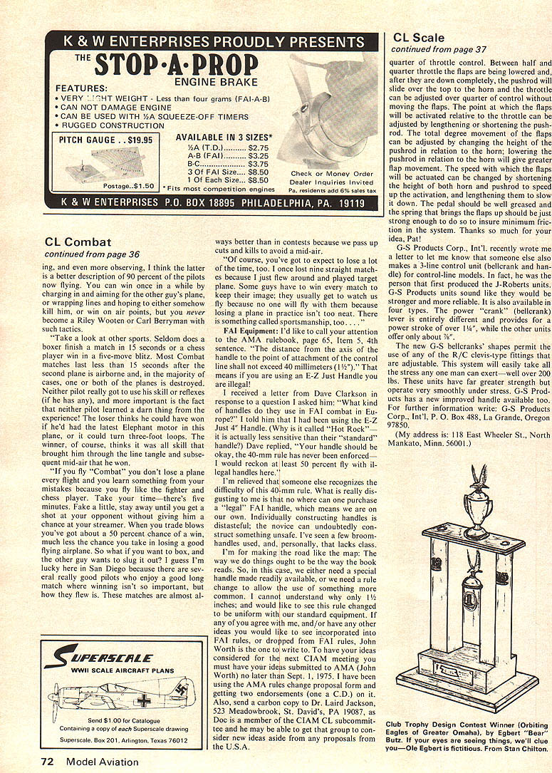 Scale Mike Stott Last month discussed what look choosing good scale model month lets talk about what can done detailing Metal-covered aircraft always impressive gives realistic looking over-lap joints well butt joints several different methods covering metal Bill Harney uses requires thin metal print ing plates cut scale panel shapes model formed fuselage wing glued place good contact cement future article well have use metal covering scale model simulate panel markings standard balsa wood construction first mark out panel markings scale location assure proper placement panel lines apply masking tape two layers thick side marked line other panel overlaps Next mix formula Sigment clear dope talcum powder putty-like consistency Layer putty panel area raised up feathering back about inch masking tape Wait till putty mixture has dried sand down level masking tape sure sand completely down masking tape dont later remove tape may break out piece panel line leave rough unfinished edge Putting panel markings last step project finishing covering must have filler coats model before hand since wont want re-sand once panel lines model good tip remember putting filler coats covering mix little paint base color model filler will reduce amount color paint needed finish model later add raised rivets metal-covered model could punch back side metal before putting metal covering model An alternative suggestion drill small holes metal covering press 1/32 round head rivets rivets avail able Sig Mfg Co Inc No glue needed individual rivet because paint model later paint will help hold securely place alternative suggestion using round head rivets can used standard balsa wood construction very good results first column wrote about use control hook-ups Well Mr Patrick Mullen Glendale Wisc wrote method activating flaps control-line model does require motors switches yet gives throttle control somewhat independent flaps As diagrams show pushrod throttle control 3-line bellcrank system passes through guide nylon metal acts against special flap horn consists brass pedal soldered standard flap horn flaps will remain up top half throt tle control will remain down during last continued page 72 7jDEBRASS PLATE HORN PUSH RD 0 SPRI N HIGH THROTTLE BRASS PLATE FLAP HORN1 1/2 THRO 0 1/4 THRO III 0 0 LOW THROTTLE 4-7-75 Mt /003 Top left Bill Rutherford Irving Tex Fox 78-powered YAK won first CL Scale meet Abilene Tex Left Bill Cronk Abilene Fire Dept Capt Fox 35-powered Spitfire En tire model finished MonoKote no paint anywhere Jerry Farr photo September 1975 37 FEATURES VERY ThT WEIGHT Less four grams FAI-A-B CAN NOT DAMAGE ENGINE CAN BE USED WITH %A SQUEEZE-OFF TIMERS RUGGED CONSTRUCTION PITCH GAUGE $1995 IPostage.$150 CL Combat continued page 36 ing observing think latter better description 90 percent pilots now flying can win once charging aiming other guys plane wrapping lines hoping either somehow kill him win air points never become Riley Wooten Carl Berryman such tactics Take look other sports Seldom does boxer finish match 15 seconds chess player win five-move blitz Most Combat matches last less 15 seconds after second plane airborne majority cases both planes destroyed Neither pilot really got use skill reflexes has important fact neither pilot learned darn thing experience loser thinks could have won hed latest Elephant motor plane could turn three-foot loops winner course thinks skill brought him through line tangle subse quent mid-air won fly Combat dont lose plane flight learn something mistakes because fly like fighter chess player Take timetheres five minutes Fake little stay away until get shot opponent giving him chance streamer trade blows youve got about 50 percent chance win much less chance take losing good flying airplane So what want box other guy wants slug out guess Im lucky San Diego because sev eral really good pilots enjoy good long match winning isnt important flew matches almost al AVAILABLE IN 3 SIZES* AA TD$275 A-B FAIl$325 B-C$375 3 FAI Size.. $850 1 Size. $850 Fits competition engines ways better contests because pass up cuts kills avoid mid-air course youve got expect lose lot time too once lost nine straight match es because just flew around played target plane Some guys have win match keep image usually get watch us fly because no will fly because losing plane practice isnt too neat something called sportsmanship too FAI Equipment Id like call attention AMA rulebook page 65 Item 5 4th sentence distance axis handle point attachment control line shall exceed 40 millimeters 1 means using E-Z Just Handle illegal received letter Dave Clarkson response question asked him What kind handles use FAI combat Eu rope told him using E-Z Just 4 Handle called Hot Rock actually less sensitive standard handle Dave replied handle should okay 40-mm rule has never enforced would reckon least 50 percent fly il legal handles Im relieved someone else recognizes difficulty 40-mm rule What really dis gusting no can purchase legal FAI handle means own Individually constructing handles distasteful novice can undoubtedly con struct something unsafe Ive seen few broomhandles used personally lacks class Im making road like map way things ought way book reads So case either need special handle made readily available need rule change allow use something common cannot understand inches would like see rule changed uniform standard equipment agree and/or have other ideas would like see incorporated FAI rules dropped FAI rules John Worth write have ideas considered next ClAM meeting must have ideas submitted AMA John Worth no later Sept 1 1975 have using AMA rules change proposal form getting two endorsements CD Also send carbon copy Dr Laird Jackson 523 Meadowbrook St Davids PA 19087 Doe member ClAM CL subcommit tee may able get group con sider new ideas aside proposals USA CL Scale continued page 37 quarter throttle control Between half quarter throttle flaps being lowered after down completely pushrod will slide over top