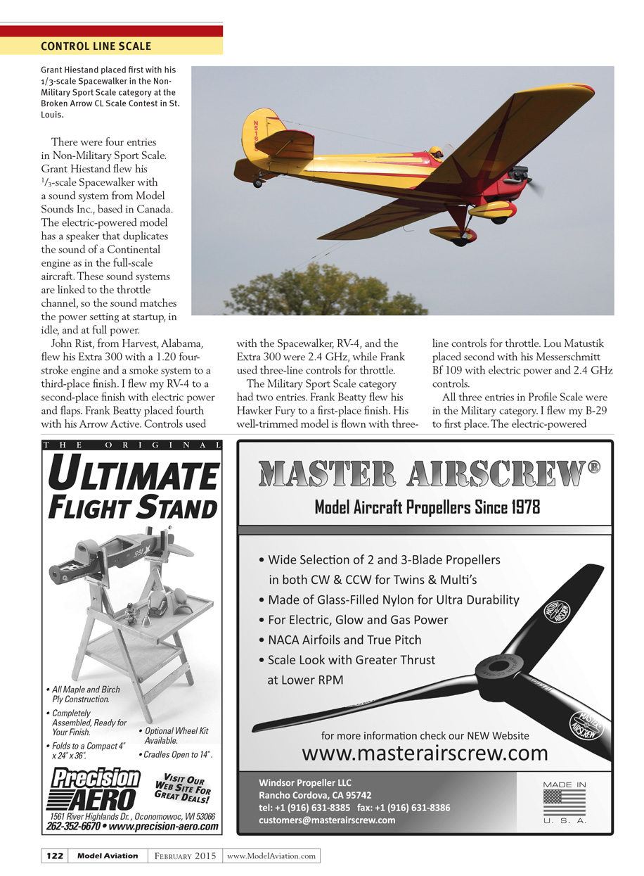 There were four entries in Non-Military Sport Scale. Grant Hiestand flew his 1/3-scale Spacewalker with a sound system from Model Sounds Inc., based in Canada. The electric-powered model has a speaker that duplicates the sound of a Continental engine as in the full-scale aircraft. These sound systems are linked to the throttle channel, so the sound matches the power setting at startup, in idle, and at full power.