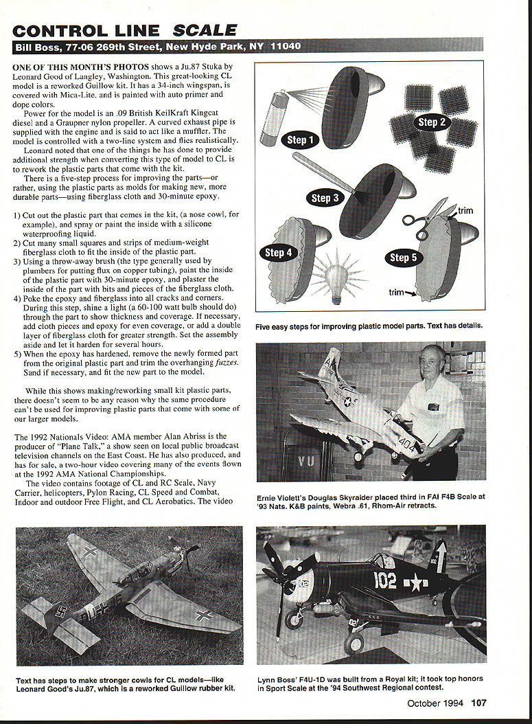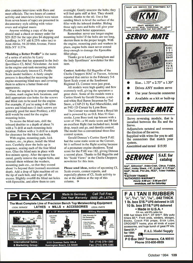 CONTROL LINE SCALE ONE OF THIS MONTHS PHOTOS shows Ju87 Stuka Leonard Good Langley Washington great-looking CL model reworked Guillow kit has 34-inch wingspan covered Mica-Lite painted auto primer dope colors Power model 09 British KeilKraft Kingcat diesel Graupner nylon propeller curved exhaust pipe supplied engine said act like muffler model controlled two-line system flies realistically Leonard noted things has done provide additional strength converting type model CL rework plastic parts come kit five-step process improving partsor rather using plastic parts molds making new durable partsusing fiberglass cloth 30-minute epoxy 1 Cut out plastic part comes kit nose cowl example spray paint inside silicone waterproofing liquid 2 Cut small squares strips medium-weight fiberglass cloth fit inside plastic part 3 Using throw-away brush type generally used plumbers putting flux copper tubing paint inside plastic part 30-minute epoxy plaster inside part bits pieces fiberglass cloth 4 Poke epoxy fiberglass cracks corners During step shine light 60-100 watt bulb should through part show thickness coverage necessary add cloth pieces epoxy coverage add double layer fiberglass cloth greater strength Set assembly aside let harden several hours 5 When epoxy has hardened remove newly formed part original plastic part trim overhanging fuzzes Sand necessary fit new part model shows making/reworking small kit plastic parts doesnt seem reason same procedure cant used improving plastic parts come some larger models 1992 Nationals Video AMA member Alan Abriss producer Plane Talk show seen local public broadcast television channels East Coast has also produced has sale two-hour video covering events flown 1992 AMA National Championships video contains footage CL RC Scale Navy Carrier helicopters Pylon Racing CL Speed Combat Indoor outdoor Free Flight CL Aerobatics video October 1994 107 Five easy steps Improving plastic model pafls Text has details Ernie Violetts Douglas Skyraider placed third FAI F4B Scale 93 Nats K&B paints Webra 61 Rhom-Air retracts Text has steps make stronger cowls CL modelslike Lynn Boss F4U-1 D built Royal kit took top honors Leonard Goods Ju87 reworked Gulilow rubber kit Sport Scale 94 Southwest Regional contest also contains interviews fliers meet officials two hours contest activity interviews taken seven hours tape presented documentary style editing voice overs original music Anyone wishing copy tape should mail check money order $29 $25 tape plus $4 shipping handling NY add 825% sales tax Alan Abriss 94-20 66th Avenue Forest Hills NY 11374 Building Better Profile name series articles Larry Cunningham has appeared Indy Sportliners CL MAC Newsletter An item engine-and-tank-mounting article might particularly interest CL Profile Scale model builders fairly simple process described recessing engine-mounting blind nuts covering achieve better front-end appearance Place engine its proper mounting location mark engine hole locations drill appropriate size holes screws blind nuts used engine example youre using 4-40 Allen screws blind nuts 1-inch screws generally good Profiles #33 drill would used engine mounting holes recess blind nuts drill inboard doubler depth about 1/ 3/ drill mounting-hole location Follow /8 drill depth clearance blind nut body engine mounting pads lock washers etc place install blind nuts Carefully draw bolts up sequence seating four blind nuts Glue blind nuts place five-minute epoxy After epoxy has cured gently remove engine bolts reinstall washers mounting pads etc extend about 46 beyond normal maximum depth Add drop light machine oil tip bolt wipe off excess Slightly overfill blind nut holes Epoxolite allow cure overnight Gently unscrew bolts will feel quite stiff first should release thanks oil Use flat sanding block level surface filler inboard doubler Hiding ugly nuts bolts will give Profile much better appearance Remember never use longer engine mounting bolts bolts too long shorten proper length engine mounting pads washers place engine bolts must never extend deep enough damage Epoxolite filler plugs Thanks go Larry Cunningham Indy Sportliners newsletter item Contest Activity Ed Hagerlin Cholla Choppers MAC Tucson Arizona reported entries February 5-6 Sport Scale event Southwest Regional CL Contest just great models high quality flew extremely well giving spectators great show Some models Curtiss Hawk Gerald Deneau redand-white Red Baron Stearman Ted Snow CAP-21 Karl Marschinke F4U-lD Corsair Lynn Boss Corsair made Royal kit powered OS Max 91 fourstroke Lynn Boss took top honors score 194a 96 static score 98 excellent flight included taxi bomb drop touch go throttle control model has conventional three-line control system Gerald Deneaus Curtiss Hawk P6E same static score Corsair bit suffered flight scoring because premature engine shutdown Total score P6E 182 giving Deneau second place Thanks Ed Hagerlin Scale Views Cholla Choppers newsletter item Please send ideas notice upcoming CL Scale events contest reports especially photos CL Scale activity address top column t Complete Line Precision Bench Top Metalworking Equipment LOCAL SER VICELATHES S SSORIES LOCAL PARTS SERVO MATE Use favourite connector Available kit built-up REVERSE MATE Servo reversing module installed between Rx Servo Adjusts/sets netutral reverses dirction servo Supplied wires add connectors match system Assembled tested $1995 SERVICE AE catalog Ace Alrtronlcs Aristo-Cralt Cirrus Futaba Hmec Hobby Shack J R K-Lhie K 0 Propo Kraff Novak Pro-Une ROD Tower Hobbles etc FACTORY TRAINED AUTHORIZED WARRANTY Hours 500 am- 500 pm EST weekdays cail tor Sat unlay October1994 109 SALES AND SERVICE FOR EVERYTHING R/C KRAFr MIDWEST INC 7420 SEVEN NILE NORThYILLE MI 40187 0104064800 FAX 0104061803 Size. 175 x 275 x 130 0 Drives ANY modem servo 0 Lathe MillHigh Accuracy 0000 800Co0000The Demanding TotalPmfessional MaohiningHenry 0010 Cob, Center StOoflO 0-StoNed TCbtC AcceptM Watchnakes foley & NeW Co