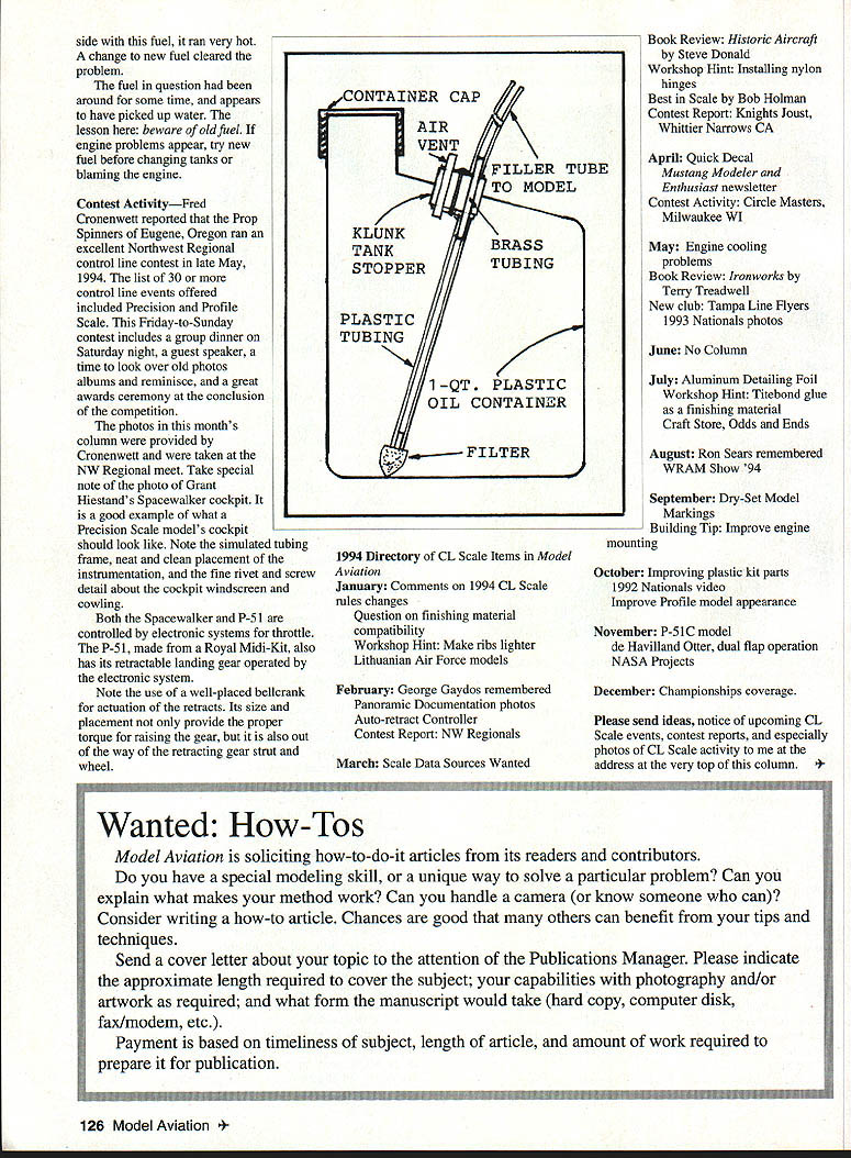 CONTROL LINE SCALE IN LAST MONTHS COLUMN addressed lack participation youth true beginners CL Scale some possible reasons same reason explored complexity rules thought high possible Junior participants beginners understand what takes get started CL Scale perhaps give beginner confidence try Scale modeling will devote portion next few columns subject Most what Ill presenting will based series articles found Ed Hagerlins Scale Views column Hangar Talk newsletter Cholla Choppers MAC Some general comments Anyone wishing get started Scale modeling should kind himself few simple things before considering what model build Following some recommended steps will give shortcuts long run give better view Scale modeling number thing doand perhaps important part Scale modelingis obtain read AMA Competition Regulations section about Scale sure read Scale General Unified Scale Judging Regulations sections rules well pertalning individual CL events No matter class Scale event decide fly read rules first will learn what expected model events Profile Sport Precision Understanding rules must because ways events relate another Example will find Profile Scale rules specifically detailed except Model Requirements refer Sport Scale event operation static judging flight judging Sport event highly detailed refers Precision FAI CL events allowable maneuvers operational features beyond listed Sport rules Jumping back forth rules can cause some basic things overlooked Are flying lines right size weight size model have too little too much documentation What model weight requirements Have filled out 46 Declaration Parts Built Which CL Scale events exempt 46 Rule need pilot cockpit What maneuvers can should flight program questions posed above may seem simple answers obvious have flown CL Scale some time can pose problems Scale beginner mind will try explore areas newcomer might need help guidance will cover little about rules model selection documentation static flight judging scoring Workshop Hints recent issue Orbiting Eagles newsletter George Lieb Bob Furr presented ideas seem go hand hand George wrote about making own model fuel tank filler Bob wrote about fuel problems George said handy inexpensive fuel tank filler can made almost suitable plastic container notes quartsize plastic oil bottles like yellow Pennzoil container work well hold enough fuel afternoons flying Containers Dexron automatic transmission fluid Quaker State Motor Oil also suitable have clear strip down side graduated/marked ounces providing convenient way see measure amount fuel container being transferred model accompanying sketch shows fuel filler bottle put together hole cut top container installation replacement klunk tank stopper fuel filler easily filled through large cap opening filter inside container will keep fuel clean times transfer fuel filler bottle model attach filler tubing models tank inlet tube put finger over air vent squeeze bottle use cap air vent model filler tube prevent spillage Bob Fun related problem recently models engine quit during maneuvers oddest times changed tank configurations didnt help tried some 15% nitro fuel rather 5% fuel using problem disappeared ran out 15% fuel tried adding nitro 5% problem came back ran engine rich February 1995 125 Cockpit Grant Heistands Electric Spacewalker great example Precision Scale cockpit should look Placement retract actuation belicrank shown keeps actuation pushrod wheel occupying same space P-51 Mustang Morrie Gilbert its origin Royal Midi Kit Retractable landing gear throttle control side fuel ran very hot change new fuel cleared problem fuel question around some time appears have picked up water lesson beware old fuel engine problems appear try new fuel before changing tanks blaming engine Contest ActivityFred Cronenwett reported Prop Spinners Eugene Oregon ran excellent Northwest Regional control line contest late May 1994 list 30 control line events offered included Precision Profile Scale Friday-to-Sunday contest includes group dinner Saturday night guest speaker time look over old photos albums reminisce great awards ceremony conclusion competition photos months column provided Cronenwett taken NW Regional meet Take special note photo Grant Hiestand s Spacewalker cockpit good example what Precision Scale models cockpit should look like Note simulated tubing frame neat clean placement instrumentation fine rivet screw detail about cockpit windscreen cowling Both Spacewalker P-5 1 controlled electronic systems throttle P-5 1 made Royal Midi-Kit also has its retractable landing gear operated electronic system Note use well-placed bellcrank actuation retracts Its size placement provide proper torque raising gear also out way retracting gear strut wheel 1994 Directory CL Scale Items Model Aviation January Comments 1994 CL Scale rules changes Question finishing material compatibility Workshop Hint Make ribs lighter Lithuanian Air Force models February George Gaydos remembered Panoramic Documentation photos Auto-retract Controller Contest Report NW Regionals March Scale Data Sources Wanted Book Review Historic Aircraft Steve Donald Workshop Hint Installing nylon hinges Best Scale Bob Holman Contest Report Knights Joust Whittier Narrows CA April Quick Decal Mustang Modeler Enthusiast newsletter Contest Activity Circle Masters Milwaukee WI May Engine cooling problems Book Review Ironworks Terry Treadwell New club Tampa Line flyers 1993 Nationals photos June No Column July Aluminum Detailing Foil Workshop Hint Titebond glue finishing material Craft Store Odds Ends August Ron Sears remembered WRAM Show 94 September Dry-Set Model Markings Building Tip Improve engine mounting October Improving plastic kit parts 1992 Nationals video Improve Profile model appearance November P-51C model de Havilland Otter dual flap operation NASA Projects December Championships coverage Please send ideas notice upcoming CL Scale events contest reports especially photos CL Scale activity address very