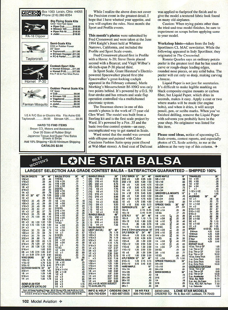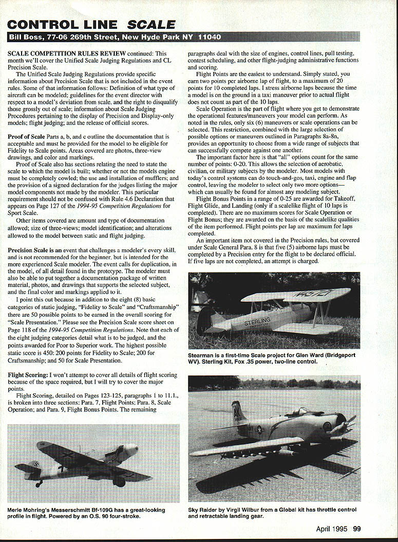 CONTROL LINE SCALE SCALE COMPETITION RULES REVIEW continued month well cover Unified Scale Judging Regulations CL Precision Scale Unified Scale Judging Regulations provide specific information about Precision Scale included event rules Some information follows Definition what type aircraft can modeled guidelines event director respect models deviation scale right disqualify grossly out scale information about Scale Judging Procedures pertaining display Precision Display-only models flight judging release official scores Proof Scale Parts b c outline documentation acceptable must provided model eligible Fidelity Scale points Areas covered photos three-view drawings color markings Proof Scale also has sections relating need state scale model built whether models engine must completely cowled use installation mufflers provision signed declaration judges listing major model components made modeler particular requirement should confused Rule 46 Declaration appears Page 127 1994-95 Competition Regulations Sport Scale Other items covered amount type documentation allowed size three-views model identification alterations allowed model between static flight judging Precision Scale event challenges modelers skill recommended beginner intended experienced Scale modeler event calls duplication model detail found prototype modeler must also able put together documentation package written material photos drawings supports selected subject final color markings applied point out because addition eight 8 basic categories static judging Fidelity Scale Craftsmanship 50 possible points earned overall scoring Scale Presentation Please see Precision Scale score sheet Page 118 1994-95 Competition Regulations Note eight judging categories detail what judged points awarded Poor Superior work highest possible static score 450 200 points Fidelity Scale 200 Craftsmanship 50 Scale Presentation Flight Scoring wont attempt cover details flight scoring because space required will try cover major points Flight Scoring detailed Pages 123-125 paragraphs ito 111 broken three sections Para 7 Flight Points Para 8 Scale Operation Para 9 Flight Bonus Points remaining paragraphs deal size engines control lines pull testing contest scheduling other flight-judging administrative functions scoring Flight Points easiest understand Simply stated earn two points per airborne lap flight maximum 20 points 10 completed laps stress airborne laps because time model ground taxi maneuver prior actual flight does count part 10 laps Scale Operation part flight get demonstrate operational features/maneuvers model can perform As noted rules six 6 maneuvers scale operations can selected restriction combined large selection possible options maneuvers outlined Paragraphs 8a-8n provides opportunity choose wide range subjects can successfully compete against another important factor options count same number points 0-20 allows selection aerobatic civilian military subjects modeler Most models todays control systems can touch-and-gos taxi engine flap control leaving modeler select two options can usually found almost modeling subject Right Bonus Points range 0-25 awarded Takeoff Flight Glide Landing scalelike flight 10 laps completed no maximum scores Scale Operation Flight Bonus awarded basis scalelike qualities item performed Flight points per lap maximum laps completed An important item covered Precision rules covered under Scale General Para 8 five 5 airborne laps must completed Precision entry flight declared official five laps completed attempt charged April 1995 99 Stearman first-time Scale project Glen Ward Bridgeport WV Sterling Kit Fox 35 power two-line control Merle Mohrings Messerschmitt Bf-109G has great-looking profile flight Powered OS 90 four-stroke Sky Raider Virgil Wilbur Global kit has throttle control retractable landing gear Box 1063 Lorain Ohio 44055 MICRO - 216 282-8354 Big Flying Scale Kits Over Two Foot Span -* Piper Cub$1895 -*Stinson 125$1895 * Piper PA-it$1895 * Jodel$1895 16 Clipper Semi-Scale Kits 002 Rubber Power 22 Span Stinson Voyager $i195 * Taylorcrsft$1195 Taylororaft Contest-Sport * Hornet Embryo .$1195 * Hornet P-30$1795 Fits P-30 & Pee Wee Rules Outdoor Peanut Scale Kits 13 Span * Cub$995 *Vgabond$9 * Stinson 125$995 Farman Mbsquito *JCdQI$995 Fike$1095 1/2 RIG Gas Electric Kits Fits Astro 035 Taylorcraft3995 Stinson 1253995 HARD TO FIND ITEMS Brown 002 Motors Accessories Over 20 Sizes Rubber Strip Japanese Tissue Super Fine Balsa Sheets & Strips Add 10% Shipping Minimum Shipping CATALOG $200 realize above does cover Precision event greatest detail hope have whetted appetite will explore rules Next month Sport Profile events months photos submitted Fred Cronenwett taken June 1994 Knights Joust held Whittier Narrows California included Profile Sport Scale events Fred Cronenwett placed first Profile Havoc A-20 Steve Davis placed second Bearcat Virgil Wilburs 40-inch-span P-38 placed third Sport Scale Grant Hiestands Electricpowered Spacewalker placed first Spacewalker s great-looking cockpit appeared February column Merle Morhings Messerschmitt Bf-109G two points behind Its powered OS 90 four-stroke has retracts scale flap operation controlled via multichannel electronic system Stearman shown months photos work 17-year-old Glen Ward model built Sterling kit first scale project Ward Its powered Fox 35 basic two-line control systeman easy uncomplicated way get started Scale Ward noted model covered silkspan painted Color Creations Fashion Satin spray paint found Wal-Mart stores final coat Dullcoat applied fuelproof finish give model textured fabric look found old airplanes Caution trying paints other tried-and-true model finishes sure experiment scraps before applying same model Workshop hintstaken Indy Sportliners CL MAC newsletter following appeared Indy Sportliner originated Crosswind Ronnie Quarles says ordinary potato peeler greatest tool has used carve rough-shape leading edges rounded nose pieces solid balsa 