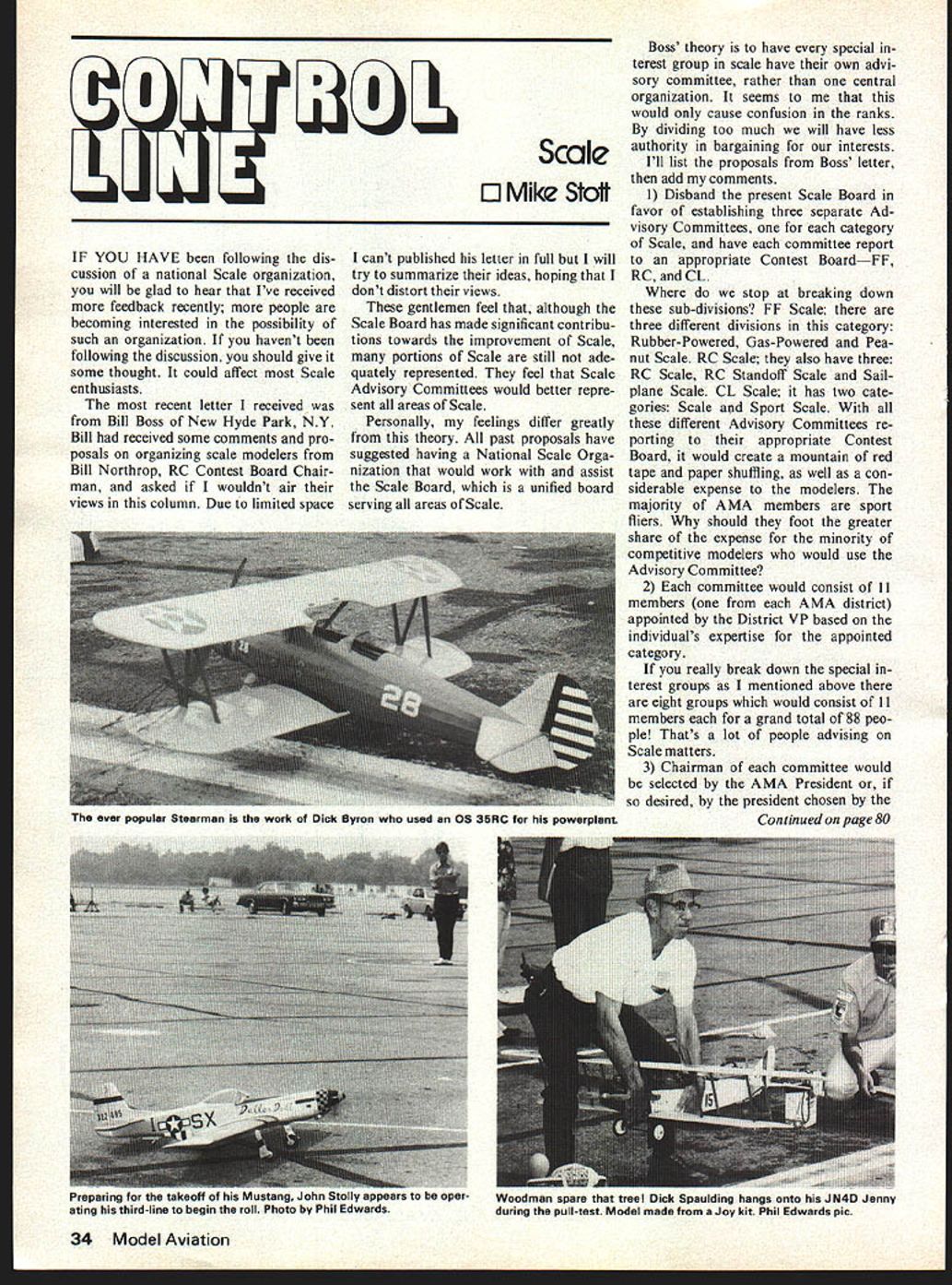 I Scale El Mike Stott IF YOU HAVE following dis cussion national Scale organization will glad hear Ive received feedback recently people becoming interested possibility such organization havent following discussion should give some thought could affect Scale enthusiasts recent letter received Bill Boss New Hyde Park NY Bill received some comments pro posals organizing scale modelers Bill Northrop RC Contest Board Chair man asked wouldnt air views column Due limited space cant published letter full will try summarize ideas hoping dont distort views gentlemen feel although Scale Board has made significant contribu tions towards improvement Scale portions Scale still ade quately represented feel Scale Advisory Committees would better repre sent areas Scale Personally feelings differ greatly theory past proposals have suggested having National Scale Orga nization would work assist Scale Board unified board serving areas Scale Boss theory have special terest group scale have own advi sory committee rather central organization seems would cause confusion ranks dividing too much will have less authority bargaining interests Ill list proposals Boss letter add comments Disband present Scale Board favor establishing three separate Ad visory Committees category Scale have committee report appropriate Contest BoardFF RC CL stop breaking down sub-divisions FF Scale three different divisions category Rubber-Powered Gas-Powered Pea nut Scale RC Scale also have three RC Scale RC Standoff Scale Sail plane Scale CL Scale has two cate gories Scale Sport Scale different Advisory Committees re porting appropriate Contest Board would create mountain red tape paper shuffling well con siderable expense modelers majority AMA members sport fliers should foot greater share expense minority competitive modelers would use Advisory Committee 2 committee would consist 11 members AMA district appointed District VP based individuals expertise appointed category really break down special terest groups mentioned above eight groups would consist 11 members grand total 88 peo ple Thats lot people advising Scale matters 3 Chairman committee would selected AMA President desired president chosen Continuedonpage8O 34 Model Aviation ever popular Stearman work Dick Byron used OS 35RC powerplant Preparing takeoff Mustang John StiWoodman spare tree Dick opaulding hangs onto nis Iru denny ating third-line begin roll Photo Phif Edwardsduring pull-test Model made Joy kit Phil Edwards pic FLYING ACE Thats what you come over SC Modeler know what takes conquer skies soar high maneuver gracefully know because weve ourselves Thats big differ ence nt just sell service dio control modelers ourselves johnny-come-late lys either expertise goes back pioneering days radio control Look us need flying ace want Replacement parts kits radios advice help husiasts enthusiasts Send $1 new helicopter catalog parts list CL ScalelStott continued page 34 appropriate Contest Board Chairman 4 Each committee would consider rules changes affecting Scale category case Unified Rules changes affected categories would consider proposed rules 5 Voting committee rules changes would accordance cur rent Contest Board procedures 6 Results committees rules change considerations accepted appropriate Contest Board Chair man final unless committees find ings contrary rules compe tition category regarding safety con test administration 7 Each committee chairman would responsible final rules change wording updates rulebook above proposals deal action committees responsible Contest Board Chairman Board current Contest Board procedures doesnt seem would have gained anything Advisory Committees still puppet string 8 AMA would expected provide mailing services committee part contest boards activities Again would cost modelers wouldnt using Advisory Com mittees services Boss closing remarks ask question talk really want change Yes need change feel change should form special scale group would assist present scale board organization would work independent AMA SC MODELER HOBBY SHOP Helis Planes Cars Boats Radios Parts RC Hobbyists 1999 Larkin Avenue Elgin Illinois 60120 Dept 128312-697-3737 keep district representatives aware feelings isnt just talk feel have ways go will hap pen overnight need cooperation everyone interested Scale Bill Boss asking comments proposals write him let him know feel Bill Boss 77-06 269th St New Hyde Park NY 11040 Mike F Stoti 118 E Wheeler N Man kato MN 65001 CL Combat/Johnson continued page 35 appropriate size around 7mm case X- 15 Dremel works well shap ing venturi Dont forget grind passage fuel get spray bar venturi engines like Fox might coat inside regular venturi crank make sure port isnt open mold release thin coat grease after epoxy sets youll have removable venturi ready shaping aid removal epoxy might try molding piece string give something pull case gets stub born using suction want maximum size venturi possible mak ing lot power retain decent mix ture control might try next idea Find some brass copper tubing little bigger spray bar Drill grind hole tubing just large enough spray bar fit through piece tubing will located inside regular venturi over outlet jet spray bar Secure epoxy solder top tube should w edge primary venturi extend about below spray bar What happens air enters main venturi starts flow downward air enters secondary venturi pro zeeds normal until reaches spray bar really restricts flow alternative air has speed up order join its friends crank port thus creating low pressure area lot suction would have found larger venturi restriction effect youll able run much bigger primary venturi still have reasonable fuel draw easy settings advantages normal short intake stack combat motor arent nearly great rear intake motor because takes quite distance establish air flow through venturi fastest way seal foam use lowheat plastic like Solarfilm Flite Coat etc Time-wise will cost about 30 minutes per plane pocketbook $3-400 weight penalty 1