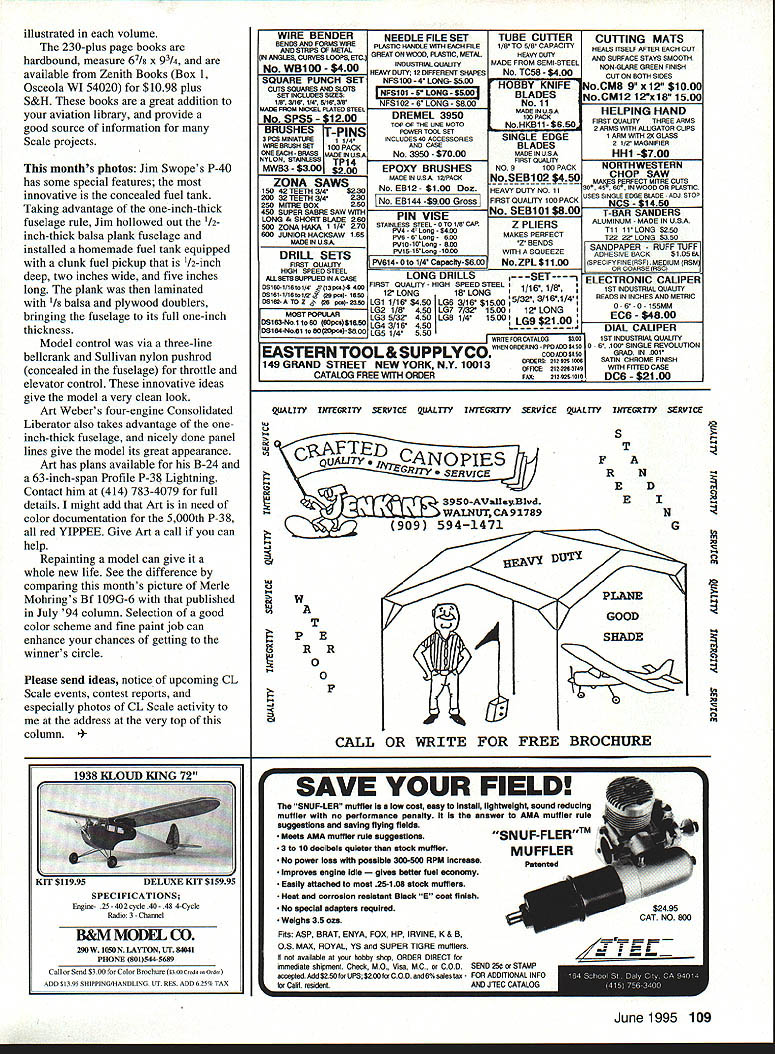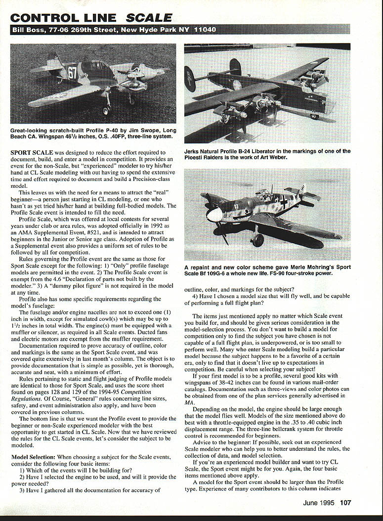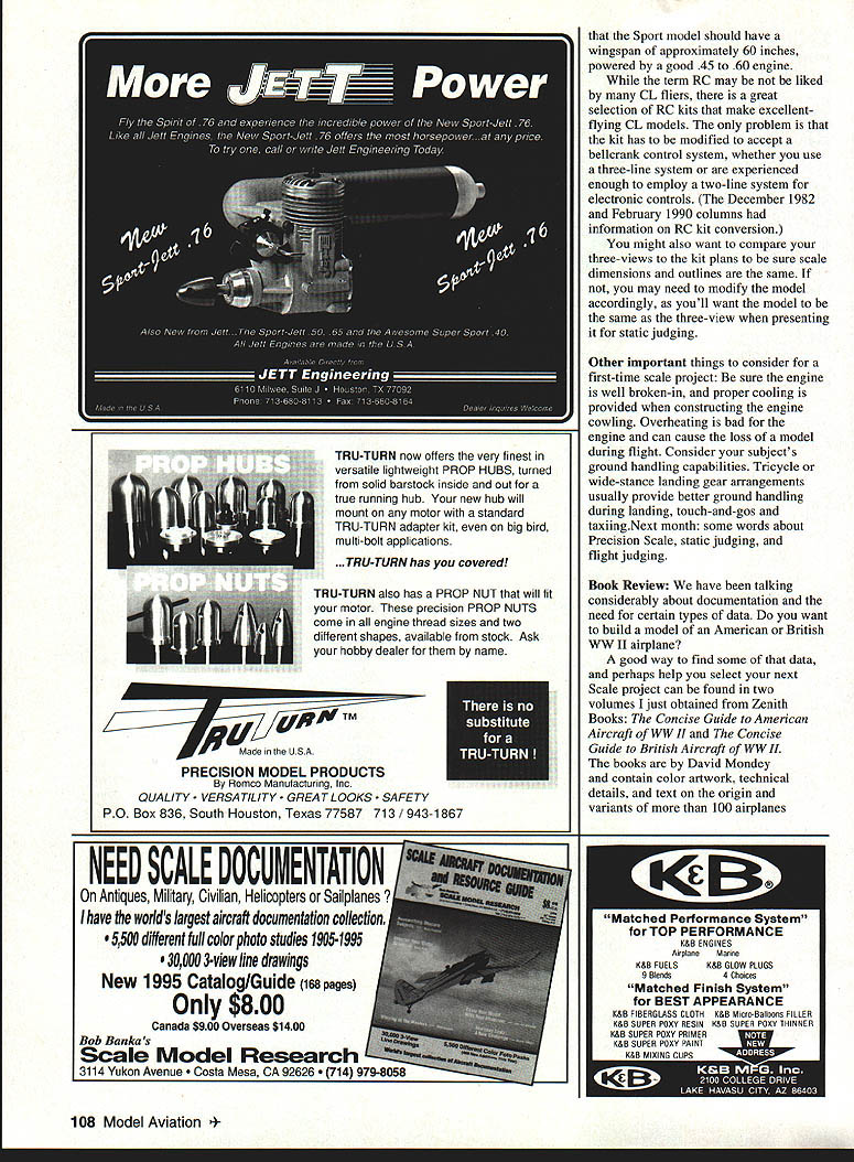 CONTROL LINE SCALE SPORT SCALE designed reduce effort required document build enter model competition provides event non-Scale experienced modeler try his/her hand CL Scale modeling out having spend extensive time effort required document build Precision-class model leaves us need means attract real beginnera person just starting CL modeling hasnt yet tried his/her hand building full-bodied models Profile Scale event intended fill need Profile Scale offered local contests several years under club area rules adopted officially 1992 AMA Supplemental Event #521 intended attract beginners Junior Senior age class Adoption Profile Supplemental event also provides uniform set rules followed competition Rules governing Profile event same Sport Scale except following 1 Only profile fuselage models permitted event 2 Profile Scale event exempt 46 Declaration parts built modeler 3 dummy pilot figure required model time Profile also has some specific requirements regarding models fuselage fuselage and/or engine nacelles exceed 1 inch width except simulated cowls may up 11/2 inches total width engines must equipped muffler silencer required Scale events Ducted fans electric motors exempt muffler requirement Documentation required prove accuracy outline color markings same Sport Scale event covered quite extensively last months column object provide documentation simple possible yet thorough accurate neat minimum effort Rules pertaining static flight judging Profile models identical Sport Scale uses score sheet found pages 128 129 1994-95 Competition Regulations Course General rules concerning line sizes safety event administration also apply have covered previous columns bottom line want Profile event provide beginner non-Scale experienced modeler best opportunity get started CL Scale Now have reviewed rules CL Scale events lets consider subject modeled Model Selection choosing subject Scale events consider following four basic items 1 Which events will building 2 Have selected engine used will provide power needed 3 Have gathered documentation accuracy outline color markings subject 4 Have chosen model size will fly well capable performing full flight plan items just mentioned apply no matter Scale event build should given serious consideration model-selection process dont want build model competition find subject have chosen capable full flight plan underpowered too small perform well enter Scale modeling build particular model because subject happens favorite certain era find doesnt live up expectations competition careful selecting subject first model profile several good kits wingspans 3 8-42 inches can found various mail-order catalogs Documentation such three-views color photos can obtained plan services generally advertised MA Depending model engine should large enough model flies well Models size mentioned above best throttle-equipped engine 35 40 cubic inch displacement range three-line bellcrank system throttle control recommended beginners Advice beginner possible seek out experienced Scale modeler can help better understand rules collection data model selection youre experienced model builder want try CL Scale Sport event might Again four basic items mentioned above apply model Sport event should larger Profile type Experience contributors column indicates June1995 107 Great-looking scratch-built Profile P-40 Jim Swope Long Beach CA Wingspan 4612 inches OS 4OFP three-line system Jerks Natural Profile B-24 Liberator markings Ploesti Raiders work Art Weber repaint new color scheme gave Merle Mohrings Sport Scale Bf 109G-6 whole new life FS-90 four-stroke power TRU-TURN now otters very finest versatile lightweight PROP HUBS turned tram solid barstock inside out true running hub new hub will mount motor standard TRU-TURN adapter kit big bird multi-bolt applications TRU-TURN has covered TRU-TURN also has PROP NUT will fit motor precision PROP NUTS come engine thread sizes two different shapes available stock Ask hobby dealer name USA PRECISION MODEL PRODUCTS Romco Manufacturing Inc QUALITY- VERSATILITY GREAT LOOKS TY PO Box 836 South Houston Texas 77587 713 / 943-1867 NEED SCALE DOCUMENTATION Antiques Military Civilian Helicopters Sailplanes 7 have worlds largest aircraft documentation collection 5500 different full color photo studies 1905-1995 30000 3-view line drawings New 1995 Catalog/Guide 168 pages Only $800 Canada $900 Overseas $1400 Bob Bankss Scale Model Research 3114 Yukon Avenue a Mesa CA 92626 979that Sport model should have wingspan approximately 60 inches powered good 45 60 engine term RC may liked CL fliers great selection RC kits make excellentflying CL models problem kit has modified accept bellcrank control system whether use three-line system experienced enough employ two-line system electronic controls December 1982 February 1990 columns information RC kit conversion might also want compare three-views kit plans sure scale dimensions outlines same may need modify model accordingly youll want model same three-view presenting static judging Other important things consider first-time scale project sure engine well broken-in proper cooling provided constructing engine cowling Overheating bad engine can cause loss model during flight Consider subjects ground handling capabilities Tricycle wide-stance landing gear arrangements usually provide better ground handling during landing touch-and-gos taxiingNext month some words about Precision Scale static judging flight judging Book Review have talking considerably about documentation need certain types data want build model American British WW II airplane good way find some data perhaps help select next Scale project can found two volumes just obtained Zenith Books The Concise Guide American Aircraft WW II Concise Guide British Aircraft WW II books David Mondey contain color artwork technical details text origin variants 100 airptanes Matched Performance System TOP PERFORMANCE K&B ENGINES AirplaneMarine K&B FUELSK&B GLOW PLUGS 9 Blen