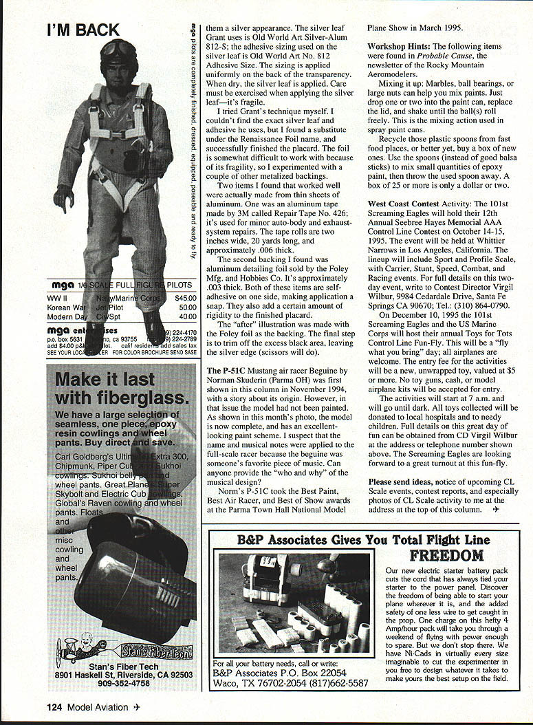 CONTROL LINE SCALE EfllE CONGRATULATIONS GO Bob Furr Omaha Nebraskas Orbiting Eagles July 1994 Bob honored membership AMAs Aero Honor Society newsletter editors Bob honored because newsletter edits quality product very enjoyable reading Bob twelfth year editor Orbiting Eagles newsletter AprillMay 1995 installment 100th issue Academy has inducted fewer 60 newsletter editors Aero Honor Society Bob onlyfive control line newsletter editors honored Over years Bob has provided considerable amount material especially Workshop Hints column both through newsletter personal contributions Once again congratulations great control line modeler whos doing great job Various types placards nomenclature plates appear cockpits fullscale aircraft denote manufacturer provide warnings show instructions Some Scale models build require reproduction placards last months column showed Grant Heistand reproduces instrument facesbe draws faces black ink white background uses copy machine reverse colors reduce instruments correct size month well explore same method couple additional steps make metalize placards first step used make placards same used instruments make black-and-white drawing panels shown before illustration Make drawing several times larger size need model makes placards easier work will reduced proper size later lettering both example items set up using computer word processor printed laser printer drawing completed creating solid black border bars completed drawing taken local print shop copy machine can reverse drawing colors reduce drawing proper size model Unlike instrument faces reversed-and-reduced copy printed transparency material thats normally used overhead projection purposes next step give transparency metalized look Grant applies silver leaf back transparency front placard leaf shows through transparent lettering bars giving EXPERIMENTAL AMATUER BUILT AIRCRAFT MAKE SERIAL NOEMPTY wT DATE OF MFOMAX WT ENGINEI-IF BUILT BY NAME ADDRESS CITY & STATE BEFORE before black-on-white panels computer-generated reversed-and-reduced after panels printed text originals modified local print shop transparent plastic silver leaf applied back November1995 123 Norman Skuderins P-51C Mustang Cleveland air racer Excellent finish dark green yellow markings Mike Weishans Profile Laird Turner LRT 14 powered Royal 40 controlled three-line system PASSENGER WARNING THIS AIRCRAFT IS AMATUER BUILT AND DOES NOT COMPLY WITH THE FEDERAL SAFETY REGULATIONS FOR STANDARD AIRCRAFT silver appearance silver leaf Grant uses Old World Art Silver-Alum 812-S adhesive sizing used silver leaf Old World Art No 812 Adhesive Size sizing applied uniformly back transparency dry silver leaf applied Care must exercised applying silver leafits fragile tried Grants technique myself couldnt find exact silver leaf adhesive uses found substitute under Renaissance Foil name successfully finished placard foil somewhat difficult work because its fragility experimented couple other metalized backings Two items found worked well actually made thin sheets aluminum aluminum tape made 3M called Repair Tape No 426 its used minor auto-body exhaustsystem repairs tape rolls two inches wide 20 yards long approximately 006 thick second backing found aluminum detailing foil sold Foley Mfg Hobbies Co Its approximately 003 thick Both items selfadhesive side making application snap also add certain amount rigidity finished placard after illustration made Foley foil backing final step trim off excess black area leaving silver edge scissors will P-SiC Mustang air racer Beguine Norman Skuderin Parma OH first shown column November 1994 story about its origin However issue model painted As shown months photo model now complete has excellentlooking paint scheme suspect name musical notes applied full-scale racer because beguine someones favorite piece music Can anyone provide musical design Norms P-51C took Best Paint Best Air Racer Best Show awards Parma Town Hall National Model Plane Show March 1995 Workshop Hints following items found Probable Cause newsletter Rocky Mountain Aeromodelers Mixing up Marbles ball bearings large nuts can help mix paints Just drop two paint can replace lid shake until balls roll freely mixing action used spray paint cans Recycle plastic spoons fast food places better yet buy box new ones Use spoons instead good balsa sticks mix small quantities epoxy paint throw used spoon away box 25 dollar two West Coast Contest Activity 101st Screaming Eagles will hold 12th Annual Seebree Hayes Memorial AAA Control Line Contest October 14-15 1995 event will held Whittier Narrows Los Angeles California lineup will include Sport Profile Scale Carrier Stunt Speed Combat Racing events full details twoday event write Contest Director Virgil Wilbur 9984 Cedardale Drive Santa Fe Springs CA 90670 Tel 310 864-0790 December 10 1995 101st Screaming Eagles US Marine Corps will host annual Toys Tots Control Line Fun-Fly will fly what bring day airplanes welcome entry fee activities will new unwrapped toy valued $5 No toy guns cash model airplane kits will accepted entry activities will start 7 am will go until dark toys collected will donated local hospitals needy children Full details great day fun can obtained CD Virgil Wilbur address telephone number shown above Screaming Eagles looking forward great turnout fun-fly Please send ideas notice upcoming CL Scale events contest reports especially photos CL Scale activity address top column Associates Gives Total Flight Line FREEDOM new electnc starter battery pack cuts cord has always tied starter power panel Discover freedom being able start plane wherever added safety less wire get caught prop charge hefty 4 Amp/hour pack will take through weekend flying power enough spare dont stop have Ni-Cads virtually size imaginable cut experimenter free design whatever takes make yours best setup field battery needs call write B&P Associates PO Box 22054 Waco TX 76702-2054 817662-5587 124 Model Aviation