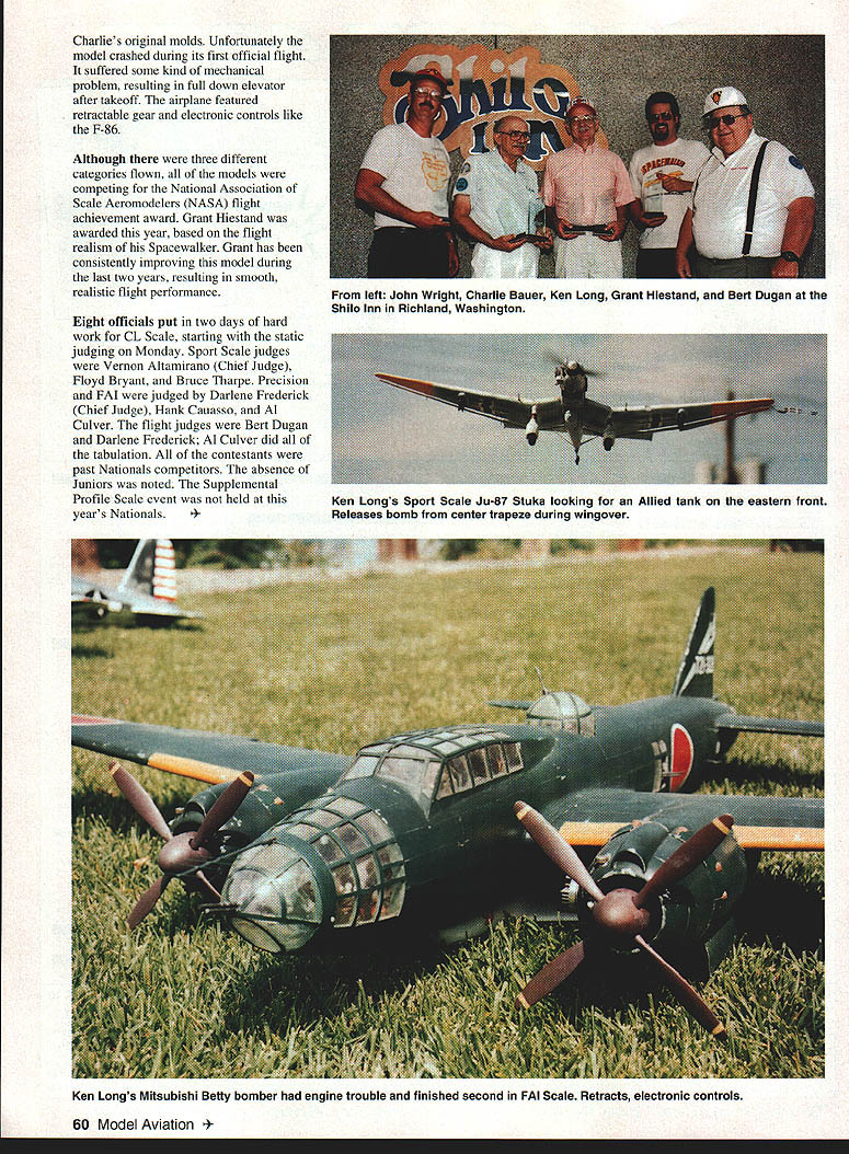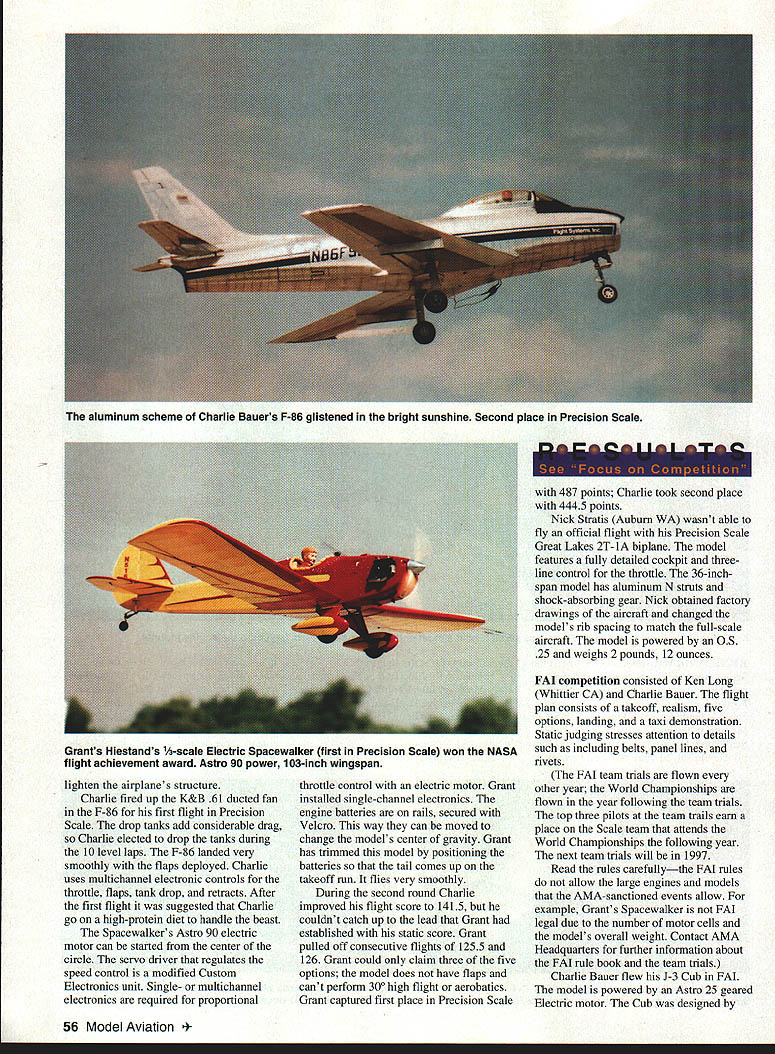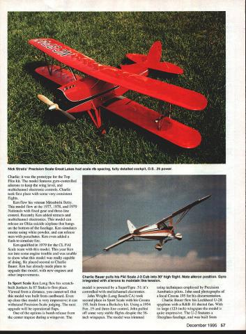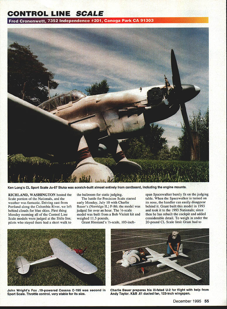 CONTROL LINE SCALE RICHLAND WASHINGTON hosted Scale portion Nationals weather fantastic Driving east Portland along Columbia River left behind clouds blue skies First thing Monday morning Control Line Scale models judged Shilo Inn pilots stayed short walk ballroom static judging battle Precision Scale started early Monday July 10 Charlie Bauers Norridge IL F-86 model judged over hour /s-scale model built Bob Violett kit weighed 115 pounds Grant Hiestands A-scale 103-inchspan Spacewalker barely fit judging table Spacewalker turned its nose handler can easily disappear behind Grant built model 1993 took 1993 Nationals since has rebuilt cockpit added considerable detail weigh under 20-pound CL Scale limit Grant December 1995 55 Ken Langs CL Sport Scale Ju-87 Stuka scratch-built almost entirely cardboard Including engine mounts John Wrights Fox 19-powered Cessna C-195 second Charlie Bauer prepares ill-fated U-2 flight help Sport Scale Throttle control very stable its size Andy Tayior K&B 61 ducted fan 123-inch wingspan lighten airplanes structure Charlie fired up K&B 61 ducted fan F-86 first flight Precision Scale drop tanks add considerable drag Charlie elected drop tanks during 10 level laps F-86 landed very smoothly flaps deployed Charlie uses multichannel electronic controls throttle flaps tank drop retracts After first flight suggested Charlie go high-protein diet handle beast Spacewalker s Astro 90 electric motor can started center circle servo driver regulates speed control modified Custom Electronics unit Single- multichannel electronics required proportional throttle control electric motor Grant installed single-channel electronics engine batteries rails secured Velcro way can moved change models center gravity Grant has trimmed model positioning batteries tail comes up takeoff run flies very smoothly During second round Charlie improved flight score 1415 couldnt catch up lead Grant established static score Grant pulled off consecutive flights 1255 126 Grant could claim three five options model does have flaps cant perform 300 high flight aerobatics Grant captured first place Precision Scale 487 points Charlie took second place 4445 points Nick Stratis Auburn WA wasnt able fly official flight Precision Scale Great Lakes 2T- 1 biplane model features fully detailed cockpit threeline control throttle 36-inchspan model has aluminum N struts shock-absorbing gear Nick obtained factory drawings aircraft changed models rib spacing match full-scale aircraft model powered OS 25 weighs 2 pounds 12 ounces FAI competition consisted Ken Long Whittier CA Charlie Bauer flight plan consists takeoff realism five options landing taxi demonstration Static judging stresses attention details such including belts panel lines rivets FAI team trials flown other year World Championships flown year following team trials top three pilots team trails earn place Scale team attends World Championships following year next team trials will 1997 Read rules carefullythe FAI rules allow large engines models AMA-sanctioned events allow example Grants Spacewalker FAI legal due number motor cells models overall weight Contact AMA Headquarters further information about FAI rule book team trials Charlie Bauer flew J-3 Cub FAT model powered Astro 25 geared Electric motor Cub designed 56 Model Aviation 4The aluminum scheme Charlie Bauers F-86 glistened bright sunshine Second place Precision Scale Grants Hiestands -scale Electric Spacewalker first Precision Scale won NASA flight achievement award Astro 90 power 103-inch wingspan Charlie prototype Top Flite kit model features gyro-controlled ailerons keep wing level multichannel electronic controls Charlie took first place some very consistent flights Ken flew veteran Mitsubishi Betty model flew 1977 1978 1979 Nationals fixed gear three-line control Recently Ken added retracts multichannel electronics model can release Ohka suicide airplane hangs bottom fuselage Ken simulates smoke using white powder can release men parachutes Ken added flash simulate fire Ken qualified 1979 CL FAJ Scale team model year Ken ran some engine trouble unable show what model really capable doing placed second Charlie Bauer Ken has already made plans upgrade model new engines other improvements Sport Scale Ken Long flew scratchbuilt Junkers Ju 87 Stuka first place Viewed distance cannot tell model built cardboard up close model very impressive can withstand Precision Scale judging next upgrade will operational flaps options bomb release center trapeze during wingover model powered SuperTigre 51 its controlled multichannel electronics John Wright Long Beach CA took second place Sport Scale Cessna 195 built Berkeley kit Using 1954 Fox 19 three-line control John pulled off some very stable flights despite 36inch wingspan model trimmed using techniques employed Precision Aerobatics pilots John used photographs local Cessna 195 documentation Charlie Bauer flew Lockheed U-2R spyplane K&B 61 ducted fan its large 123-inch wingspan model quite impressive U-2 features fiberglass fuselage built December 1995 57 Nick Stratis Precision Scale Great Lakes scale rib spacing fully detailed cockpit 0S 25 power Charlie Bauer pulls FAI Scale J-3 Cub 300 high flight Note aileron position Gyro integrated ailerons maintain line tension Charlies original molds Unfortunately model crashed during its first official flight suffered some kind mechanical problem resulting full down elevator after takeoff airplane featured retractable gear electronic controls like F-86 Although three different categories flown models competing National Association Scale Aeromodelers NASA flight achievement award Grant Hiestand awarded year based flight realism Spacewalker Grant has consistently improving model during last two years resulting smooth realistic flight performance Eight officials put two days hard work CL Scale starting static judging Monday Sport Scale judges Vernon Altamirano Chief Judge Floyd Bryant Bruce Tharpe Precision FAI jud