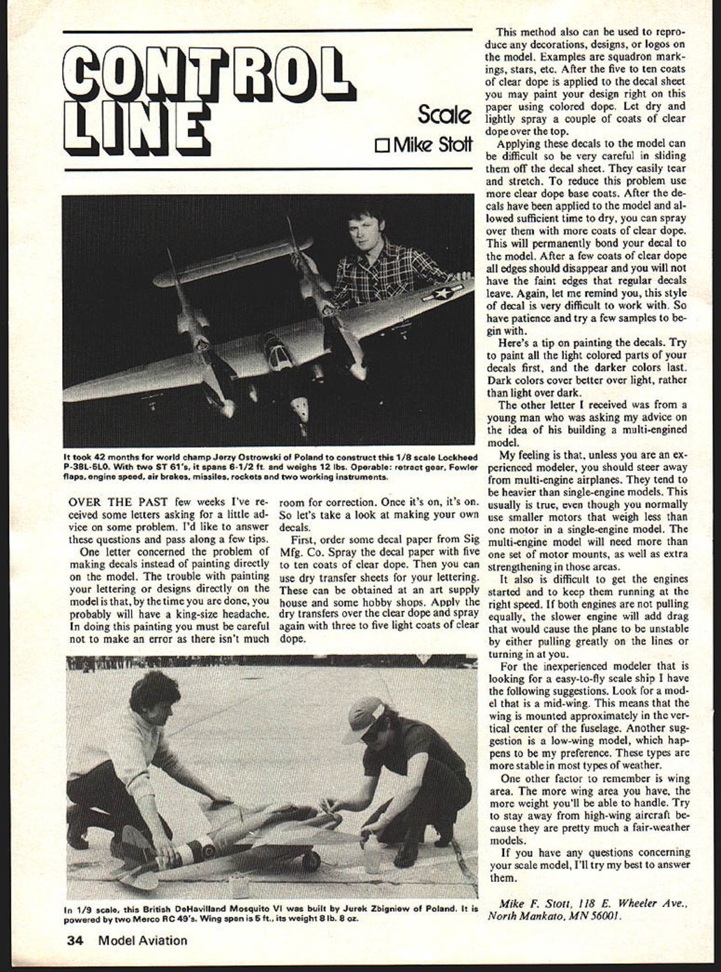 IciI Scale C Mike Stoti OVER THE PAST few weeks Ive re ceived some letters asking little ad vice some problem Id like answer questions pass along few tips letter concerned problem making decals instead painting directly model trouble painting lettering designs directly model time done probably will have king-size headache doing painting must careful make error isnt much room correction Once its its So lets take look making own decals First order some decal paper Sig Mfg Co Spray decal paper five ten coats clear dope can use dry transfer sheets lettering can obtained art supply house some hobby shops Apply dry transfers over clear dope spray again three five light coats clear dope method also can used repro duce decorations designs logos model Examples squadron mark ings stars etc After five ten coats clear dope applied decal sheet may paint design right paper using colored dope Let dry lightly spray couple coats clear dope over top Applying decals model can difficult very careful sliding off decal sheet easily tear stretch reduce problem use clear dope base coats After de cals have applied model al lowed sufficient time dry can spray over coats clear dope will permanently bond decal model After few coats clear dope edges should disappear will have faint edges regular decals leave Again let remind style decal very difficult work So have patience try few samples gin Heres tip painting decals Try paint light colored parts decals first darker colors last Dark colors cover better over light rather light over dark other letter received young man asking advice idea building multi-engined model feeling unless ex perienced modeler should steer away multi-engine airplanes tend heavier single-engine models usually true though normally use smaller motors weigh less motor single-engine model multi-engine model will need set motor mounts well extra strengthening areas also difficult get engines started keep running right speed both engines pulling equally slower engine will add drag would cause plane unstable either pulling greatly lines turning inexperienced modeler looking easy-to-fly scale ship have following suggestions Look mod el mid-wing means wing mounted approximately ver tical center fuselage Another sug gestion low-wing model hap pens preference types stable types weather other factor remember wing area wing area have weight youll able handle Try stay away high-wing aircraft cause pretty much fair-weather models have questions concerning scale model Ill try best answer 1/9 scale British DeHavilland Mosquito VI built Jurek Zbigniew Poland Mike F Stott 118 F Wheeler Ave powered two Marco RC 49s Wing span 5 ft its weight 8 lb 8 oz North Mankato MN 56001 34 Model Aviation took 4Z months tor world champ Jerzy Ostrowski Poland construct 1/8 scale Lockheed P-38L-5L0 two ST 61s spans 6-1/2 ft weighs 12 lbs Operable retract gear Fowler flaps engine speed air brakes missiles rockets two working instruments