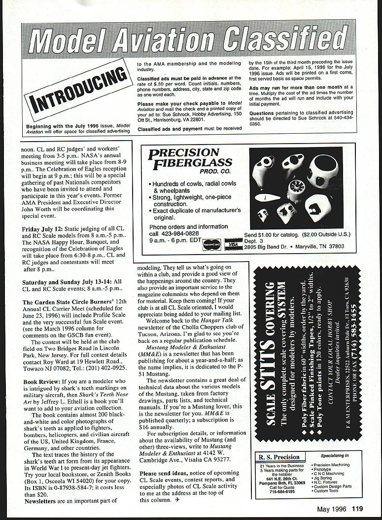 CONTROL LINE SCALE CONTROL SYSTEMSespecially three-line handles have talked about great length However appears have ignored perhaps thought too much about very important factor make adjustments compensate uneven flying lines model leadouts Most us best make flying lines same length make belicrank leadouts specific lengths required three-line belicrank handle using However seems no matter hard try exact can always count line leadout being off just bit want lines exact throttle control works well have good neutral elevator position Its very disconcerting have keep little up down control model keep level flight comfortable feeling handle makes better flight youre flying Scale electronics two-line handle such E-Z Just compensating uneven lines rather simple An adjustment handles leadout-attachment wire up down side handle solves problem However three-line handle has no such adjustment Rather use uneven-size line clips compensate uneven lines accompanying sketch shows adjusting device used George Lieb member Orbiting Eagles Omaha compensates uneven lines fine-tunes models elevator neutral position device added handles upper line made materials found workshops sketch shows handles up leadout shortened accommodate device would suggest first try device handle adding extra line clips piece steel strap length adjusting device lower line trial Care should exercised grinding flat end screw drilling hole line clip sure hole drilled center flattened area screw sketch shows two-inch-long bolt 1 /2- 1-inch bolt would probably provide adjustment needed Once device place adjustment simple Loosen wing nut turn screw out retighten wing nut Contest Activity Indy Sportliners Muncie Controliners cosponsoring Midwest Regional Control Line contest International Aeromodeling Center Muncie Indiana June 1-2 UNE CLIP WING NUTHEX NUT8-32 x r STEEL BOLT END GROUND FLAT1 iie x 315 WIDE hEEL STRAP HOLE DRILLED THRU3-UNE CONTROL HANDLE EVEN DRAWING NOT TO SCALE line-adjustment device helps solve problem adjust uneven lines leadouts three-line system Text details construction 1996 warmup years Muncie Nationals Events meet will include Stunt Speed Scale Racing Combat Carrier will good opportunity check out Muncie site prior Nationals full details contest get touch George Kite 317 637-1493 Also found Indy Sportliner newsletter following information about events scheduled connection CL RC Scale events Nationals courtesy John Guenther Scale Category Manager will take place Radisson Hotel Roberts Muncie Monday July 8 CL RC flight judge contestant meeting 8 pm CL Profile RC Fun Team Scale events events will flown Tuesday July 9 8 am-5 pm. Wednesday July 10 National Association Scale Aeromodelers NASA seminars 9 am-noon 130-330 pm. Thursday July 11 NASA US FAI Scale seminar 9 am 118 Model Aviation Burns highly detailed Vultee BT-13 originally built Stunt has also successful Profile Scale entry Ron Burns Vultee features homemade muffler system under cowling allows engine exhaust scale location Beginning July 1996 issue Model Aviation will offer space tor classified advertising AMA membership modeling industry Classified ads must paid advance rate $50 per word Count initials numbers phone numbers address city state zip code word Please make check payable Model Aviation mail check printed copy ad Sue Schrock Hobby Advertising 150 Ott St Harrisonburg VA 22801 Classified ads payment must received 15th third month preceding issue date example April 15 1996 July 1996 issue Ads will printed first come first served basis space permits Ads may run month time Multiply cost ad times number months ad will run include initial payment Questions pertaining classified advertising should directed Sue Schrock 540-4340350 noon CL RC judges workers meeting 3-5 pm. NASAs annual business meeting will take place 8-9 pm. Celebration Eagles reception will begin 9 pm will special gathering past Nationals competitors have invited attend participate years events Former AMA President Executive Director John Worth will coordinating special event Friday July 12 Static judging CL RC Scale models 8 am-5 pm. NASA Happy Hour Banquet recognition Celebration Eagles will take place 630-8 pm. CL RC judges contestants will meet after 8 pm. Saturday Sunday July 13-14 CL RC Scale events 8 am-S pm. Garden State Circle Burners 12th Annual CL Carrier Meet scheduled June 23 1996 will include Profile Scale very successful fun Scale event see March 1996 column comments GSCB fun event contest will held club field Two Bridges Road Lincoln Park New Jersey full contest details contact Roy Ward 19 Hewlett Road Towaco NJ 07082 Tel 201 402-0925 Book Review modeler intrigued sharks teeth markings military aircraft Sharks Teeth Nose Art Jeffrey L Ethell book youll want add aviation collection book contains almost 200 blackand-white color photographs sharks teeth applied fighters bombers helicopters civilian aircraft US United Kingdom France Germany other countries text traces history sharks teeth art form its appearance World War Ito present-day jet fighters Try local bookstore Zenith Books Box 1 Osceola WI 54020 copy Its ISBN 0-87938-584-7 costs less $20 Newsletters important part modeling tell us whats going within club provide good view happenings around country also provide important service magazine columnists depend material Keep coming club CL Scale oriented would appreciate being added mailing list Welcome back Hangar Talk newsletter Cholla Choppers club Tucson Arizona Im glad see youre back regular publication schedule Mustang Modeler & Enthusiast MM&E newsletter has publishing about year-and-a-half name implies dedicated P 51 Mustang newsletter contains great deal technical data about various models Mustang taken factory drawings parts lists technical manuals youre Mustang lover newsletter MM&E published quarterly subscription $16 annually subscription details information about availability Mustang other three-views write Mustang Modeler & Enthusiast 4142 W Cambridge Ave Visa