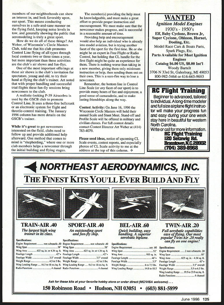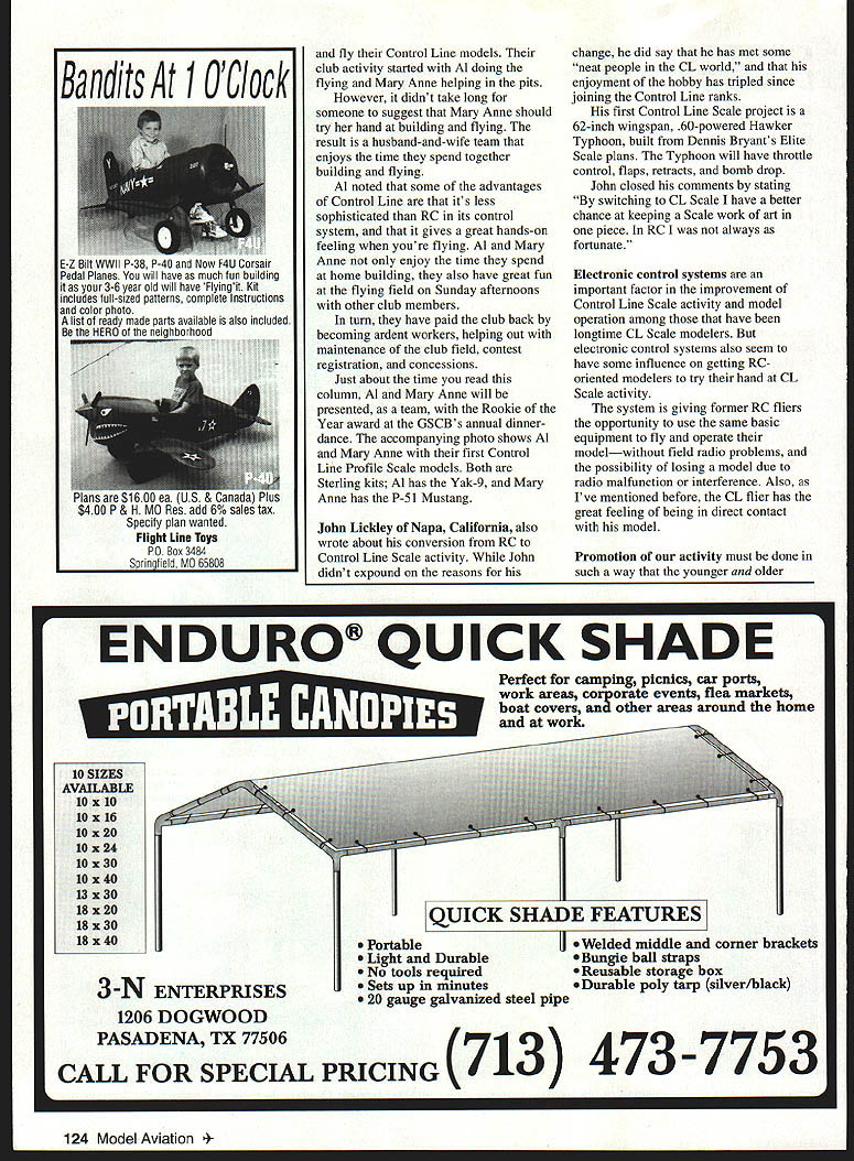 CONTROL LINE SCALE THE NEWCOMER Just what newcomer suppose can defined ways comes model aviation Descriptions might include entirely new sport returns sport after years absence has sport some time now trying different phase activity order get feel what category newcomer CL Scale might placed requested information several clubs newsletter editors individuals around country Most responses received included information have changed Radio Control CL Scale impact electronic controls comments promoting sport hope obtaining newcomers Through Fred Cronenwett West Coast columns constant contributors heard about Los Angeles Howard Lazerson Freds correspondence Howard led following fly RC power gliders always wanted give Control Line flying try wondered what like have model direct control Howard wrote started Control Line venture building 15-size model after several crashes prop changes made some successful flights noted liked CL flying wasnt satisfied modelit looked vaguely like airplane just went around around until fuel ran out read article Brodak s catalog Fred Cronenwett Merle Morhing electronic control systems short time Profile Wildcat powered OS 20 throttle control via electronic system Since first successful CL model has built Profile P-47 super Profile SBD Dauntless Dauntless has 43-inch span multichannel electronic system control throttle dive brakes flaps retracts bomb drop hook drop also has aileron control lowspeed flight bottom line Howard having great fun has no frequency problems long waits get flight Two main things Howard likes about Control Line can feel model flying can see models operations applies controls also noted like Control Line fliers never visually aware lines flying models sounds like have solid convert Control Line Scale ranks Rookies Year During September 1995 Garden State Circle Burners GSCB All-Scale Meet met couple new Control Line modeling Scale particular Al Mary Anne Knight Bloomfield New Jersey Al another modeler tried hand RC became discouraged after several crashes inability get good flight instrnction also discouraged high cost RC airplanes equipment club membership came upon GSCB club asked about Control Line flying short time wife Mary Anne became members GSCB club members offered help encouragement couple needed build June1996 123 CL Scale newcomers Al Mary Anne Knight voted Garden State Circle Burners Rookies Year CL convert Howard Lazerson poses Profile P-47 model features electronic throttle control Cronenwett photo John Lickley beginnings Hawker Typhoon RC flier Howard Lazerson trying hand CL Scale model will feature multichannel electronic system variety Profile models Cronenwett photo fly Control Line models club activity started Al doing flying Mary Anne helping pits However didnt take long someone suggest Mary Anne should try hand building flying result husband-and-wife team enjoys time spend together building flying Al noted some advantages Control Line its less sophisticated RC its control system gives great hands-on feeling youre flying Al Mary Anne enjoy time spend home building also have great fun flying field Sunday afternoons other club members turn have paid club back becoming ardent workers helping out maintenance club field contest registration concessions Just about time read column Al Mary Anne will presented team Rookie Year award GSCB nual dinnerdance accompanying photo shows Al Mary Anne first Control Line Profile Scale models Both Sterling kits Al has Yak-9 Mary Anne has P-5 1 Mustang John Lickley Napa California also wrote about conversion RC Control Line Scale activity John didnt expound reasons change did say has met some neat people CL world enjoyment hobby has tripled since joining Control Line ranks first Control Line Scale project 62-inch wingspan 60-powered Hawker Typhoon built Dennis Bryants Elite Scale plans Typhoon will have throttle control flaps retracts bomb drop John closed comments stating switching CL Scale have better chance keeping Scale work art piece RC always fortunate Electronic control systems important factor improvement Control Line Scale activity model operation among have longtime CL Scale modelers electronic control systems also seem have some influence getting RC oriented modelers try hand CL Scale activity system giving former RC fliers opportunity use same basic equipment fly operate modelwithout field radio problems possibility losing model due radio malfunction interference Also Ive mentioned before CL flier has great feeling being direct contact model Promotion activity must done such way younger older 124 Model Aviation its 1 OClock E-Z iit WVVII r-s I-4U ano NOW NU uorsair Pedal Planes will have much fun building 3-6 year old will have Flyingit Kit includes full-sized patterns complete Instructions color nhntr list o UU P & H b/o sales tax Specify plan wanted Flight Line Toys PO Box 3484 Springfield MO 65808 Perfect camping picnics car ports work areas coorate events flea markets boat covers other areas around home work ENDURO QUICK SHADE 10 SIZES AVAILABLE 10 x 10 10 x 16 10 x 20 lOx 24 10 x 30 10140 13 130 18 x 20 18 130 18140 3-N ENTERPRISES 1206 DOGWOOD PASADENA TX 77506 CALL FOR SPECIAL PRICING 713 4737753 QUICK SHADE FEATURES PortableII ed middle corner brackets ht Durable Bungie ball straps No tools required Reusable storage box Sets up minutes Durable poly tarp silver/black 20 gauge galvanized steel pipe members neighborhoods can show interest look favorably upon sport means conducting ourselves safe-and-sane manner flying field keeping noise levels tow generally showing public aeromodeling truly great sport things Art Weber Wisconsins Circle Masters Club told club promotes Control Line flying types through local contests two three times year important activities clubs air shows fun-flys important offerings air shows clubs invitation spectators young old try hand flying clubs trainer Art noted proper handling successful trial flights fun-fly sessions bring newcomers club realistic-loo