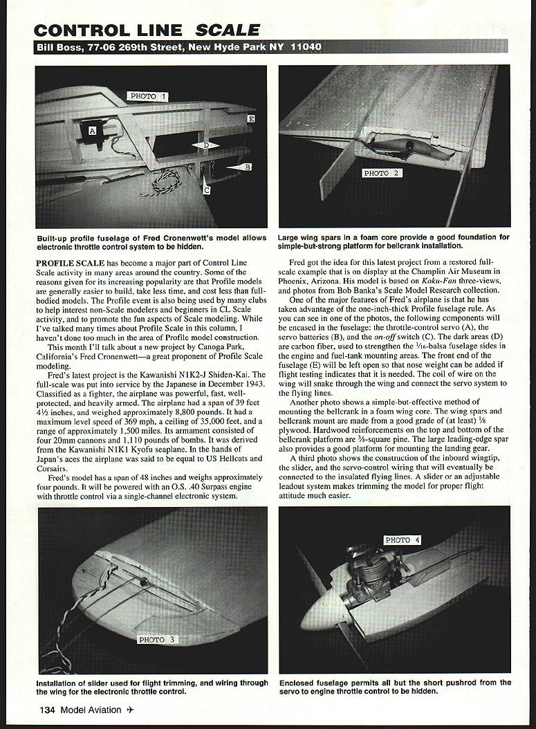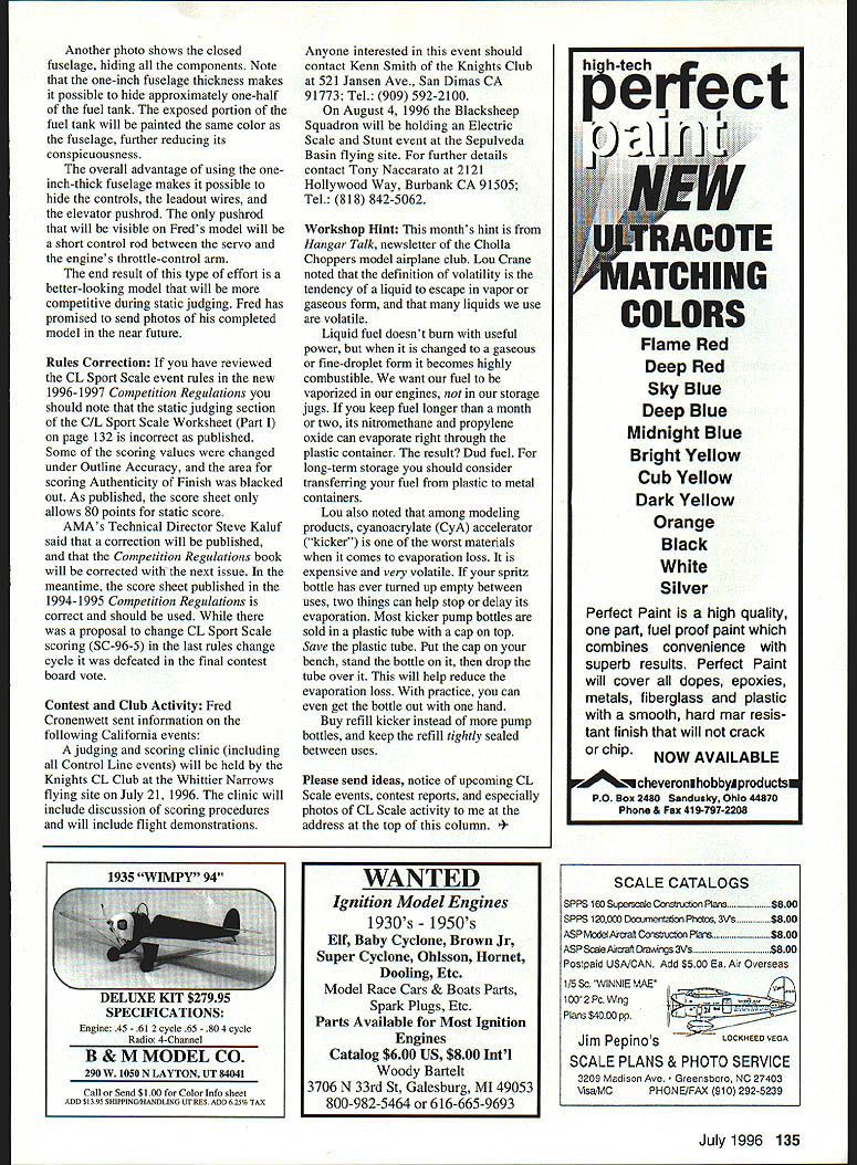 CONTROL LINE SCALE PROFILE SCALE has become major part Control Line Scale activity areas around country Some reasons given its increasing popularity Profile models generally easier build take less time cost less fullbodied models Profile event also being used clubs help interest non-Scale modelers beginners CL Scale activity promote fun aspects Scale modeling Ive talked times about Profile Scale column havent done too much area Profile model construction month Ill talk about new project Canoga Park Californias Fred Cronenwetta great proponent Profile Scale modeling Freds latest project Kawanishi NlK2-J Shiden-Kai full-scale put service Japanese December 1943 Classified fighter airplane powerful fast wellprotected heavily armed airplane span 39 feet 41/2 inches weighed approximately 8800 pounds maximum level speed 369 mph ceiling 35000 feet range approximately 1500 miles Its armament consisted four 20mm cannons 1110 pounds bombs derived Kawanishi NlKl Kyofu seaplane hands Japans aces airplane said equal US Hellcats Corsairs Freds model has span 48 inches weighs approximately four pounds will powered OS 40 Surpass engine throttle control via single-channel electronic system Fred got idea latest project restored fullscale example display Champlin Air Museum Phoenix Arizona model based Koku -Fan three-views photos Bob Bankas Scale Model Research collection major features Freds airplane has taken advantage one-inch-thick Profile fuselage rule As can see photos following components will encased fuselage throttle-control servo servo batteries B on-off switch C dark areas D carbon fiber used strengthen /16-balsa fuselage sides engine fuel-tank mounting areas front end fuselage E will left open nose weight can added flight testing indicates needed coil wire wing will snake through wing connect servo system flying lines Another photo shows simple-but-effective method mounting bellcrank foam wing core wing spars bellcrank mount made good grade least 1/g plywood Hardwood reinforcements top bottom bellcrank platform 3/s-square pine large leading-edge spar also provides good platform mounting landing gear third photo shows construction inboard wingtip slider servo-control wiring will eventually connected insulated flying lines slider adjustable leadout system makes trimming model proper flight attitude much easier 134 Model Aviation t-up profile fuselage Fred Cronenwetts model allows electronic throttle control system hidden Large wing spars foam core provide good foundation simple-but-strong platform belicrank installation Installation slider used flight trimming wiring through wing electronic throttle control Enclosed fuselage permits short pushrod servo engine throttle control hidden Another photo shows closed fuselage hiding components Note one-inch fuselage thickness makes possible hide approximately one-half fuel tank exposed portion fuel tank will painted same color fuselage further reducing its conspicuousness overall advantage using oneinch-thick fuselage makes possible hide controls leadout wires elevator pushrod pushrod will visible Freds model will short control rod between servo engines throttle-control arm end result type effort better-looking model will competitive during static judging Fred has promised send photos completed model near future Rules Correction have reviewed CL Sport Scale event rules new 1996-1997 Competition Regulations should note static judging section C/L Sport Scale Worksheet Part page 132 incorrect published Some scoring values changed under Outline Accuracy area scoring Authenticity Finish blacked out As published score sheet allows 80 points static score AMAs Technical Director Steve Kaluf said correction will published Competition Regulations book will corrected next issue meantime score sheet published 1994-1995 Competition Regulations correct should used proposal change CL Sport Scale scoring SC-96-5 last rules change cycle defeated final contest board vote Contest Club Activity Fred Cronenwett sent information following California events judging scoring clinic including Control Line events will held Knights CL Club Whittier Narrows flying site July 21 1996 clinic will include discussion scoring procedures will include flight demonstrations Anyone interested event should contact Kenn Smith Knights Club 521 Jansen Ave San Dimas CA 91773 Tel 909 592-2100 August 4 1996 Blacksheep Squadron will holding Electric Scale Stunt event Sepulveda Basin flying site further details contact Tony Naccarato 2121 Hollywood Way Burbank CA 91505 Tel 818 842-5062 Workshop Hint months hint Hangar Talk newsletter Cholla Choppers model airplane club Lou Crane noted definition volatility tendency liquid escape vapor gaseous form liquids use volatile Liquid fuel doesnt burn useful power changed gaseous fine-droplet form becomes highly combustible want fuel vaporized engines storage jugs keep fuel longer month two its nitromethane propylene oxide can evaporate right through plastic container result Dud fuel long-term storage should consider transferring fuel plastic metal containers Lou also noted among modeling products cyanoacrylate CyA accelerator kicker worst materials comes evaporation loss expensive very volatile spritz bottle has ever turned up empty between uses two things can help stop delay its evaporation Most kicker pump bottles sold plastic tube cap top Save plastic tube Put cap bench stand bottle drop tube over will help reduce evaporation loss practice can get bottle out hand Buy refill kicker instead pump bottles keep refill tightly sealed between uses Please send ideas notice upcoming CL Scale events contest reports especially photos CL Scale activity address top column ft Vliri Deep Red Sky Blue Deep Blue Midnight Blue Bright Yellow Cub Yellow Dark Yellow Orange Black White Silver Perfect Paint high quality part fuel proof paint combines convenience superb results Perfect Paint will cover dopes epoxies metals fiberglass plastic smooth hard mar resis tant finish will c