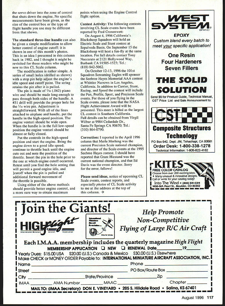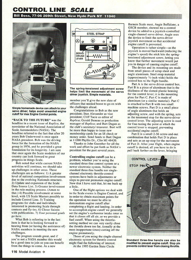 CONTROL LINE SCALE J1 II BACK TO THE FUTURE headline recent issue Replica newsletter National Association Scale Aeromodelers NASA headline referred fact after 20 years Bob Underwood once again NASA president Bob driving force formation NASA group 1976 provided great foundation its longevity am sure once again Scale modelers country can look forward great progress things Scale Bob noted current NASA activities will continue should take up challenges other areas challenges follows 1 greater level national competition involvement due evolving Nationals structure 2 Update expansion Scale Data Source List 3 Greater involvement rule-making process Amen 4 Possible involvement some level US Scale Masters possibly include Control Line 5 Training programs clubs individuals interested promoting Scale through contests fly-ins 6 Closer liaison publications 7 personal goals go What Bob referring last item looking forward hearing having assistance NASA members meeting new challenges program sounds great youre NASA member would good time join can benefit things come As new spring-tensioned adjustment screw helps limit movement servo driver joystick Simple materials member youll give new slate officers needed boost go challenges ahead Congratulations Bob new president Stan Alexander vice president Cliff Tacie editor Replica Gerald Deneau production manager Replica Burt Dugan clubs secretary treasurer Burt will happy issue new membership cards $8 check money order Send funds Burt Dugan 11090 Phyllis Dr Clio MI 48420 Thanks John Guenther work effort put forth NASAs president past several years Controlling engine cutoff can problem whether youre using standard three-line control system newer electronic system Neither standard three-line handle nor singlechannel electronic throttle-control systems have built-in adjustments stops prevent premature engine cutoff Now have said let back up little flight options deal Scale events Engine Control order obtain maximum points operation must able demonstrate engine cutoff after completing flight landing order accomplish engine cutoff generally set engines carburetor intake rotor closes off air provide fuel cutoff using throttlesetting method can very easily close throttle down too far usually inopportune times cutting off engine prematurely using single-channel electronic system throttle control might find following interest 1995 Garden State Circle Burners Scale meet Augie Buffalano GSCB member showed control device added joystick-controlled single-channel servo driver Augie uses device limit servo-driver joystick movement accidental engine cutoff prevented Operation rather simpleas joystick moved backward reducing engines speed stick bits springtensioned adjustment screw letting know further movement would put danger causing engine cutoff device its mounting made small pieces scrap sheet angle aluminum Steel strap material approximately /2-inch wide holds control box flight handle Part servo driver control box Part B piece aluminum thickness slotted-plastic housing control lever mounting plate Part C Part C made aluminum similar material Part C attached Part B two small machine screws Part D small piece angle aluminum holds adjusting screw spring acts tensioned stop servo-driver control lever adjusting screw used fine-tuning point control lever stopped preventing accidental engine cutoff Part E small 2-56 screw-and-nut combination holds Part D place acts up-stop movement Part D After flight engine cutoff desired have pull back farther lever bringing 116 Model AViation EEL STRAP 0 SERVO DRIVER LEVER CD E Simple homemade device can attach servo driver helps avoid unwanted engine cutoff max Engine Control points Standard three-line handle can also modified prevent engine cutoff Stop pin prevents control lever closing throttle servo driver zone control shuts down engine No specific measurements have given size control box type flight handle use may different shown standard three-line handle can also given simple modification allow better control engine cutoff shown months photos idea presented column back 1982 thought might revisited readers might new CL Scale column modification rather simple series small holes drilled shown stop pin help adjust engines idle speed cutoff point string retains pin after pulled pin made 1/i6 062 piano wire should made long enough pass through both sides handle #51 drill will provide proper hole /16 wire pin Adjustment straightforward lines attached airplane handle put handle high-speed position engine venturi should wide open handle full low-speed position engine venturi should almost fully closed Put controls high-speed position start engine Bring engine down good idle speed continue throttle back until engine cuts out note position throttle Insert pin hole prior engine cutoff occurred Retest until find hole setting will permit good engine idle ]cutoff pin pulled additional forward movement throttle possible Using either above methods should provide better engine control sure way obtain maximum points using Engine Control flight option Contest Activity following contests involving CL Scale events have reported Fred Cronenwett August 4 1996 Californias Blacksheep Squadron will hold Electric Scale Stunt contest Sepulveda Basin September 15 Blacksheep will host fun-fly same location full details contact Tony Naccarato 2121 Hollywood Way Burbank CA 9 1505-1523 Tel 818 842-5062 October 12-13 1996 101st Squadron Screaming Eagles will sponsor Seebree Hayes Memorial AAA contest Whittier Narrows Los Angeles California addition Carrier Stunt Racing Speed contest will include Fun Profile Sport Precision Scale events flying Scale events please note NASA Flight Achievement Award will presented meet billed largest CL contest Southern California Full details can obtained Virgil Wilbur 9984 Cedardale Dr Santa Fe Springs CA 90670 Tel 310 864-0790 Correction reported April 1996 column Merle Morhing current Precision Scale national champion director Scale 