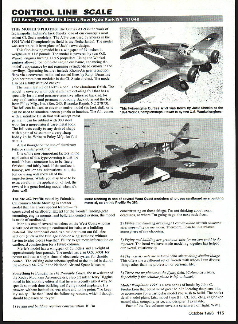CONTROL LINE SCALE 11111 THIS MONTHS PHOTOS Curtiss AT-9 work Indianapolis Indianas Jack Sheeks country s ardent CL Scale modelers AT-9 used Sheeks 1994 World Championships held Netherlands model scratch-built plans Jacks own design fine-looking model has wingspan 69 inches weighs-in 116 pounds model powered two 05 Wankel engines turning 11 x 5 propellers Using Wankel engines allowed complete engine enclosure enhancing models appearance requiring cylinder-head cutouts cowlings Operating features include Rhom-Air gear retraction flaps via convened radio coated lines Ralph Burnstine another prominent modeler CL Scale circles model also has fully detailed cockpit main feature Jacks model aluminum finish model covered 002 aluminum detailing foil has specially formulated pressure-sensitive adhesive backing easy application permanent bonding Jack obtained foil Foley Mfg Inc Box 245 Roanoke Rapids NC 27870 foil can used cover entire model Jack did can used simulate access panels hatches foil comes satinlike finish will accept paints can rubbed 000 steel wool more-natural hare-metal look foil cuts easily desired shape pair scissors very sharp hobby knife Write Foley Mfg full details last thought use aluminum foils similar products must-important factors application type covering models basic structure has finely finished fairly hard surface bumpy soft has indentations foil covering will show imperfections may have extra careful application foil reward great-looking model its done well 262 Profile model Palmdale Californias Merle Morhing another model has very special featureits constructed cardboard Except wooden landing-gear mounting engine mounts bellcrank control system model made cardboard Merle several modelers West Coast has substituted extra-strength cardboard balsa building material cardboard enables builder cut out full-size sections such fuselage sides wing sections having glue pieces together Ill try get information cardboard construction future column Merles model has wingspan 53 inches weight approximately four pounds model has 05 4OSF power uses single-channel electronic system throttle control striking color scheme applied model restored 262 National Air Space Museum Something Ponder Probable Cause newsletter Rocky Mountain Aeromodelers club president Jerry Higgins noted monthly editorial recently asked spends much time building flying model airplanes answer hesitation short point keep sanity listed following reasons thought should passed Flying building requires concentration Fm concentrating things Im thinking about work deadlines Im going get next buck 2 Flying building things can alone someone else depending mood Therefore can relaxed atmosphere choosing 3 Flying building great activities son together bond have made modeling together has helped overall relationship 4 The activity puts touch others doing similar things offers different set friends can discuss things other profession personal life 5 There no phones theflyingfield Columnists Note Especially cellular phone left home Model Warplanes 1996 new series books John C Fredricksen could great help locating plans kits accessories particular model wish build books detail model plans kits model type FF CL RC etc engine motor size company price designer available five volumes covers certain era flight WW October1996 115 twin-engine Curtiss AT-9 flown Jack Sheeks 1994 World Championships Power two OS Wankel engines Merle Morhing several West Coast modelers uses cardboard building material Profile 262 1914-1918 Golden Age 1919-1939 WW II Axis 1939-1945 WW II Allied 1939-1945 Jet Age 1946-1996 books list models country full-scale produced volume has listing addresses plans kits accessories might obtained full details new books Write John C Fredriksen 461 Loring Ave Salem MA 01970 Workshop Safety Hint Both following items found newsletter Indy Sportliners CL model airplane club According Norman Boyle handy sanding device can found art supply stationery stores stock drafting supplies item small wooden paddle thats approximately 7 inches long 1 inches wide has approximately 12 sheets medium-grade sandpaper attached sandpaper sheets stapled paddle end tack-glued together other end sandpaper paddle generally used draftsman artists sharpening lead drafting pencils Norman suggests paddle makes excellent sanding tool getting hard-to-reach places youre sanding models top sheet sandpaper gets dull just peel off safety tip Bill Heinson Carbon fiber extremely strong light material uses modeling world should however handled care Carbon-fiber slivers extremely sharp very difficult remove skin may possible remove smallest ones best anything produces dust slivers using carbon fiber Wear gloves handling cut piece shape encapsulate cyanoacrylate CyA soon possible Please send ideas notice upcoming CL Scale events contest reports especially photos CL Scale activity address top column Model Aviation orthwest GIANT SCALE KITS 90 P47 Thunderbolt Power e4Ew4 4e ad6 9.d ARE QUICK S EASY TO ASSEMBLE Foam sheeted wings & fuselage sheeting fiberglass cowling & hardware included Size-Model-Price 85 Super Corsair $34995 88 Hawker Seafury $34995 90 P47-0 Thunderbolt $34995 90 P47-B Razorback $34995 82 P510 Mustang. $28995 85 Fairchild PT-19 95 85 F4U Corsair 95 65 F2G Corsair 95 Thomoson Troohv Racers 80 GeeBee Model Z 95 80 Keth Riben R-4 95 83 Laird Turner. $39995 70 Laird Super Solution $39995 85 Gee Bee Model Y 95 IPlus 52495 Shipping & Handling lots Foam Bond ContactCemenl qts 0 video Catalog also avaIlable 5 can apply video cost purchase kit Fiberglass Parts available Lanier RC Inc Contact us fax 770-532-2163 information catalog send self-addressed stamped envelope P 0 Box 458 Oakwood GA 30566 NORTHWEST HOBBY TECHNOLOGIES 322 E St SE rn WA 98002 939-0884