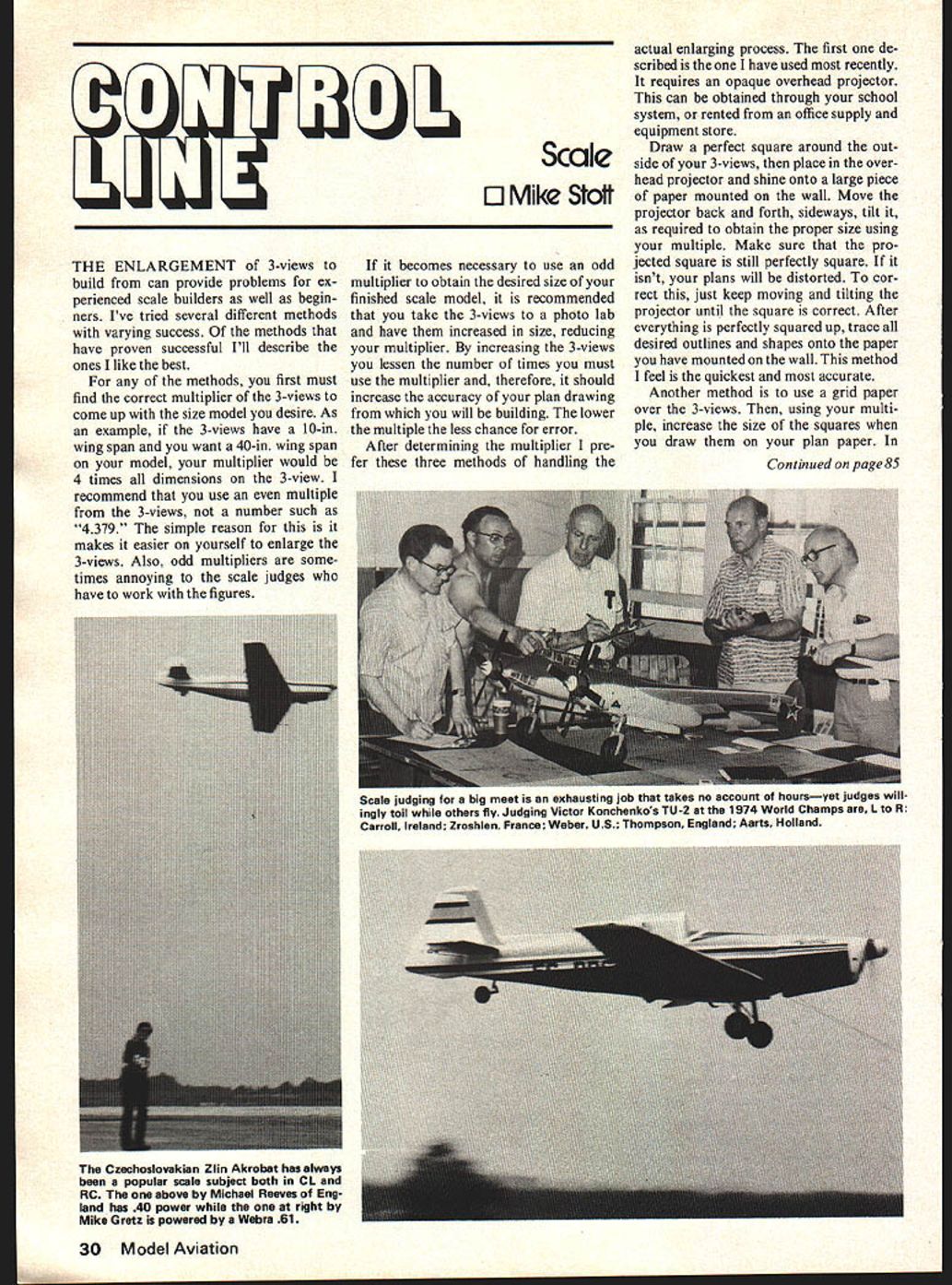 I Scale 0 Mike Stott THE ENLARGEMENT 3-views build can provide problems ex perienced scale builders well begin ners Ive tried several different methods varying success methods have proven successful Ill describe ones like best methods first must find correct multiplier 3-views come up size model desire As example 3-views have 10-in wing span want 40-in wing span model multiplier would 4 times dimensions 3-view recommend use multiple 3-views number such 4379 simple reason makes easier yourself enlarge 3-views Also odd multipliers some times annoying scale judges have work figures becones necessary use odd multiplier obtain desired size finished scale model recommended take 3-views photo lab have increased size reducing multiplier increasing 3-views lessen number times must use multiplier therefore should increase accuracy plan drawing will building lower multiple less chance error After determining multiplier pre fer three methods handling actual enlarging process first de scribed have used recently requires opaque overhead projector can obtained through school system rented office supply equipment store Draw perfect square around out side 3-views place over head projector shine onto large piece paper mounted wall Move projector back forth sideways tilt required obtain proper size using multiple Make sure pro jected square still perfectly square isnt plans will distorted cor rect just keep moving tilting projector until square correct After everything perfectly squared up trace desired outlines shapes onto paper have mounted wall method feel quickest accurate Another method use grid paper over 3-views using multi ple increase size squares draw plan paper Continued page 85 30 Model Aviation Scale judging big meet exhausting job takes no account hoursyet judges will ingly toil others fly Judging Victor Konchenkos TU-2 1974 World Champs L R Carroll Ireland Zroshlen France Weber US Thompson England Aerts Holland Czechoslovakian Zlin Akrobat has always popular scale subject both CL RC above Michael Reeves Eng land has 40 power right Mike Gretz powered Webra 61 PRO DUCTS NC SVILLE ROAD OW GROVE PA 19090 6593900 Weve Got Lot SHOUT ABOUT Patented patented patented just about products pa tented Thats because theres someSUPERSTAR OF STARTERS thing unique about SomeSales zooming past 100000 starter thing better Take products thats turned whole world Has instance Better yet go dealer higher torque & RPMs heavy duty buy long life motor instant-on strip switch safety hand guard 2-year guarantee CHARGER FOR SUPER/GEL & OTHERS Ideal teammate Super-Gel battery Can also used wet cell batteries UL Listed plugs dinary house current Fully charges battery 12 hours 500 ma output overheating Bob Wischer Rt 1 S-221 Lapham Peak Rd Delafield WI 53018 CL Scale/Stott continued page 30 other words have h-in grid paper assuming multiple 4 squares plan paper would 1 in size multiple 5 squares would drawn 1 transfer drawing treat square individual picture copy lines curves grid squares squares drawing paper Take time sure have everything down correctly lines crossing proper places third method again need know multiplier also need pair dividers Dividers measuring instruments used frequently draftsmen engineers can obtained local office supply store method first need draw center thrust-line plan paper will work off line fuse lage side view Picking various points pref erably cross sections former loca tions 3-views position dividers point spinner back plate other point first former cross section 3-views changing setting dividers go thrust-line drawn plan paper still assuming multiple 4 measure out four segments space will location first former cross section picked out 3-view Height width length items 3-views can done manner feel method least accurate difficult three have de scribed Mike Stoti 118 F Wheeler St North Mankato MN 56001 RC Soaring/Pruss continued page 22 grees plus wind light Neil esti mates never over 1500 feet en tire flight Further details about Level V show contest wins must have three out six contests 20 people Soarcraft/Windspiel Kestral 19 plane has flown competitively three years modification kit own gap-type spoiler system Neil recorded 11 contests order get wins points required six just happened LSF Tourna ment last year took second place out 124 two-hour thermal flight grabbed opportunities Neil tells out local field sport flying weekend launched wifes Centurion II check out before turning loose grabbed bubble went 15-20 minutes sug gested try two-hour thermal flight rather bring down fly continued working lift Neil goes about hour final ap proach landing area about 20 feet Flashing Wing Tail Lights Adding excite ment realism flying clever item also can add scale points competition Operates low 45v uses IC four LEDs 2 red 1 green 1 amber draws little current Fully wired tested Price $15 Vein Zundel 4956 Tiemann Ave St Louis MO 63123 product review product review product review October 1977 85 product review product review product review