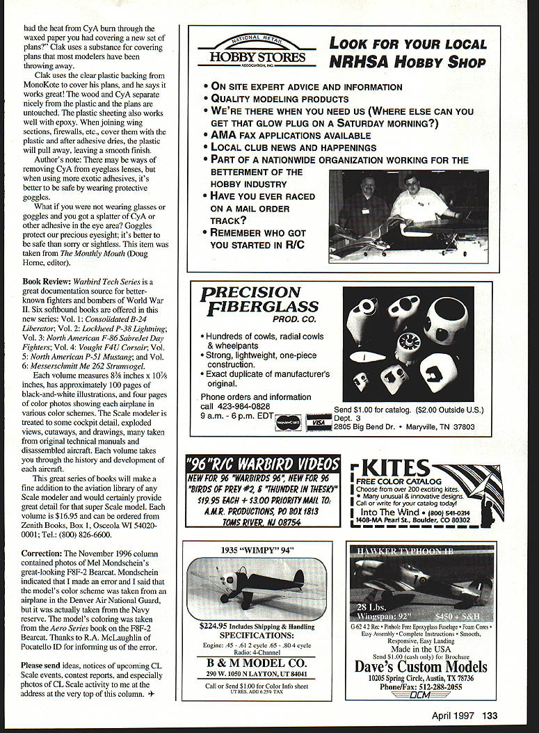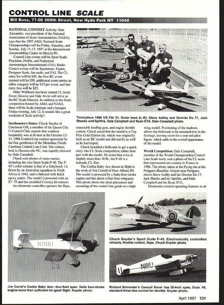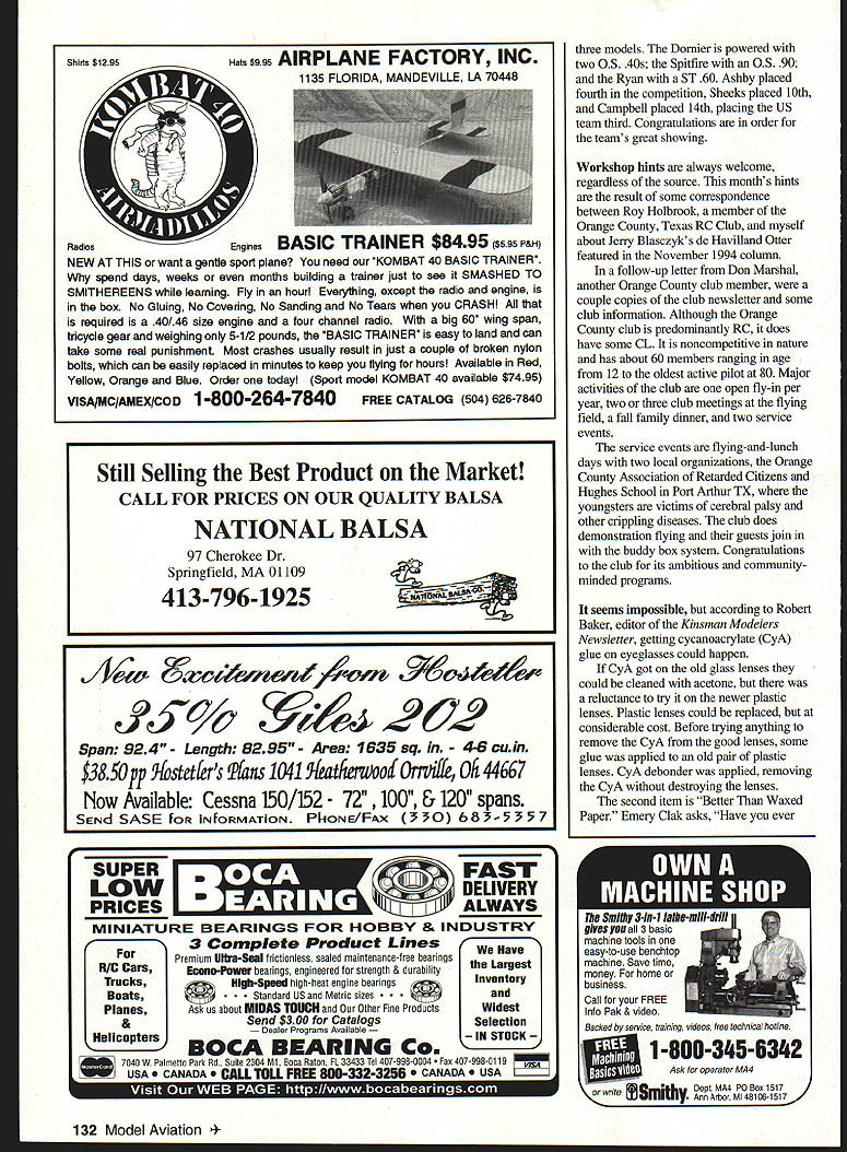 CONTROL LINE SCALE EfllE NATIONAL CONTEST Activity Stan Alexander vice president National Association Scale Aeromodelers NASA says 1997 AMA National Scale Championships will Friday Saturday Sunday July 11-13 1997 International Aeromodeling Center Muncie IN Control Line events will Sport Scale Precision Profile Federation Aeronautique Intemationale FM Radio Control events will Sportsman Expert Designer Scale fun scale FAI CL entry fee will $45 first RC event entered will $50 additional event entries either category will $15 per event late entry fees will $25 Mike Welshans has named CL Scale Event Director Dale Arvin will serve RC Scale Director addition Scale competition hosted AMA NASA will Scale seminars banquet Friday evening July 12 sounds like great weekend Scale activity Southeastern States Chuck Snyder Cincinnati OH member Queen City U-Control Club reports southern hospitality its best October 1213 1996 Control Line contest sponsored fine gentlemen Metrolina North Carolina Control Line Club contest held Huntersville NC capably directed Dale Campbell Chuck sent photos some entries including own Sport Scale P-40 P 40s color scheme Kittyhawk lA flown Australian squadron North Africa 1942 finished K&B epoxy paints model powered ST 75 has modified Century Jet retracts An electronic controller operates flaps retractable landing gear engine throttle control Chuck noted model Top Flite Gold Edition kit originally built RC model did fly well hoped Chuck installed bellcrank get quick entry CL Scale competition rather part model noted slightly 10 lb P-40 fantastic CL flier Corbin Baby Ace shown flight work Jim Correll New Albany IN model powered Saito four-stroke engine has about four-foot wingspan photo shows ideal placement mounting control line guide highwing model Positioning leadouts allows bellcrank mounted low fuselage leaving room seat pilot figure adds overall appearance model World Competition Dale Campbell member World Championship Control Line Scale team sent photo CL team represented country France 1996 photo taken flying site Periguex-Bassillac Airport near Periguex shows Steve Ashby Dornier 17 Jack Sheeks Spitfire Dale Campbell Ryan STA Electronics control operating features April1997 131 Third-place 1996 US FAI CL Scale team L-R Steve Ashby Dornier 17 Jack Sheeks Spitfire Dale Campbell Ryan STA Dale Campbell photo Chuck Snyders Sport Scale P-40 Electronically controlled retracts throttle control flaps Chuck Snyder photo Jim Correls Corbin Baby Acefour-foot span Saito four-stroke engine sufficient great flight Snyder photo Richard Schneiders Cassutt Racer has 30-inch span Enya 45 standard three-line control throttle Snyder photo Still Selling Best Product Market CALL FOR PRICES ON OUR QUALITY BALSA NATIONAL BALSA 97 Cherokee Dr Springfield MA 01109 413-796-1925 IO94ALJ ii three models Dornier powered two OS 40s Spitfire OS 90 Ryan ST 60 Ashby placed fourth competition Sheeks placed 10th Campbell placed 14th placing US team third Congratulations order teams great showing Workshop hints always welcome regardless source months hints result some correspondence between Roy Holbrook member Orange County Texas RC Club myself about Jerry Blasczyks de Havilland Otter featured November 1994 column follow-up letter Don Marshal another Orange County club member couple copies club newsletter some club information Although Orange County club predominantly RC does have some CL noncompetitive nature has about 60 members ranging age 12 oldest active pilot 80 Major activities club open fly-in per year two three club meetings flying field fall family dinner two service events service events flying-and-lunch days two local organizations Orange County Association Retarded Citizens Hughes School Port Arthur TX youngsters victims cerebral palsy other crippling diseases club does demonstration flying guests join buddy box system Congratulations club its ambitious communityminded programs seems impossible according Robert Baker editor Kinsman Modelers Newsletter getting cycanoacrylate CyA glue eyeglasses could happen CyA got old glass lenses could cleaned acetone reluctance try newer plastic lenses Plastic lenses could replaced considerable cost Before trying anything remove CyA good lenses some glue applied old palr plastic lenses CyA debonder applied removing CyA destroying lenses second item Better Waxed Paper Emery Clak asks Have ever 3 basic tools -to-use benchtop machine Save tine money home business Call FREE Info Pak & video Backed service training videos free technical hotline 1 -8OO-3I5-O31i2 Ask 0 opeao MA4 write ma 4hiu Dep MA4 P0 Box 57 ujulflluiySo M 480657 132 Model Aviation $995 AIRPLANE FACTORY INC 1135 FLORIDA MANDEVILLE LA 70448 Radios Engines BASIC TRAINER $8495 $595 P&H NEW AT THIS want gentle sport plane need KOMBAT 40 BASIC TRAiNER spend days weeks months building trainer just see SMASHED TO SMITHEREENS learning Fly hour Everything except radio engine box No Gluing No Covering No Sanding No Tears CRASH required 40/46 size engine four channel radio big 60 wing span tricycle gear weighing 5-1/2 pounds BASIC TRAINER easy land can take some real punishment Most crashes usually result just couple broken nylon bolts can easily replaced minutes keep flying hours Available Red Yellow Orange Blue Order today Sport model KOMBAT 40 available $74g5 VISA/MC/AMEXICOD 1-800-264-7840 FREE CATALOG 504 626-7840 Span 924- Length 8295- Area 1635 sq 4-6 cuin $3850 pp 9fostetfers LYzns 1041 iffeatfierwoot Omijife Oh 44667 Now Available Cessna 150/152 72 100 & 120 spans SENd SASE foi INfORMATION P1-lONE/FAX 330 683-5357 SUPER r~FAST LOW IDELIVERY PRICESALWAYS MINIATURE BEARINGS FOR HOBBY & INDUSTRY Complete Product LinesWe Have R/C CarsPremium UlbaSeal frictionless sealed maintenance-free bearingsthe rgest EeenoPowei bearings engineered strength & durabilityInventory High-Speed high-heat engine bearings Boats ndard US Metric sizes es us about MIDAS TOUCH Other Fine Products Widest &Send $300 CatalogsSe